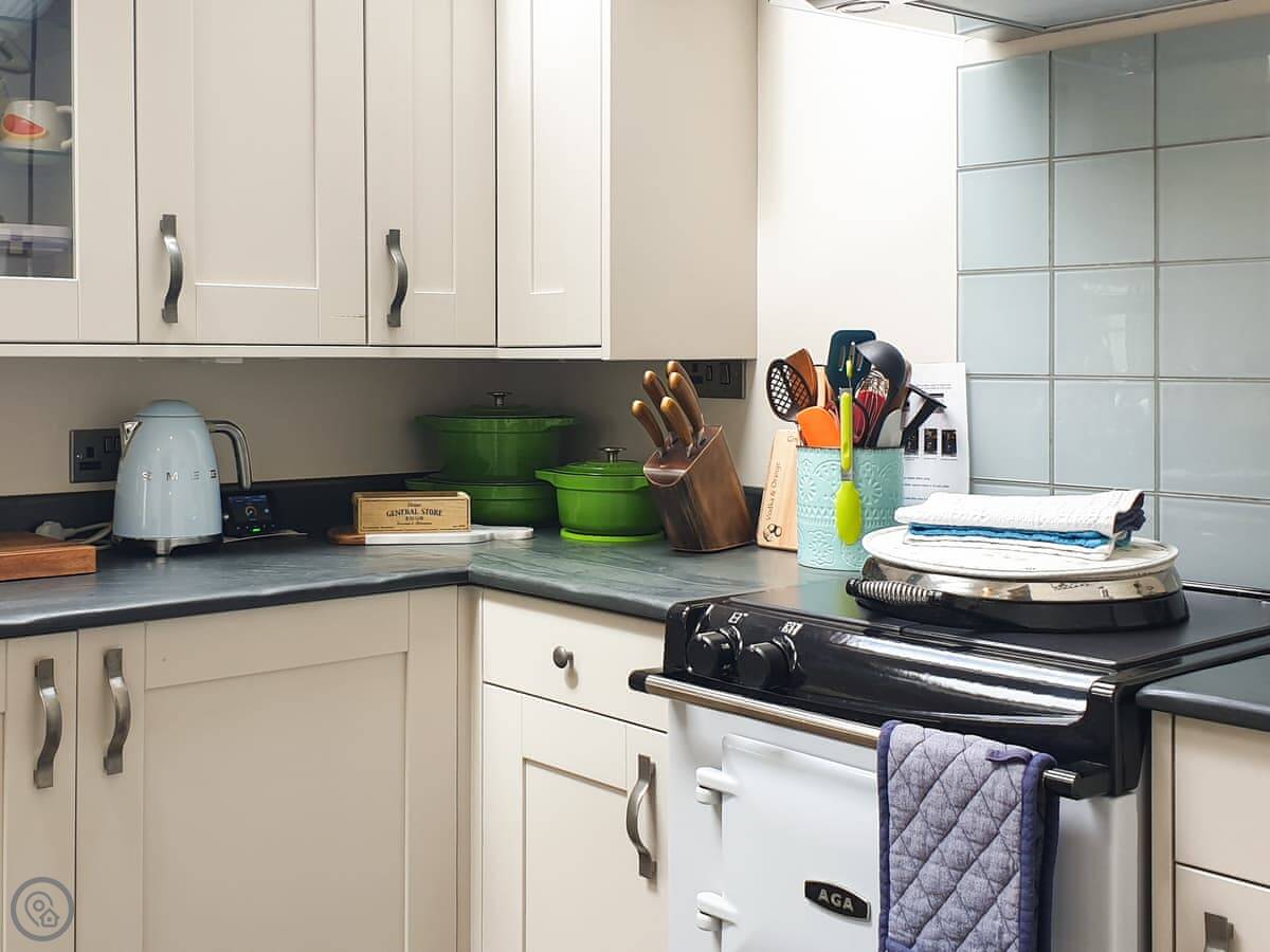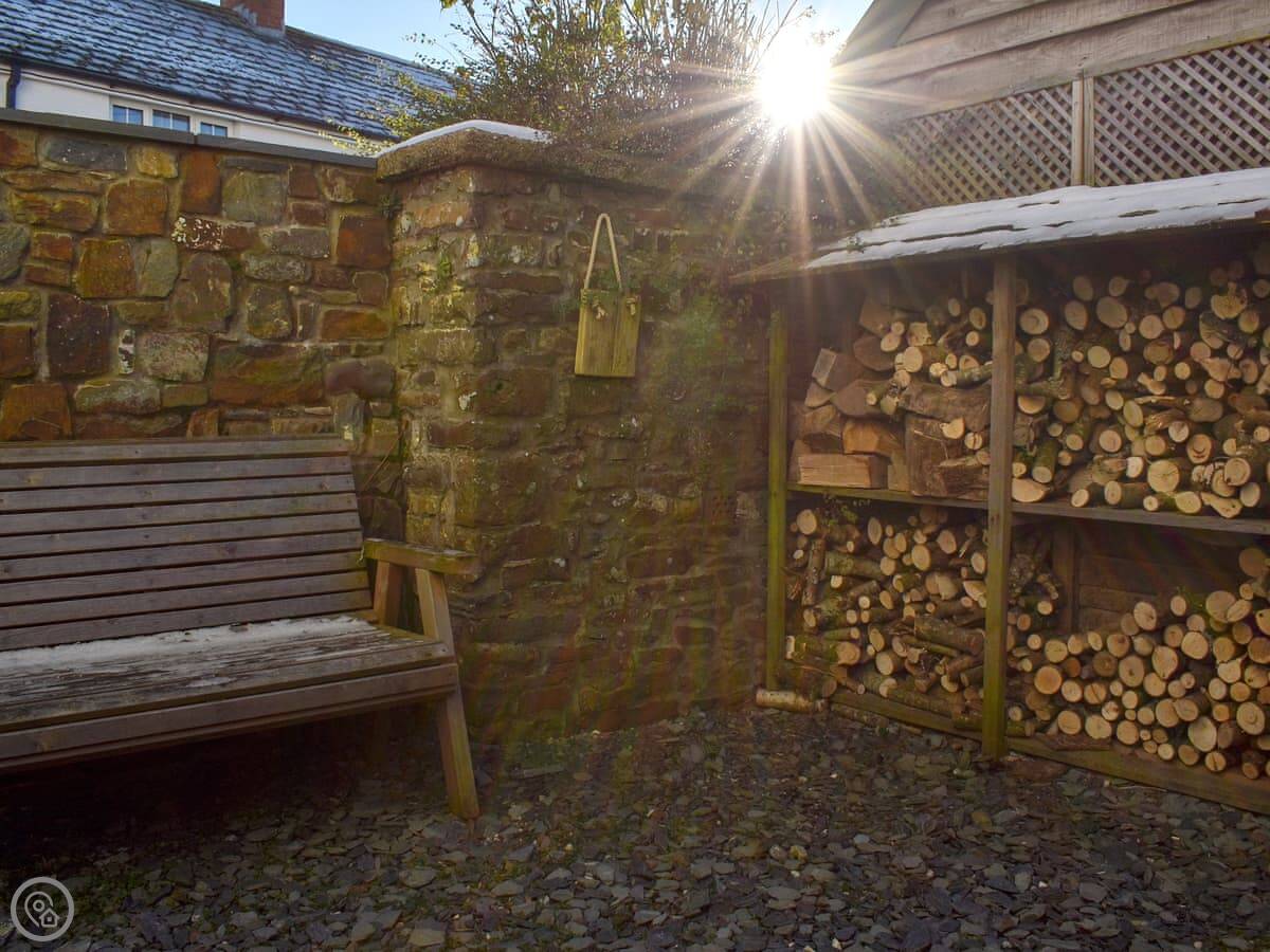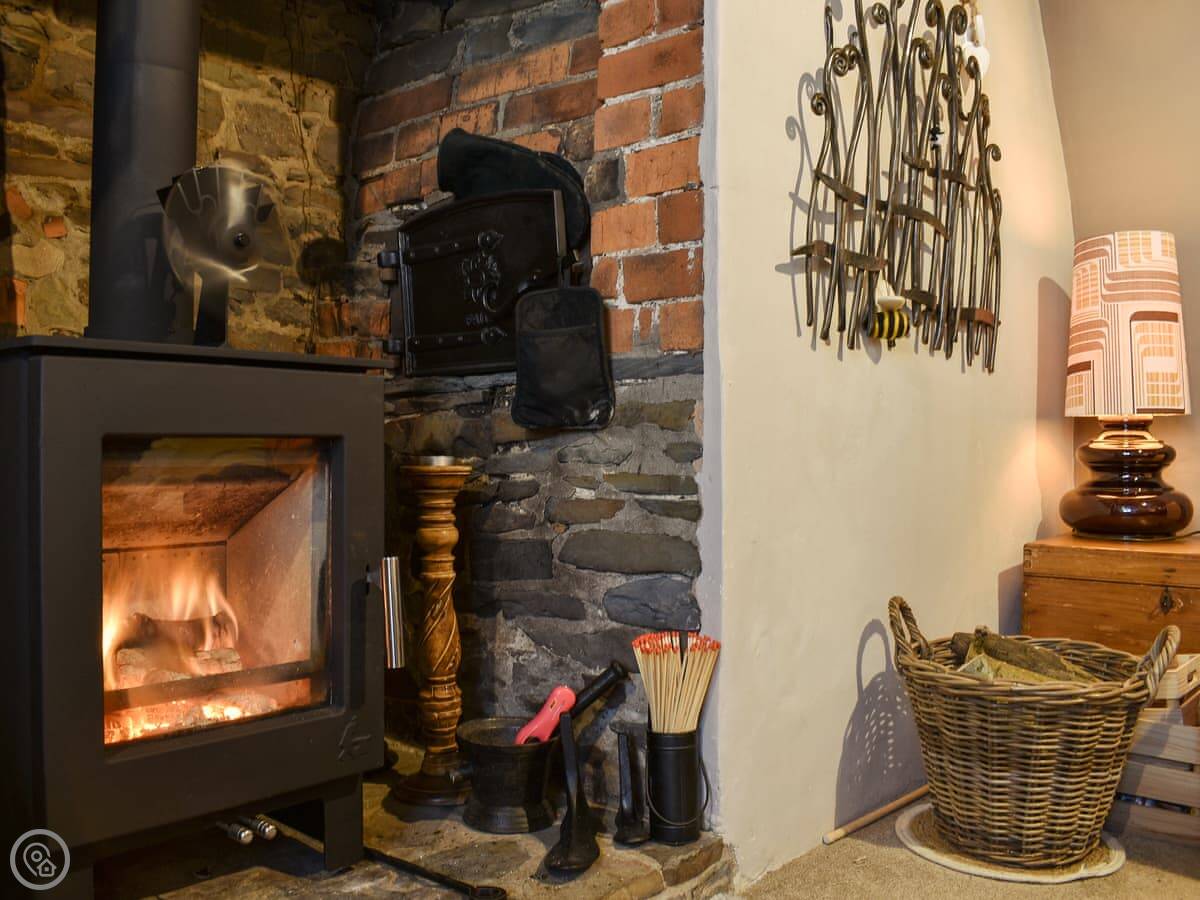 The main room is the living room. It has a wood burner, which works well. The dining table is in the hallway, which has flagstone floors. The kitchen has what you'd need. Upstairs are the two bedrooms and the bathroom. Out the back there's an enclosed courtyard with seating and a barbecue. There's a cold water tap out there with a shower head on it, which is handy for washing sand off dogs or boots.