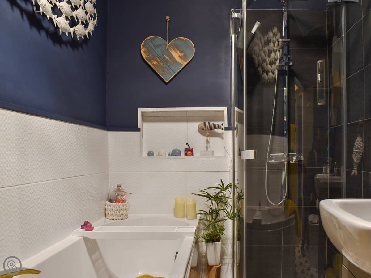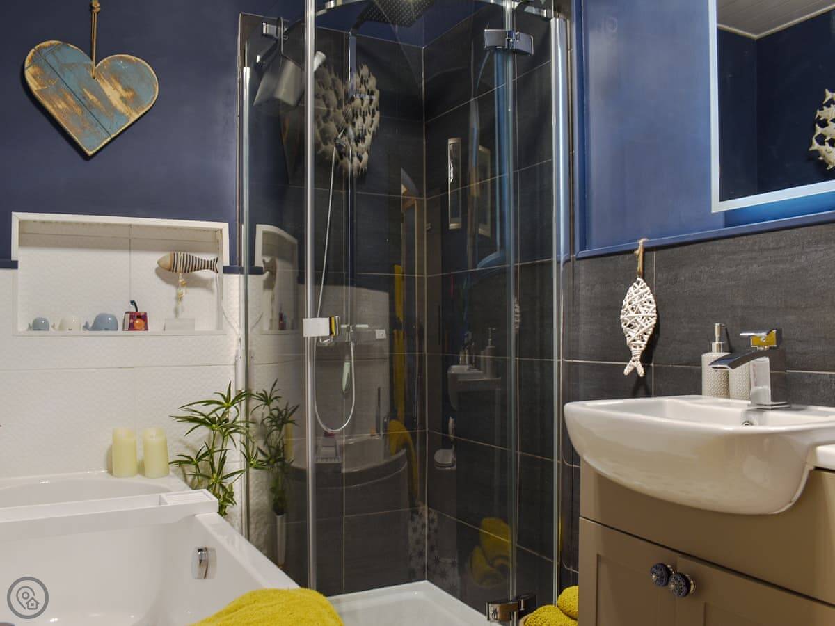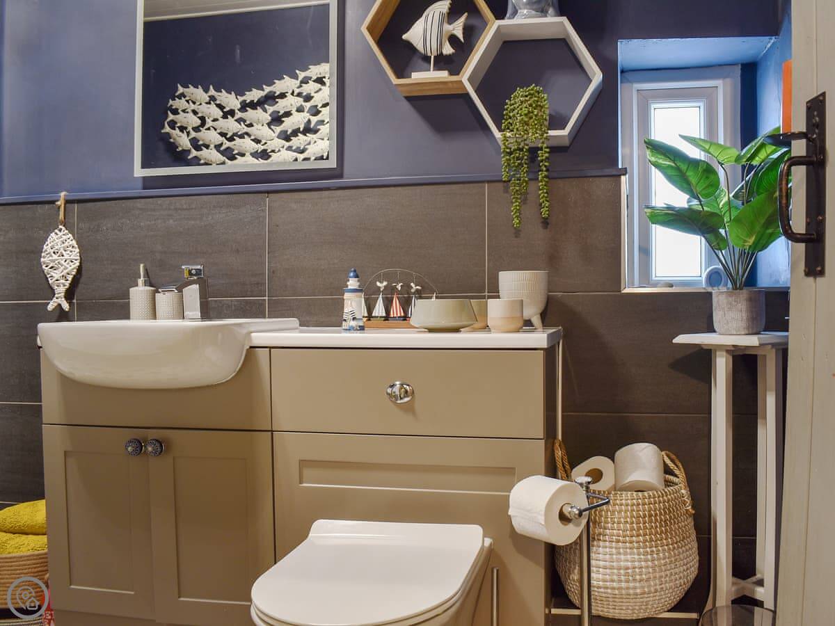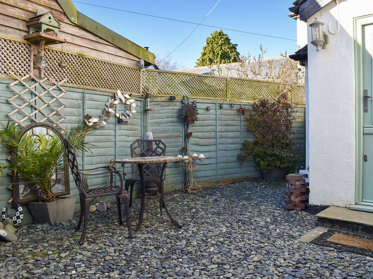 The main room is the living room. It has a wood burner, which works well. The dining table is in the hallway, which has flagstone floors. The kitchen has what you'd need. Upstairs are the two bedrooms and the bathroom. Out the back there's an enclosed courtyard with seating and a barbecue. There's a cold water tap out there with a shower head on it, which is handy for washing sand off dogs or boots.