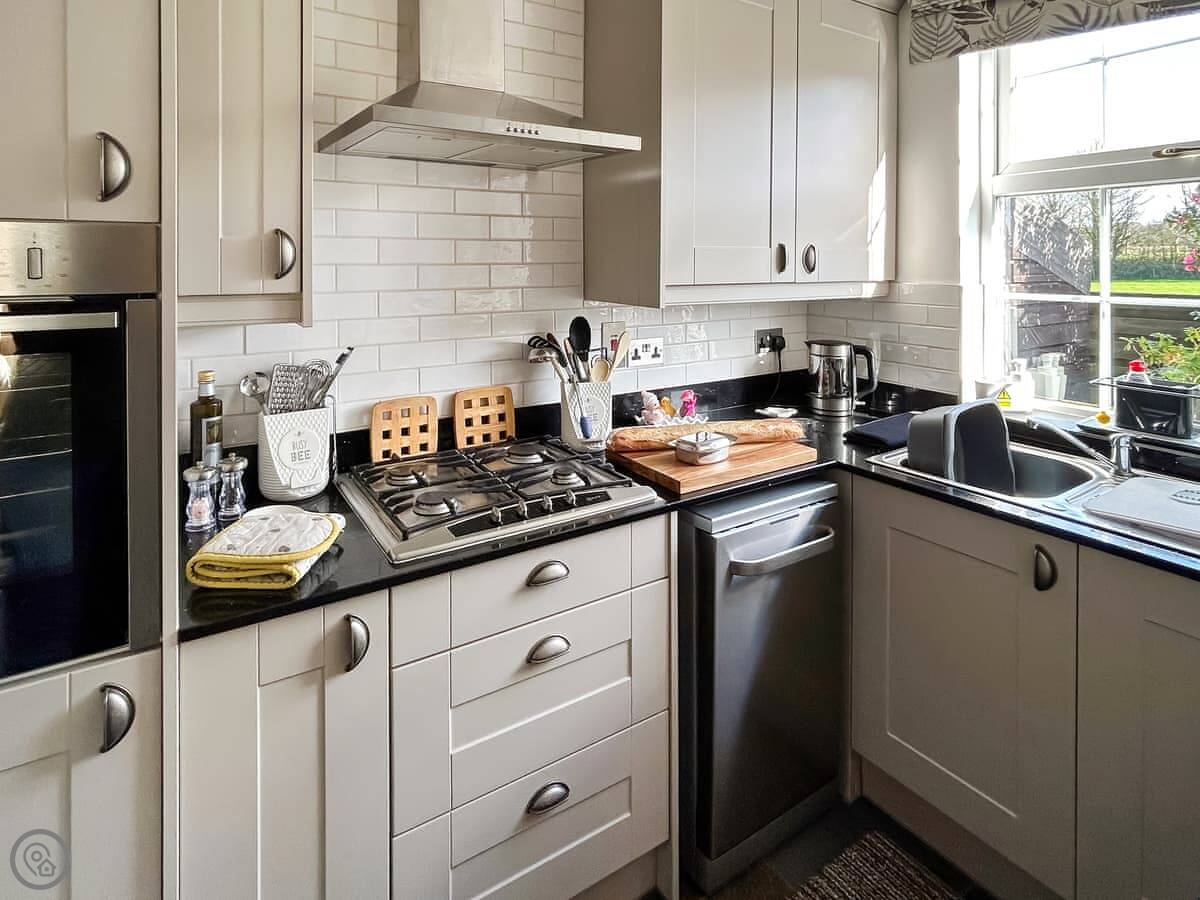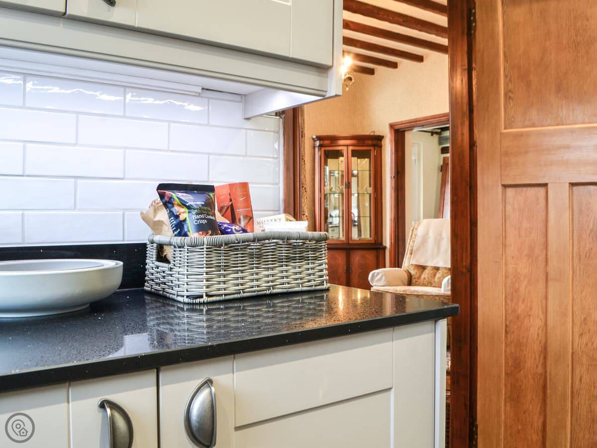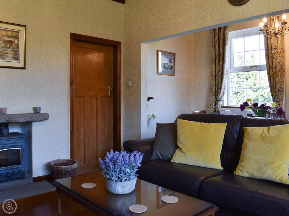 The main living room is cosy, with a wood burner. It's got a Smart TV. You'll find the kitchen through there. It's got a dishwasher and washing machine. There's a big conservatory across the courtyard, which is a decent extra room.