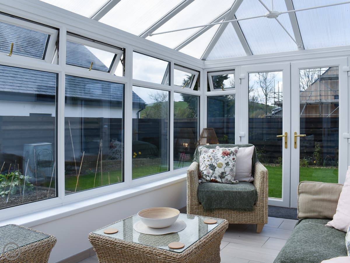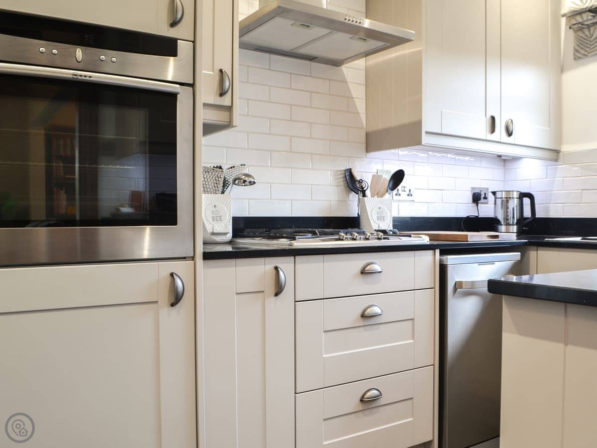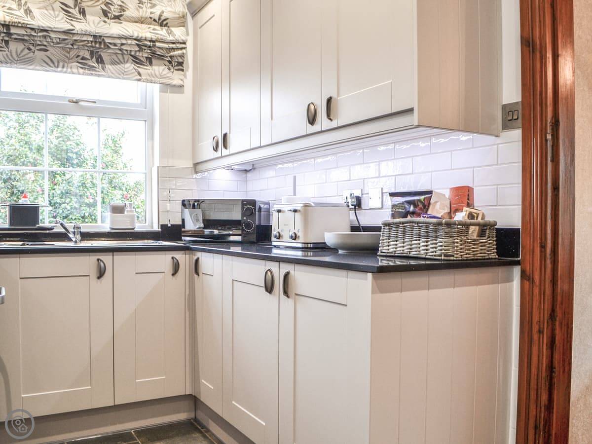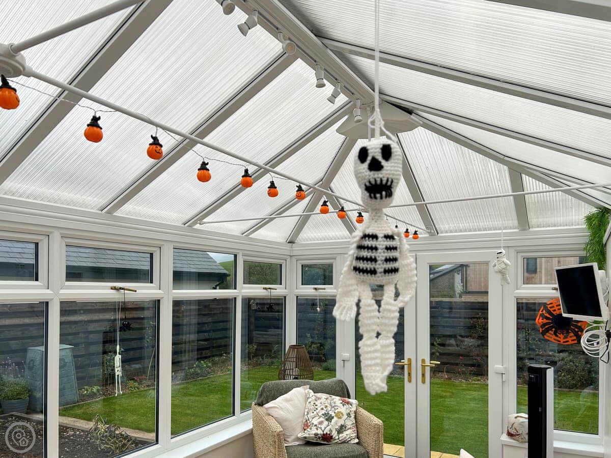 The main living room is cosy, with a wood burner. It's got a Smart TV. You'll find the kitchen through there. It's got a dishwasher and washing machine. There's a big conservatory across the courtyard, which is a decent extra room.