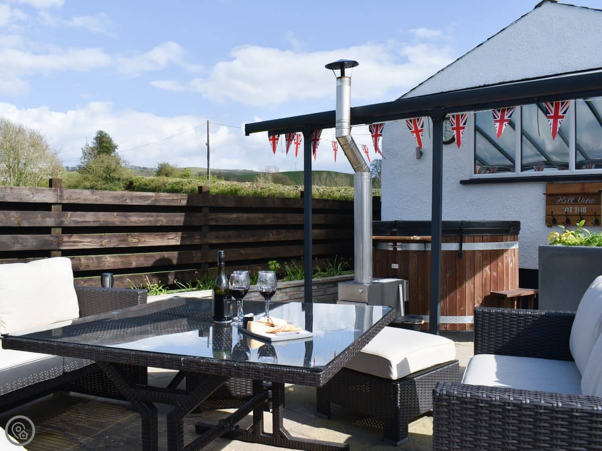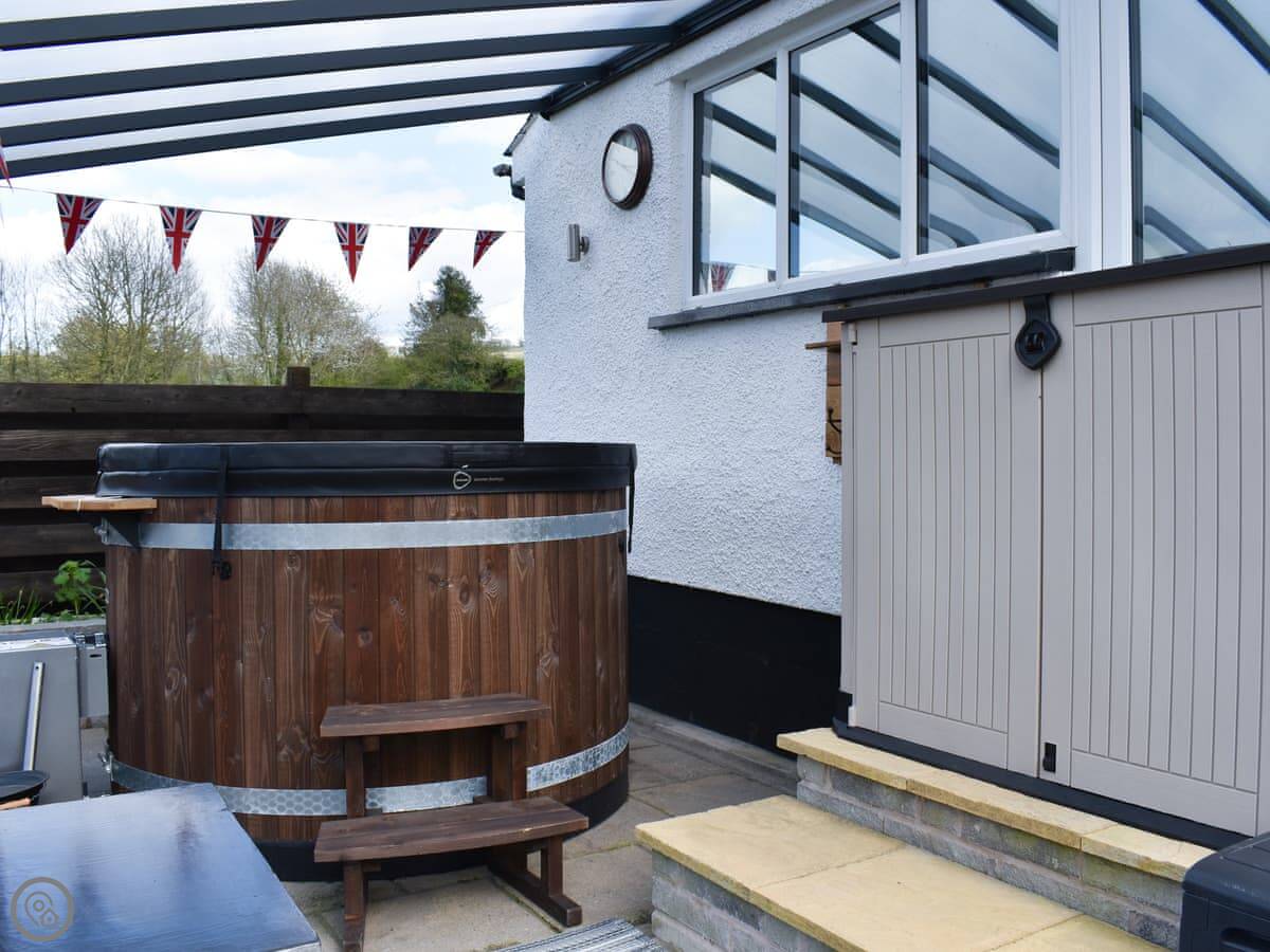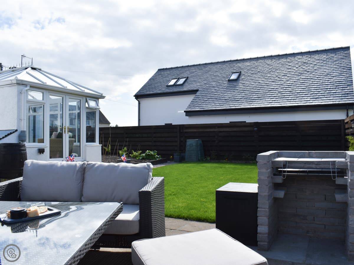 The garden is out the back. It's got a lawn, a patio, and a table and chairs. There's a barbecue and a wood-fired hot tub out there.