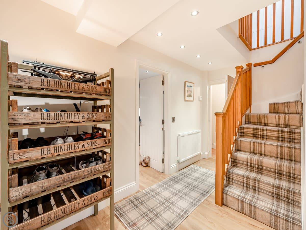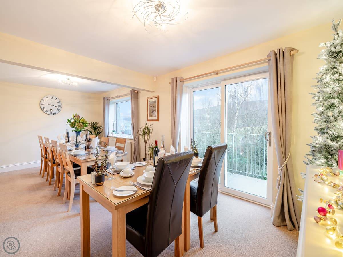 Externally there are three bedrooms in the undercroft, all enjoying beautiful garden views. On the ground floor is a welcoming living room with open views across the beautiful garden and Dales and a door leading to wrap-around terrace. With comfortable sofas nestling around a log burning stove, it’s the perfect place to gather to enjoy good company. The attractive kitchen is well equipped to cater for your group. A large granite island and shaker style kitchen, leading off to a breakfast/dining area, you could imagine gathering here while the designated chef rustles up a hearty supper. There is a separate dining room with French doors leading out onto the terrace set with tables and chairs and rattan furniture.