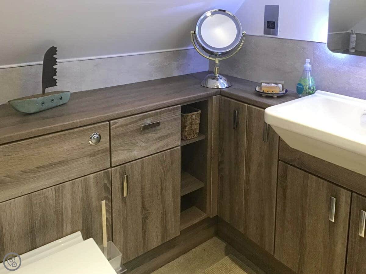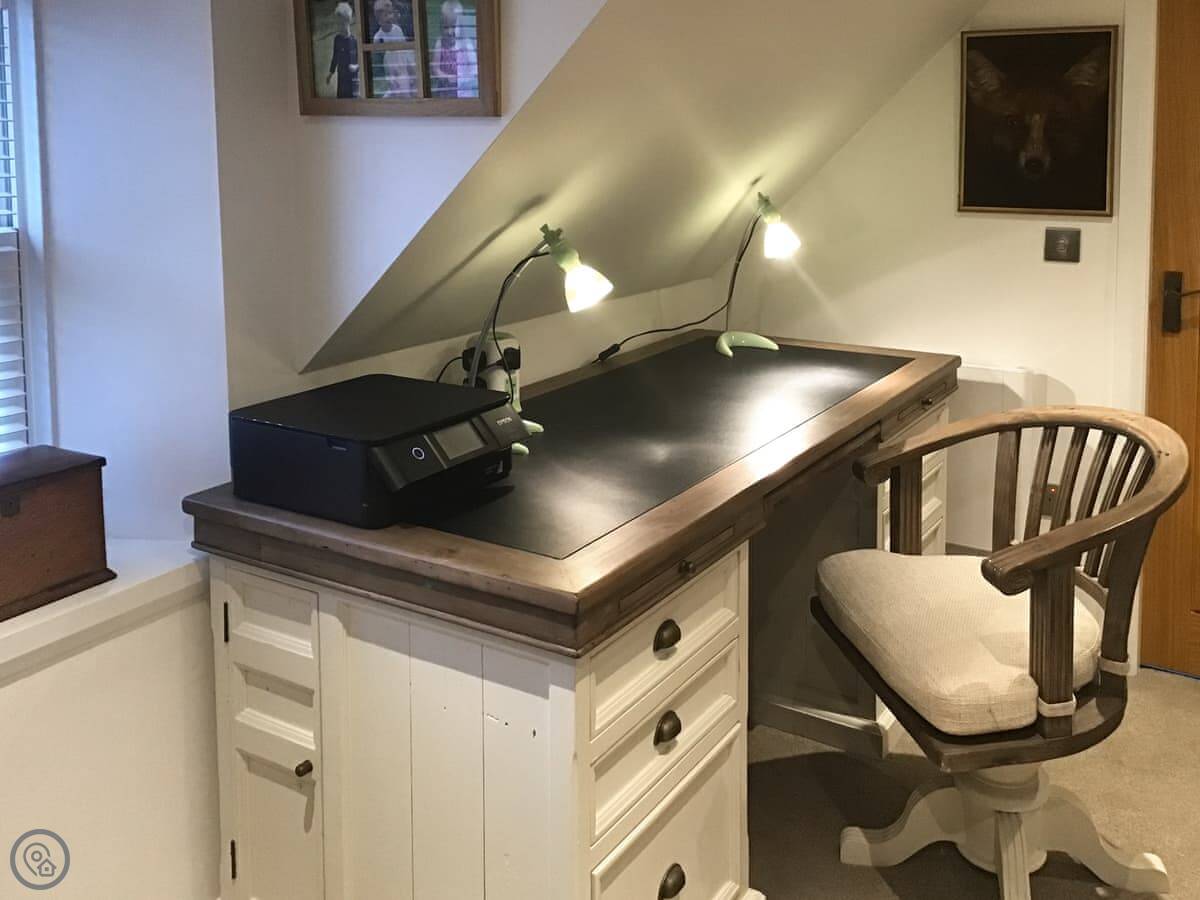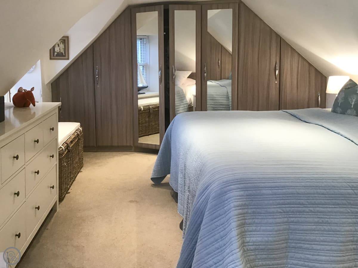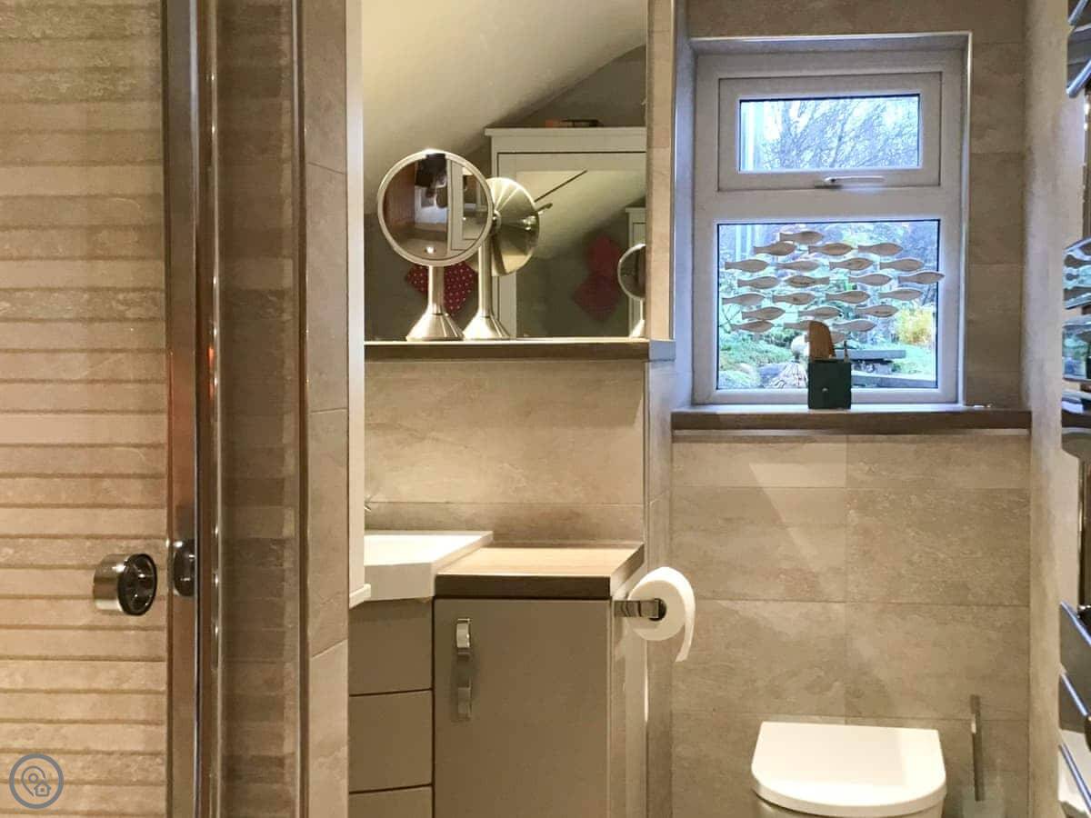 The stairs have a glass balustrade with a handmade handrail which takes you to a landing with a desk for those who wish to catch up on work and the bedroom is to your right with the toilet to your left, A super kingsize bed, two windows with views over the garden and over towards the loch, again, lots of wardrobe space. Nursery Croft is a warming retreat that I am sure you would want to revisit and remember the memories you made.
