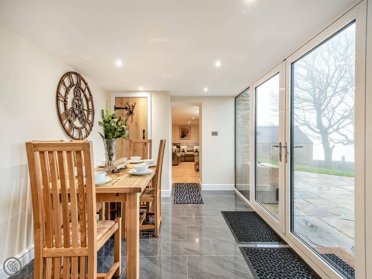 The living room is through the front door. It opens into the kitchen and dining area. The kitchen has big patio doors and windows, so you get a lot of light and the views are across the countryside. It has what you need to cook.