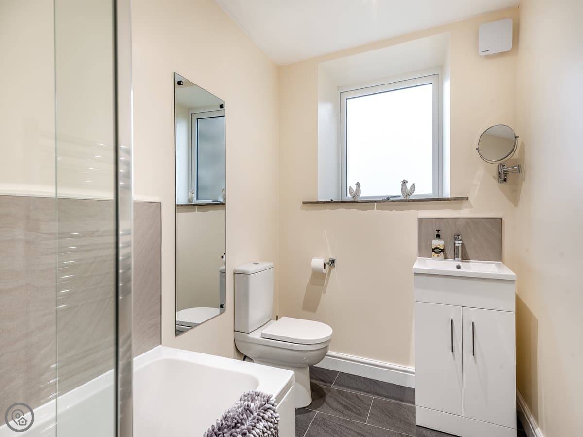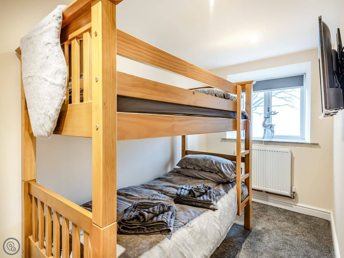 It sleeps six. There are three bedrooms and two bathrooms. It's got a 4 Star rating, which means it's been done up to a good standard. Two of the bedrooms are doubles upstairs with a shower room. The third bedroom is on the ground floor. It has an adult-sized bunk bed and there's a bathroom with a bath next to it. All the bedrooms have Smart TVs and the views from them are very good.
