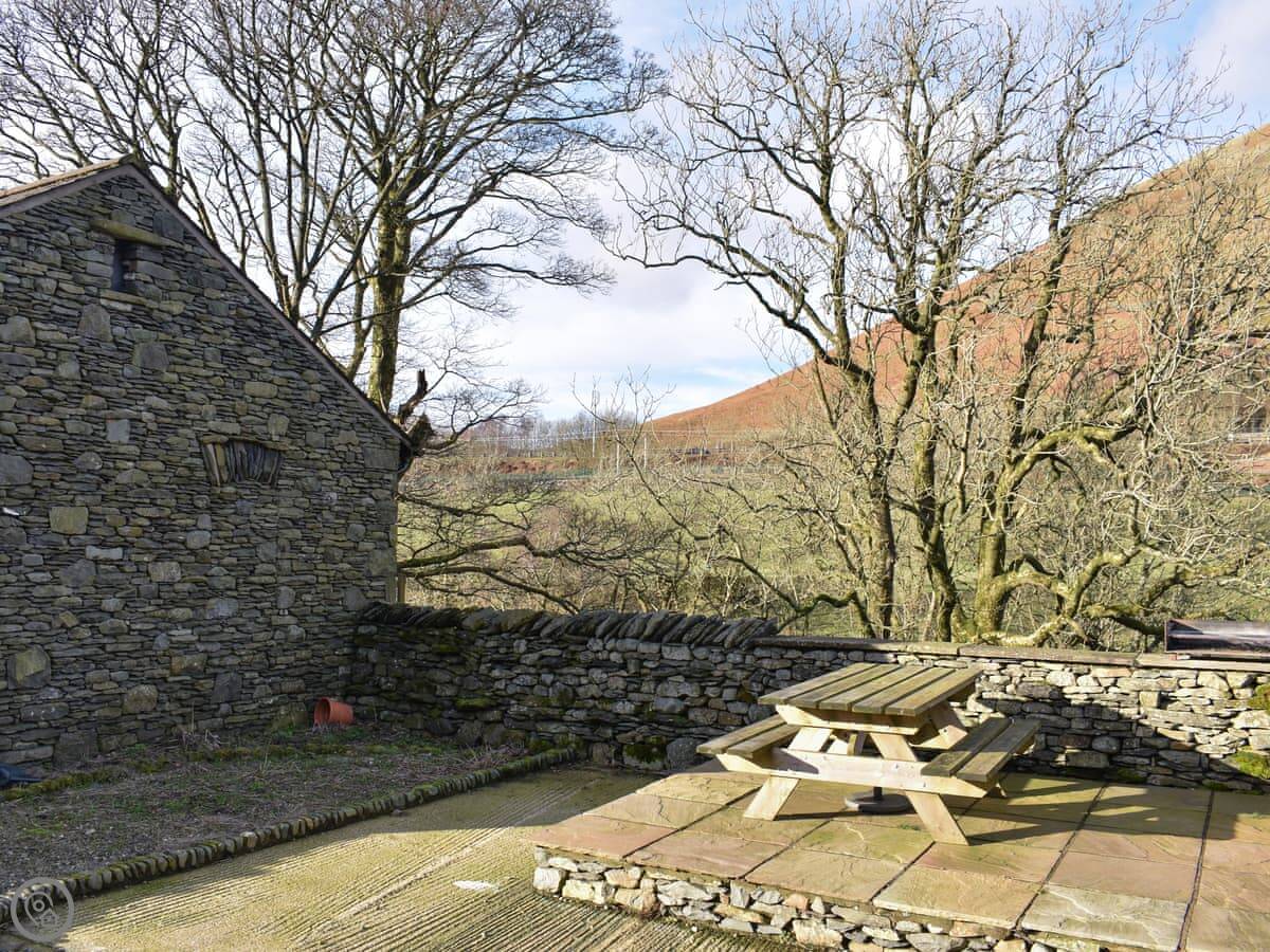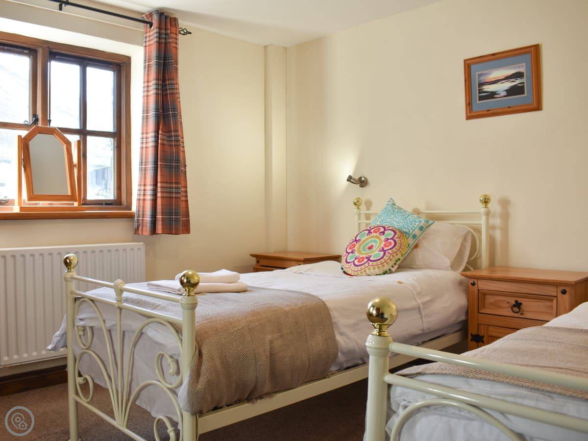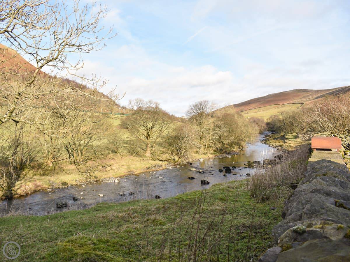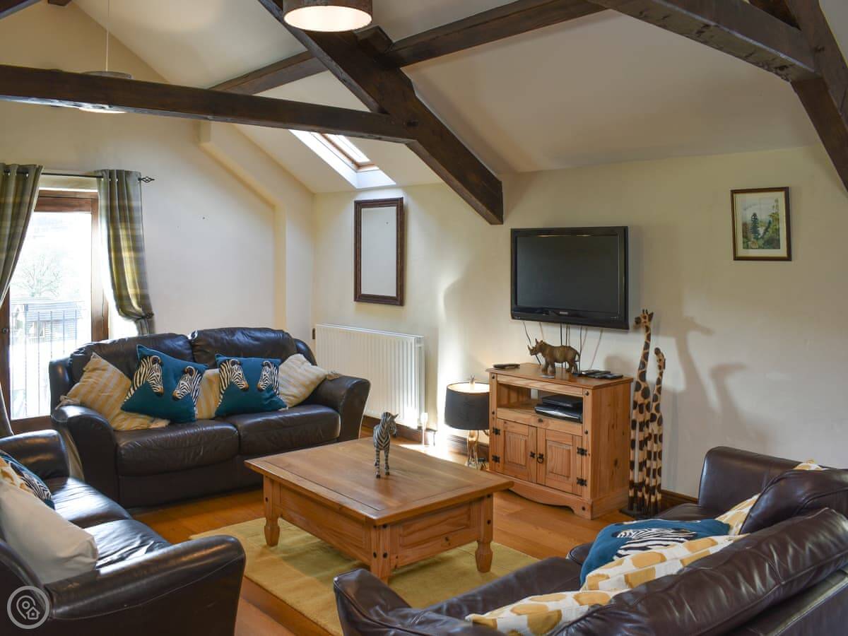 It's an old farm building done up. Four bedrooms, all on the ground floor. Two have their own bathrooms, and there's a third bathroom as well. Upstairs is just the living room. It's a big space with doors that open onto a small balcony. You look out over the valley and the River Lune. The views are good.