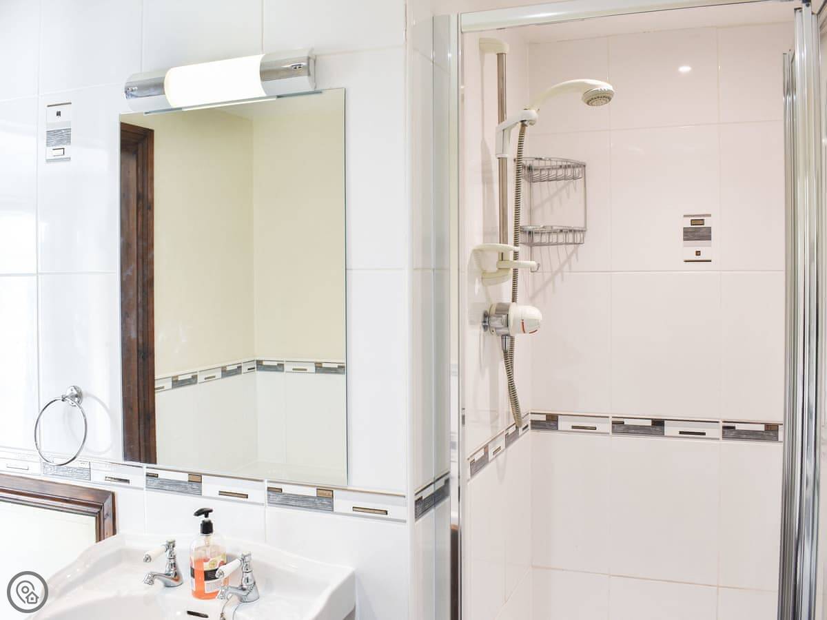 There are three bedrooms and three bathrooms. Two of the bedrooms are on the ground floor and have their own en-suites, which is handy if you don't fancy stairs. The main living area is upstairs. It's open plan, with a kitchen, dining, and sitting space all in one. It’s a good space for everyone to be together.