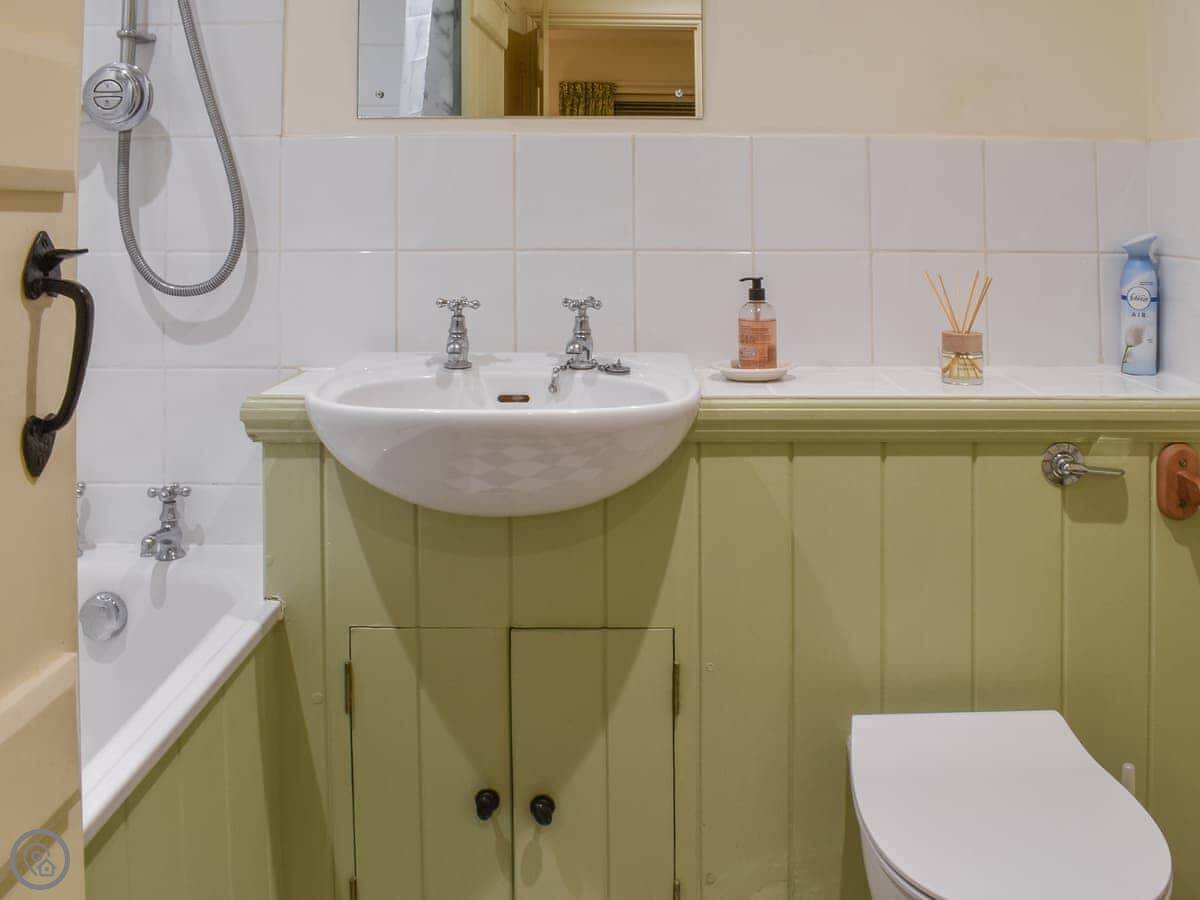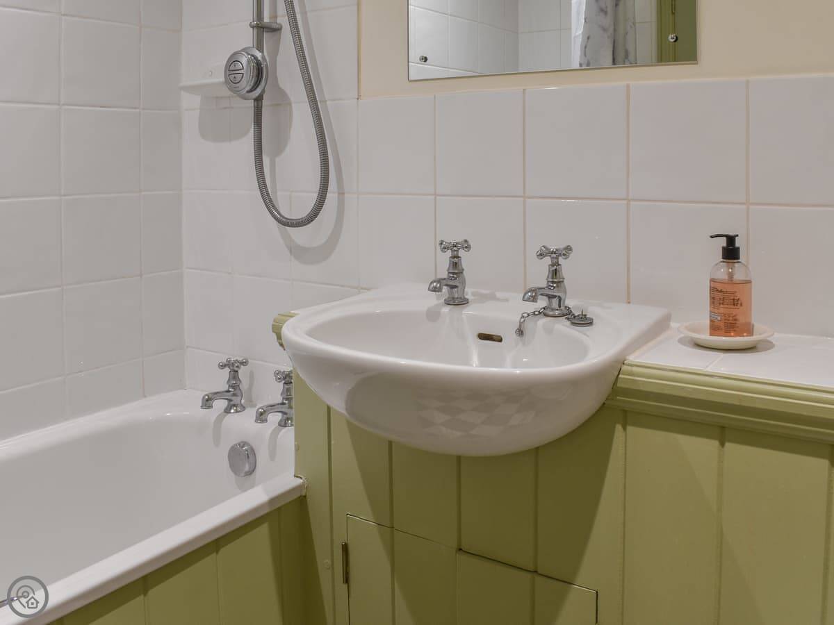 It's a ground floor studio, so it's all open plan. There's a double bed at one end, then the living space and a kitchen. It sleeps two. There's a bathroom with a bath and a shower over it. It's got a 3 Star rating, so it's comfortable and has what you need, but it's not a show home.