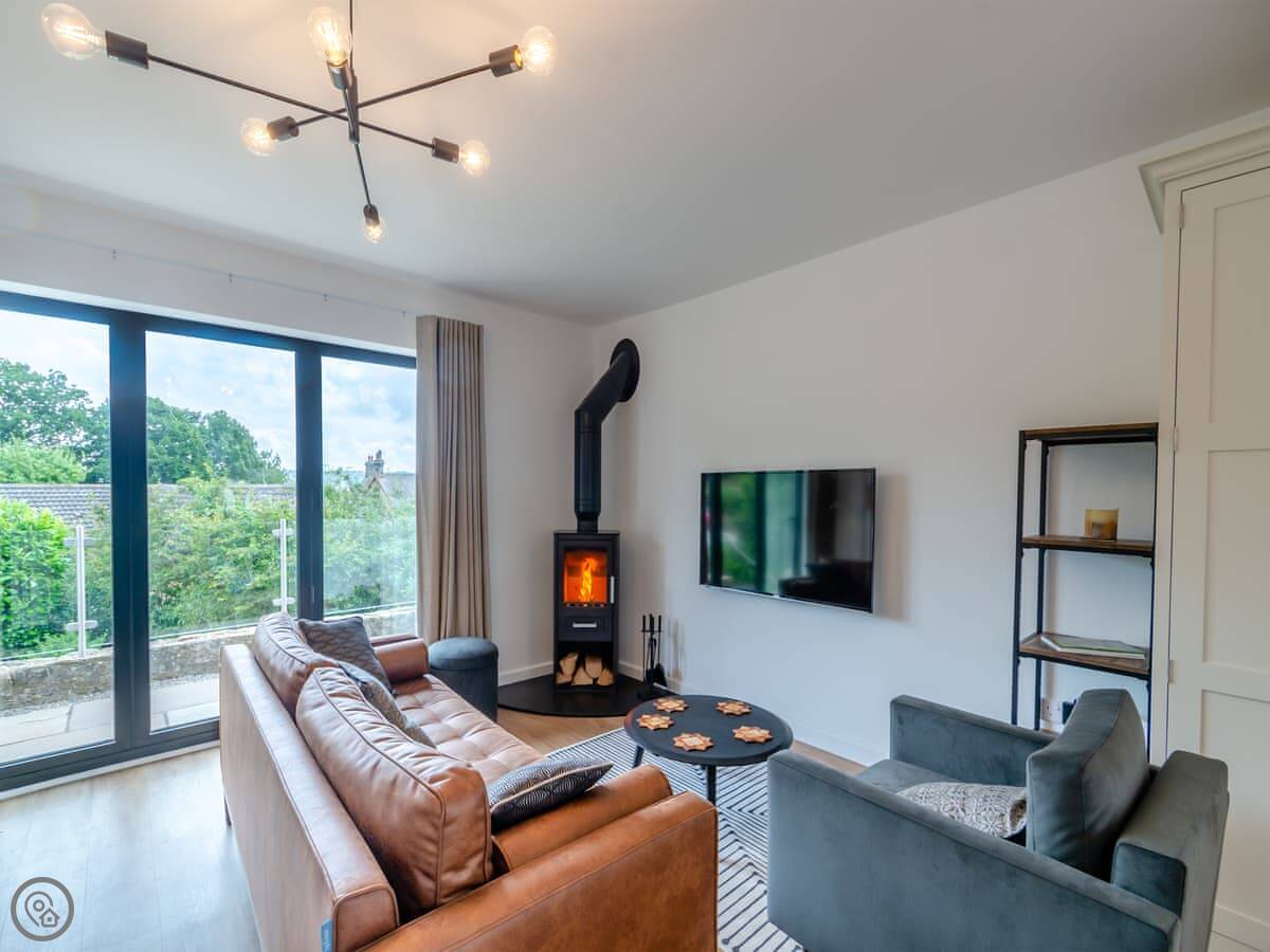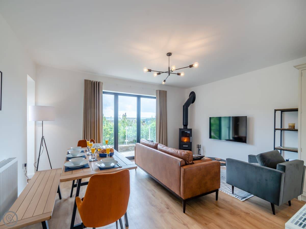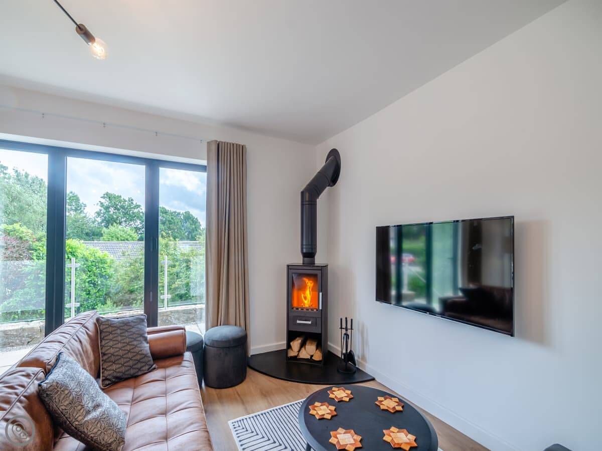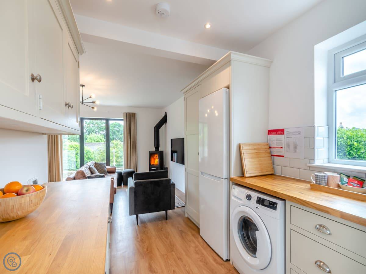 The living area is open plan, with a wood burner, a sofa, and a table. There are bi-fold doors that open onto a patio with a nice view over the fields. The kitchen has a dishwasher and washing machine. There's parking for you on the drive.