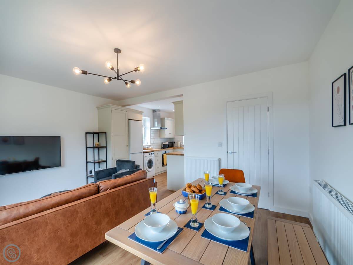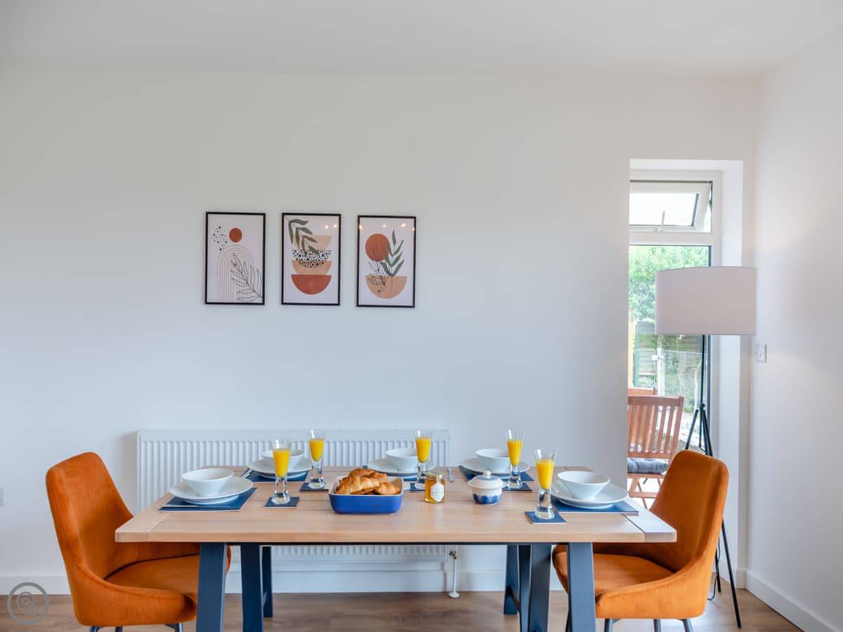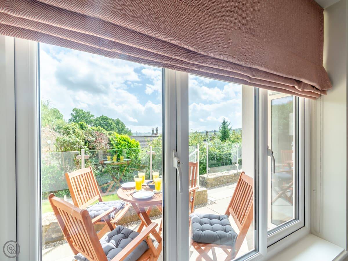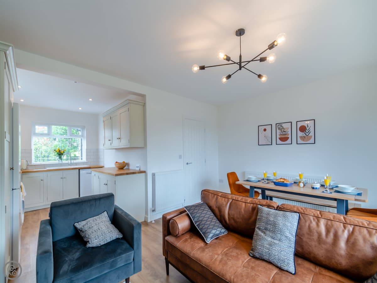 The living area is open plan, with a wood burner, a sofa, and a table. There are bi-fold doors that open onto a patio with a nice view over the fields. The kitchen has a dishwasher and washing machine. There's parking for you on the drive.