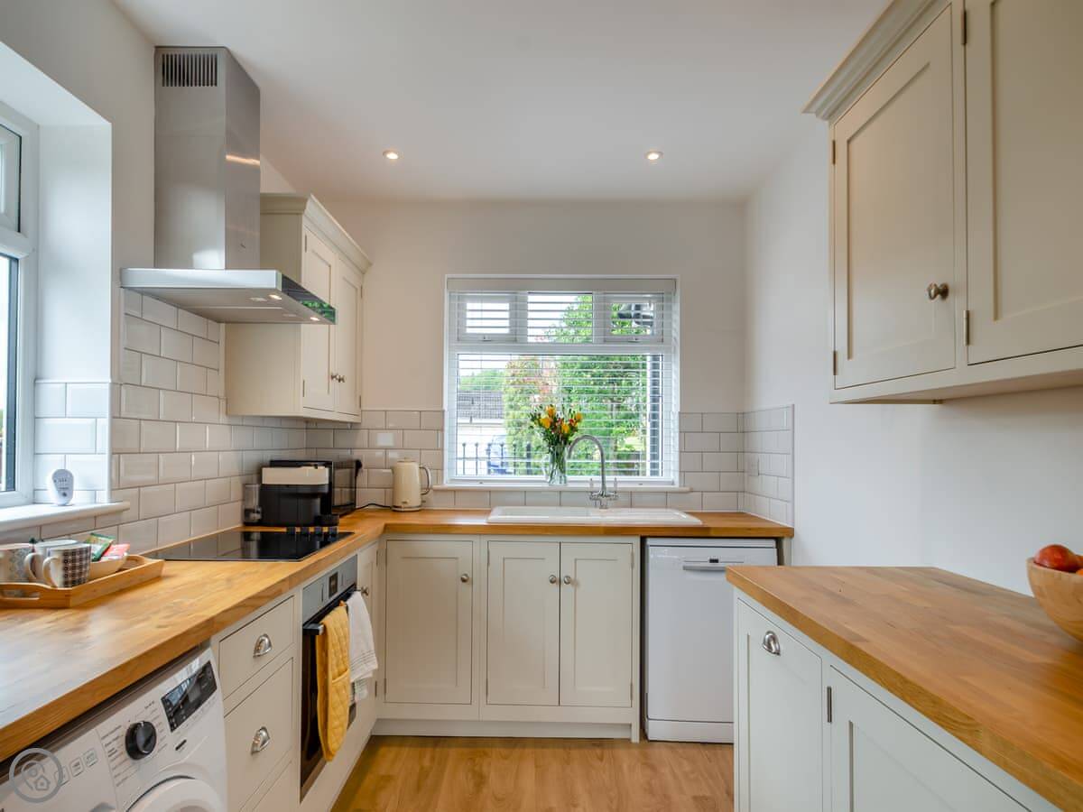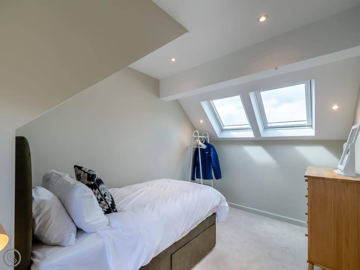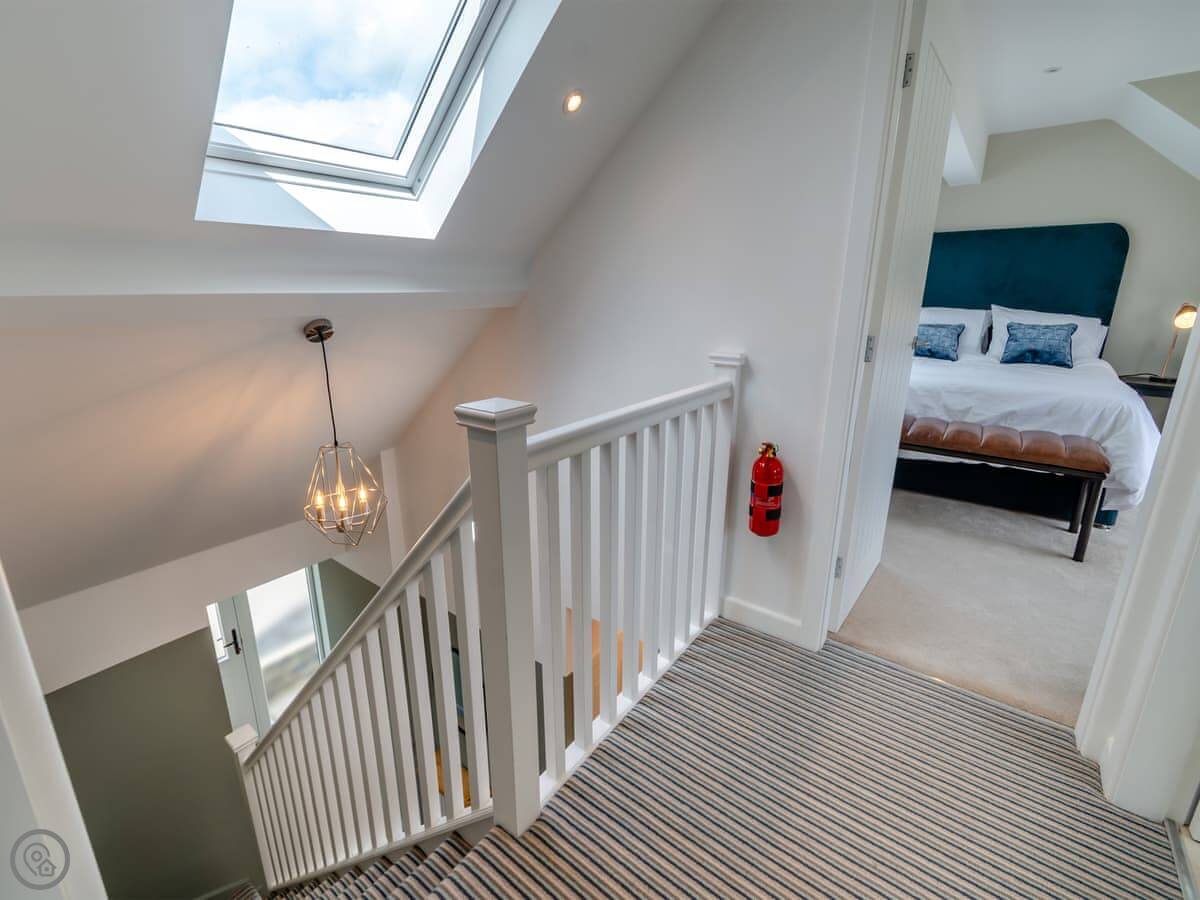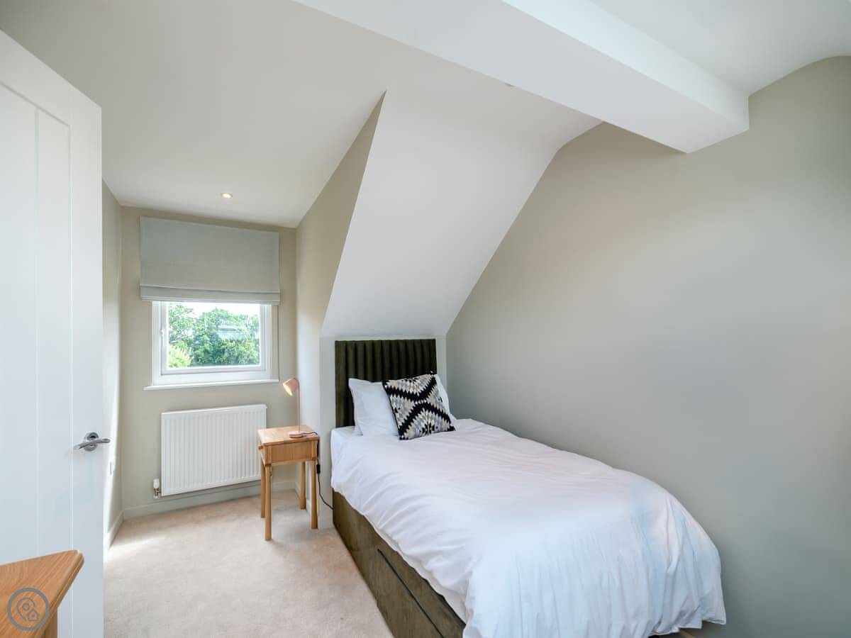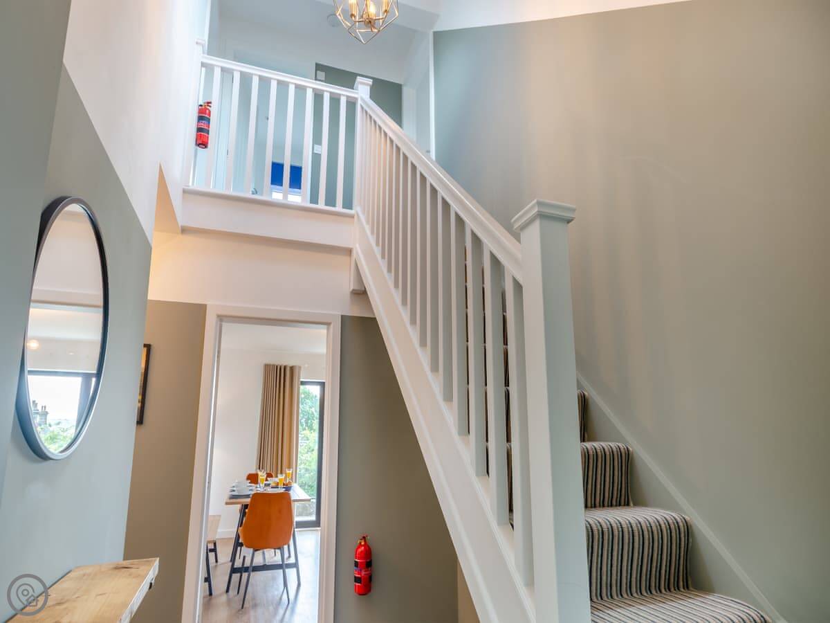 It sleeps five, in three bedrooms. There are two bathrooms, one upstairs and one down, and one of the bedrooms is on the ground floor too. It has a 4 Star rating. It's clean, and feels quite new after the renovation.