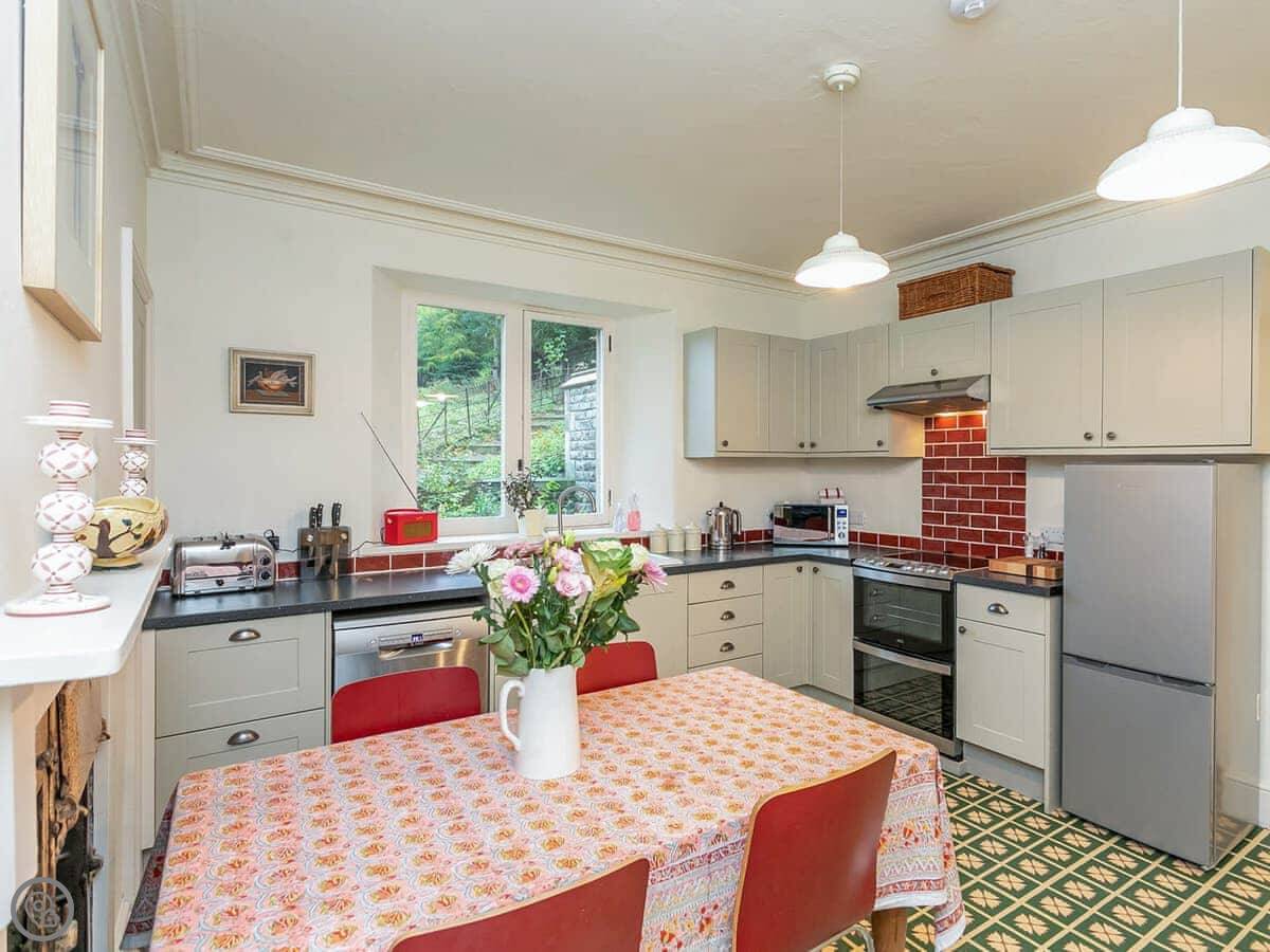 For facilities, you've got a washing machine, dishwasher, TV, WiFi, and parking. Bedding and towels are included. There's a cot and a highchair if you need them. One well behaved dog is allowed.