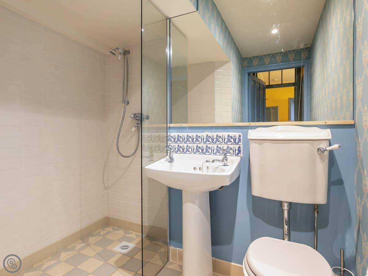 The kitchen door is the main way in. Inside, it's all on one level except for two bedrooms which are upstairs. The stairs are normal. There's a downstairs bedroom and shower room, which could be good if stairs are a problem for someone.