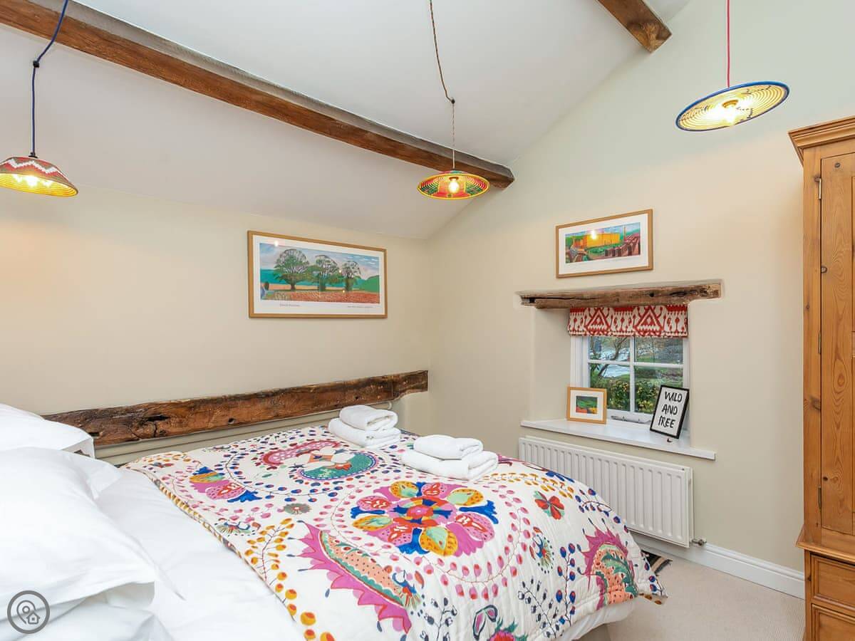 The stairs are fairly steep, which is typical for a barn. There's a stairgate at the top. The living room has a wood burner. We leave logs for you to get started.