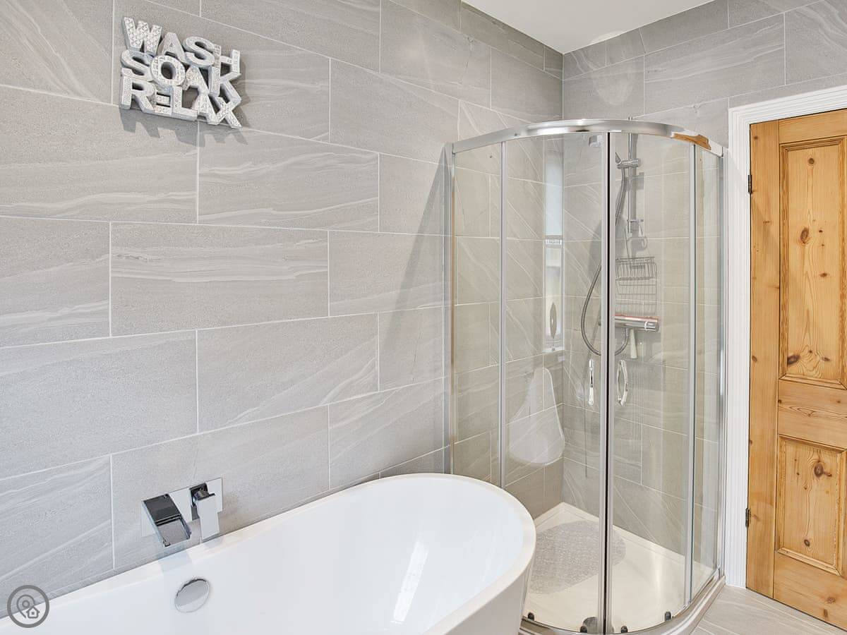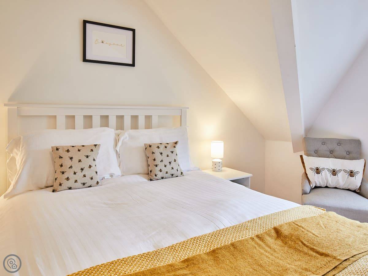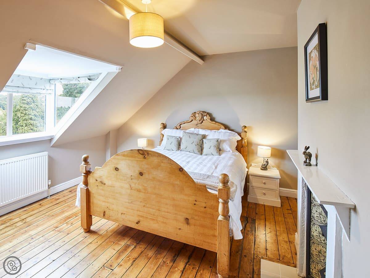 Stepping inside, you have the welcoming living room with sumptuous sofas around the multi-fuel burner. The kitchen boasts huge windows looking out onto the valley with rolling fields stretched out before you. The dining table has a characterful pew and chapel chairs reclaimed from a church, the furniture has been carefully sourced with some beautifully crafted antique pieces in keeping with the property’s history and charm. The kitchen is modern with high quality integrated appliances, the perfect blend of modern luxury and heritage furnishings.