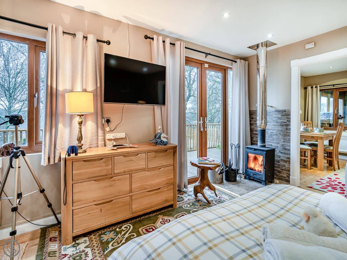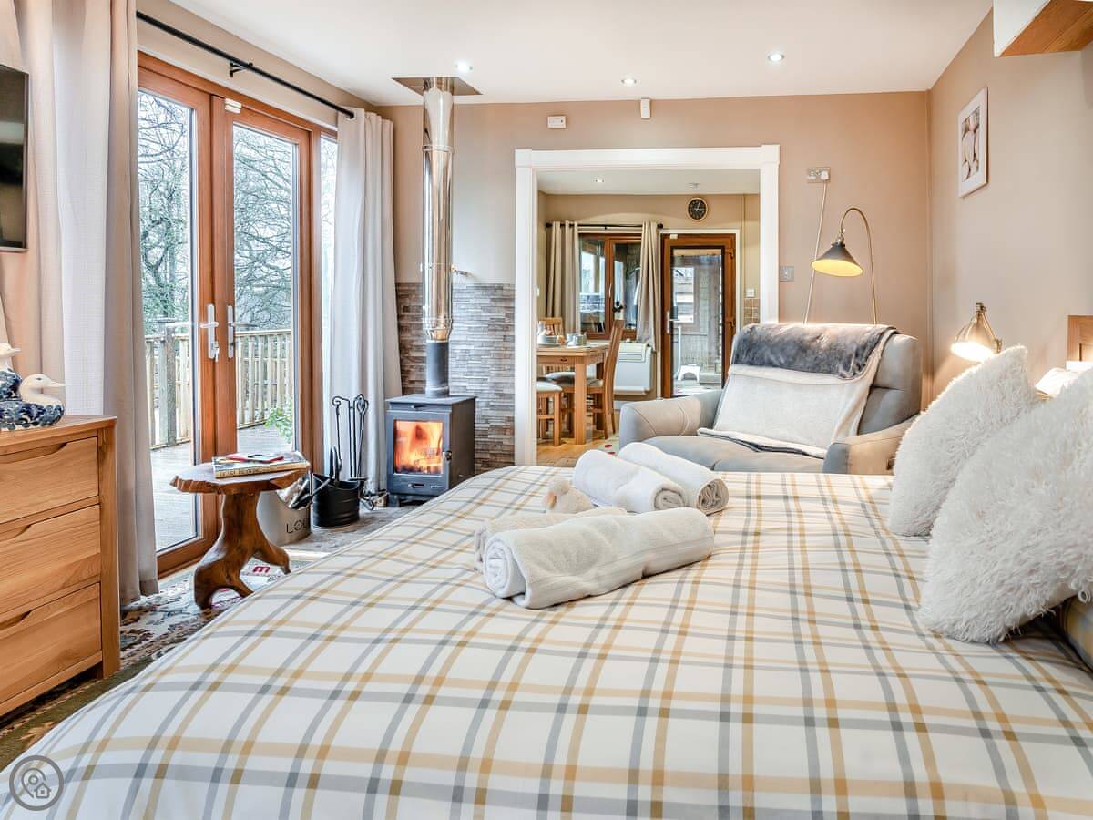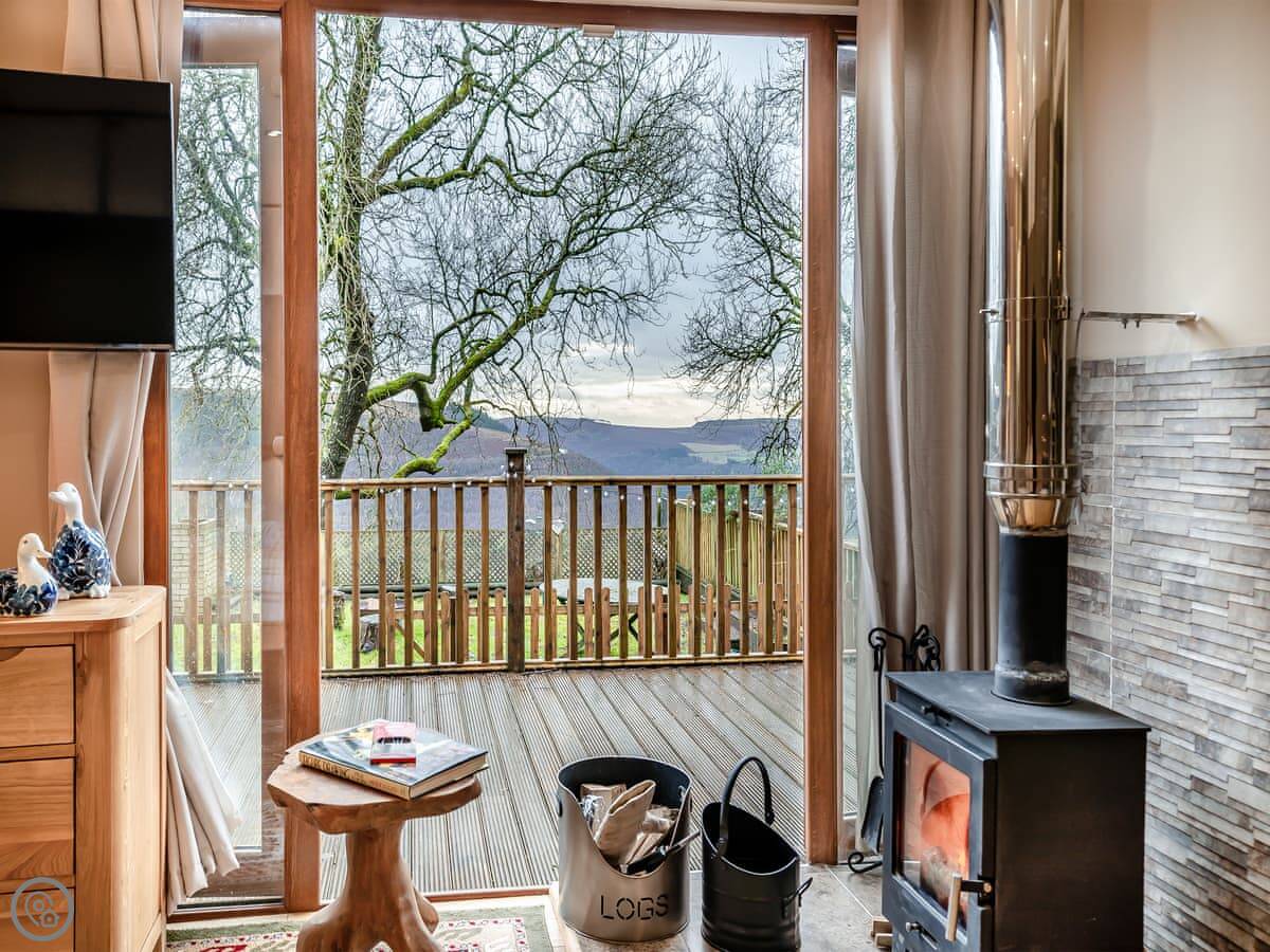 The lodge itself is well equipped for your break and has been furnished with comfort and quality in mind. An open plan layout is split into two areas… First, you’ll enter the kitchen diner area with a well-equipped kitchen and a dining table under the window to enjoy the views! Then the spacious sleeping/lounge area also faces out to the beautiful scenic views, this area has a double bed, comfy reclining sofa, log burner, TV and ample storage. There is a shower room with separate toilet.