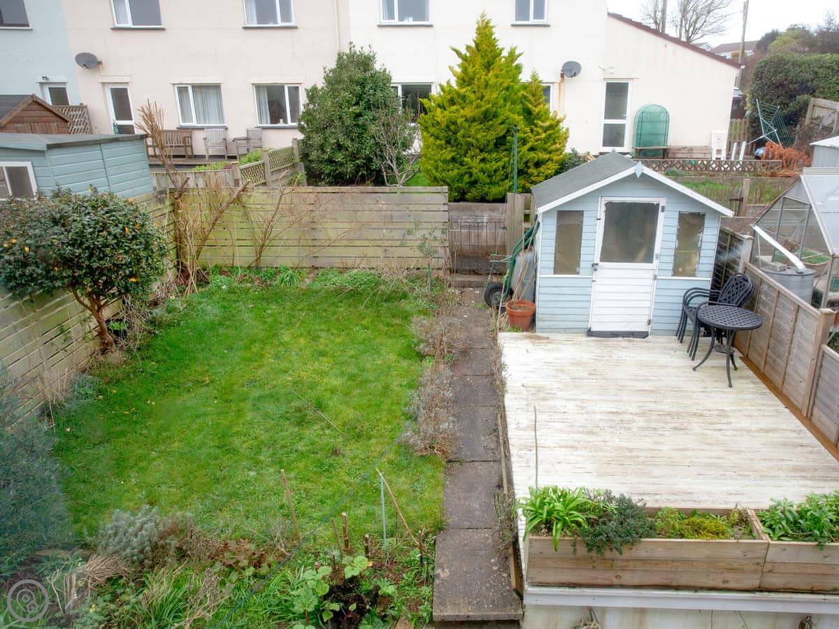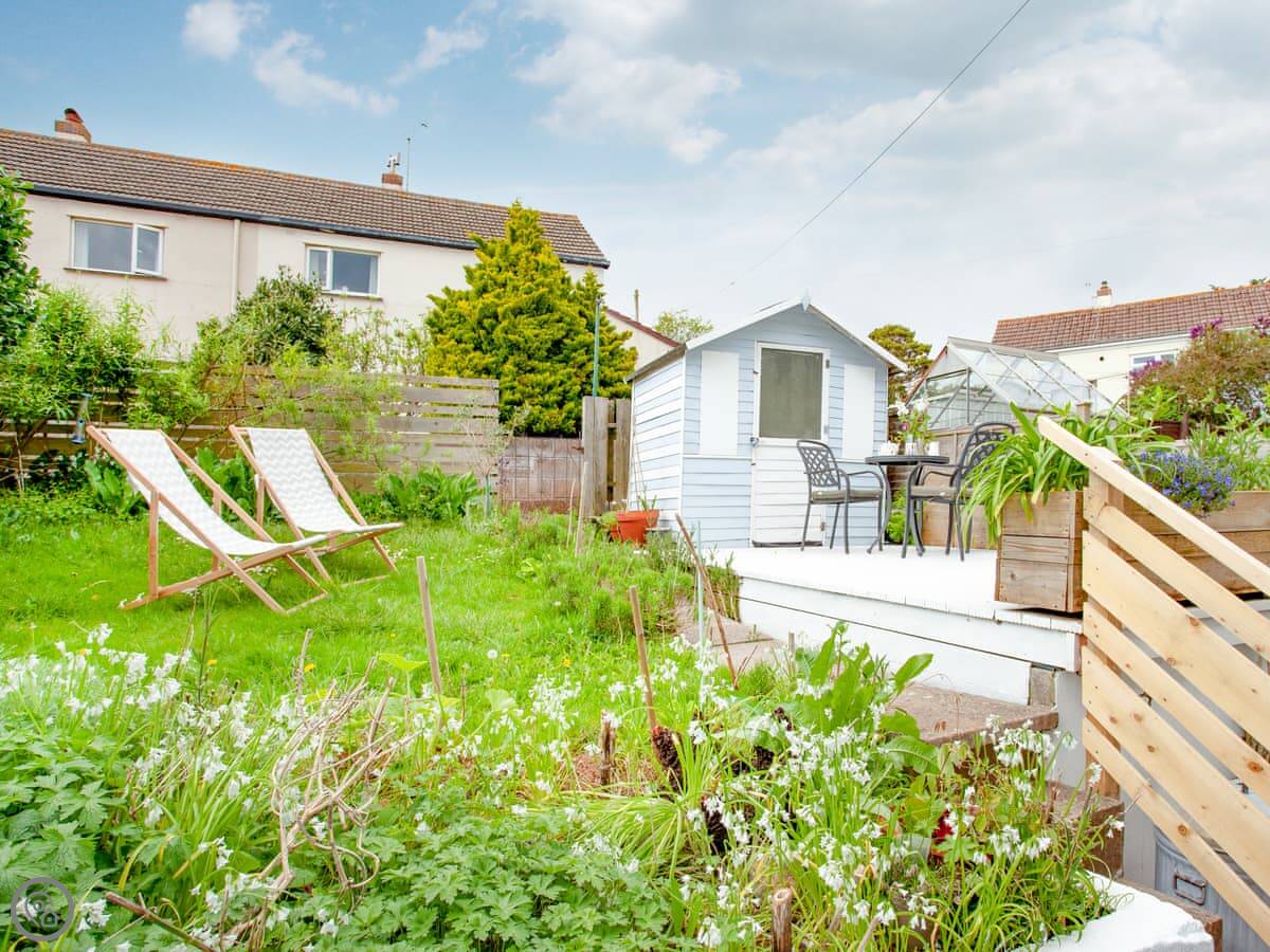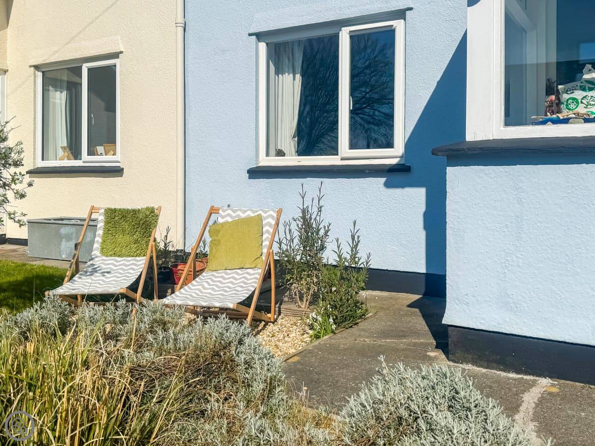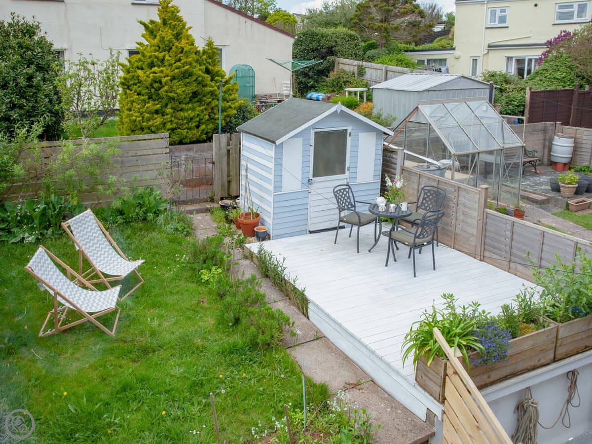 The house is on a road, so you get an allocated parking space about 50 yards away, which is useful. There’s a porch for shoes and wetsuits. The garden is out the back, sunny and private. It’s got a lawn and a deck with a table and chairs.