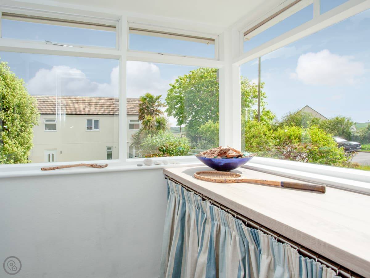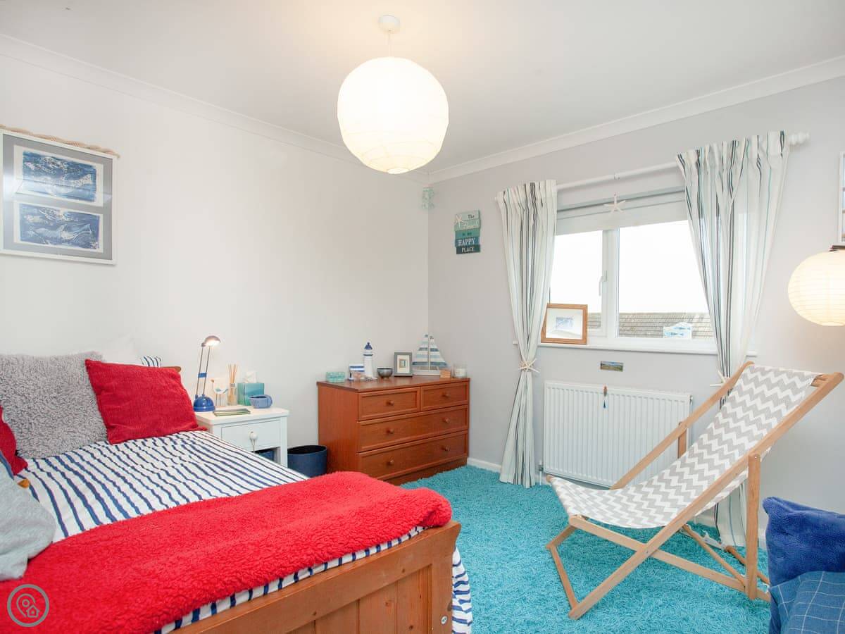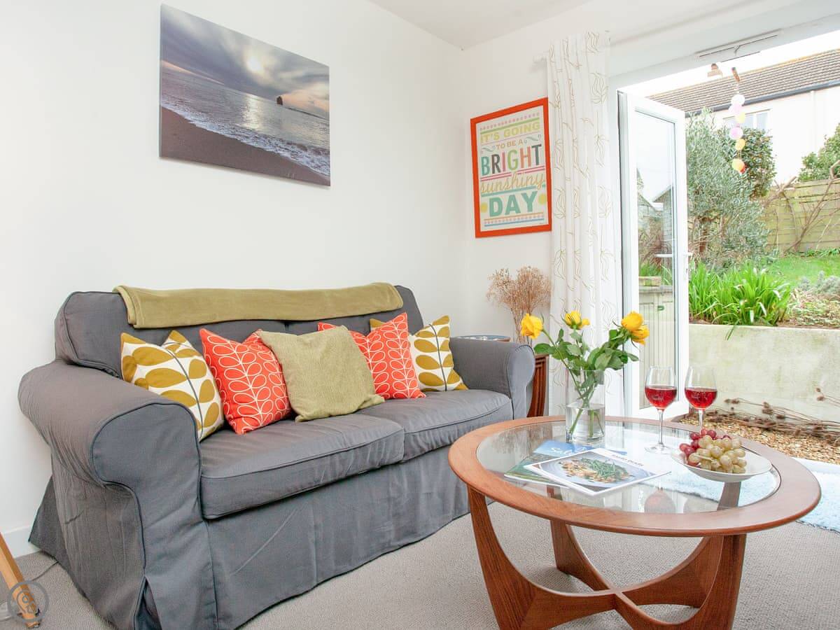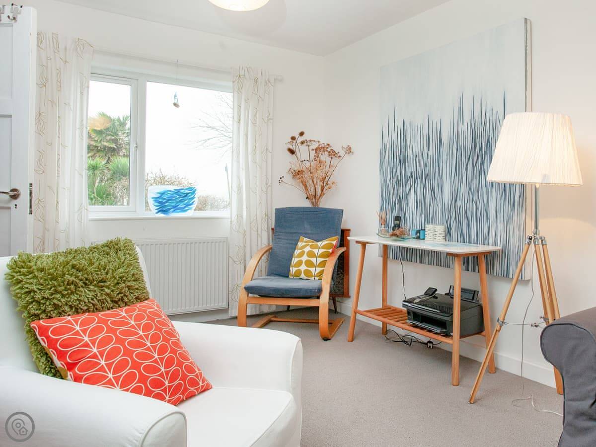 The house is on a road, so you get an allocated parking space about 50 yards away, which is useful. There’s a porch for shoes and wetsuits. The garden is out the back, sunny and private. It’s got a lawn and a deck with a table and chairs.