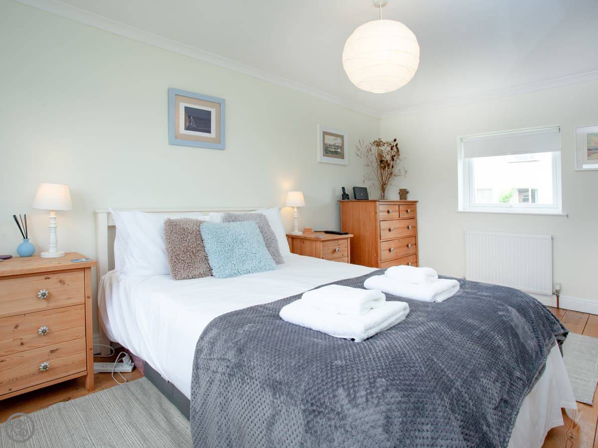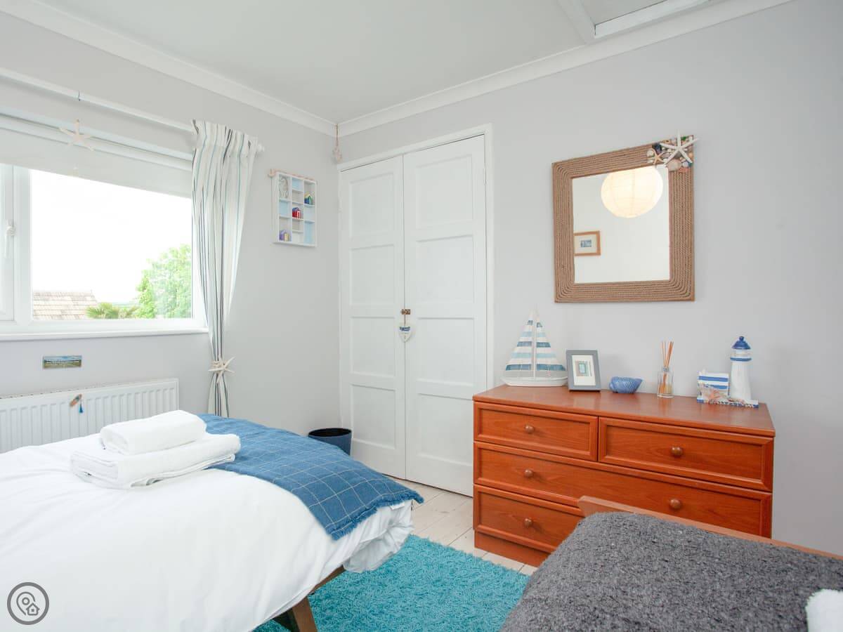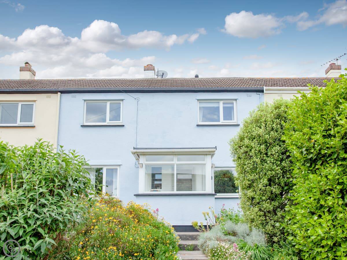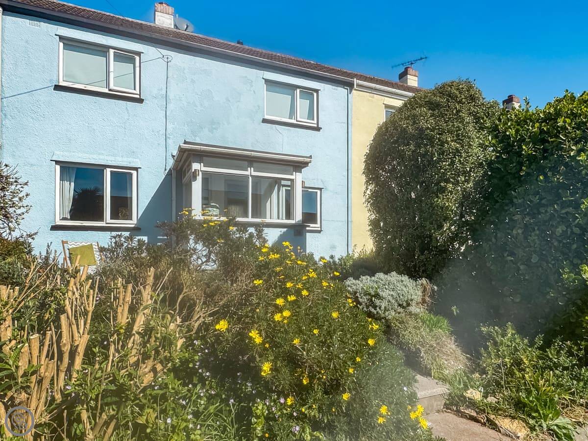 The house is on a road, so you get an allocated parking space about 50 yards away, which is useful. There’s a porch for shoes and wetsuits. The garden is out the back, sunny and private. It’s got a lawn and a deck with a table and chairs.