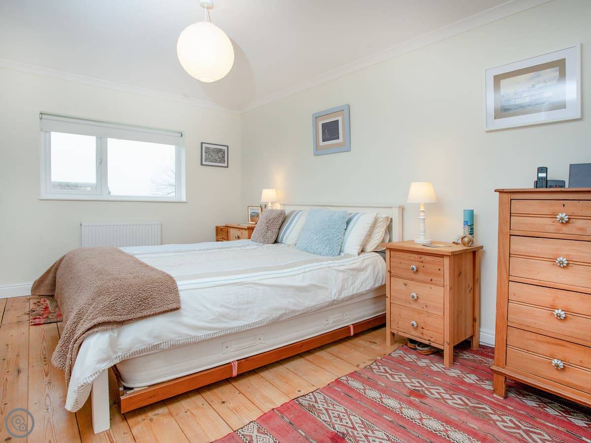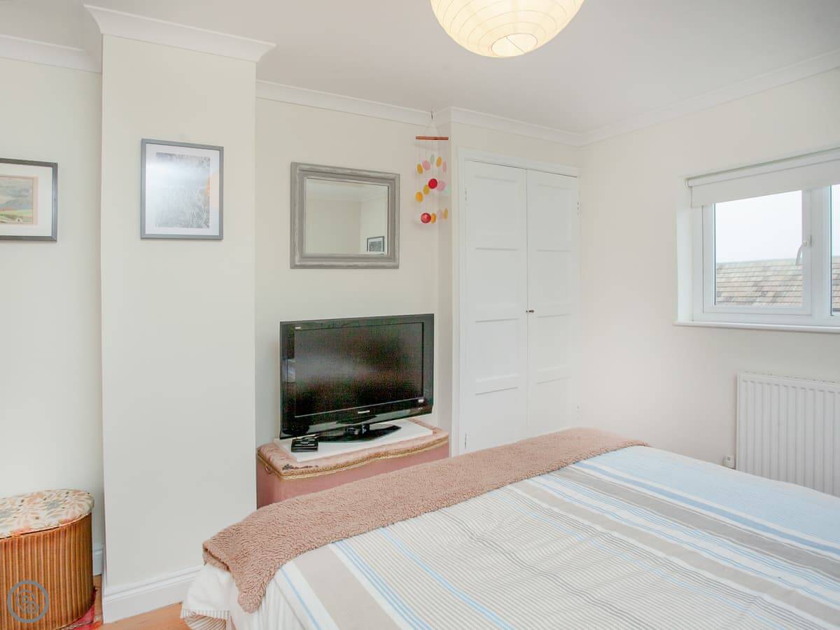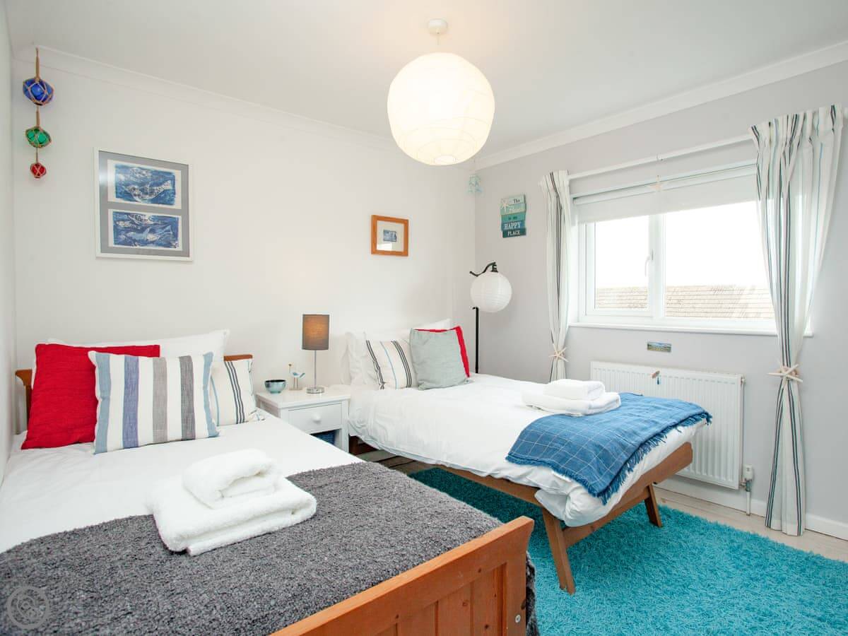 Inside, the sitting room has French doors to the garden. The kitchen has everything you’d need. It’s all fine, nothing fancy. The stairs are a normal staircase. Upstairs, the main bedroom has a kingsize bed and a TV. The second room has a single bed with a pull-out bed underneath, so it can be a twin if needed.