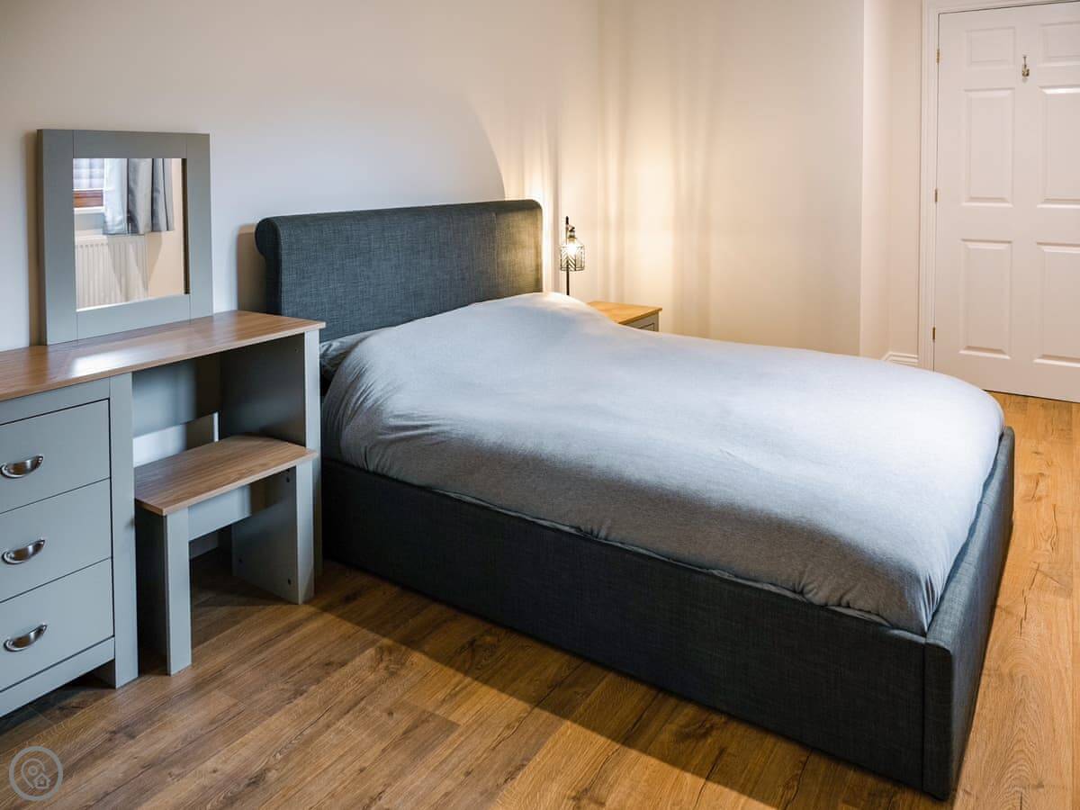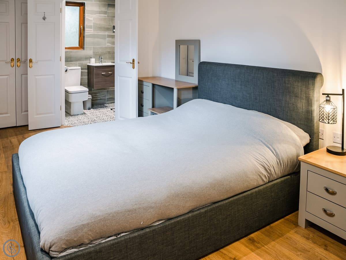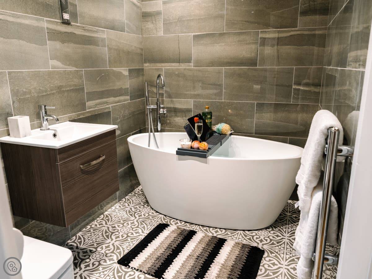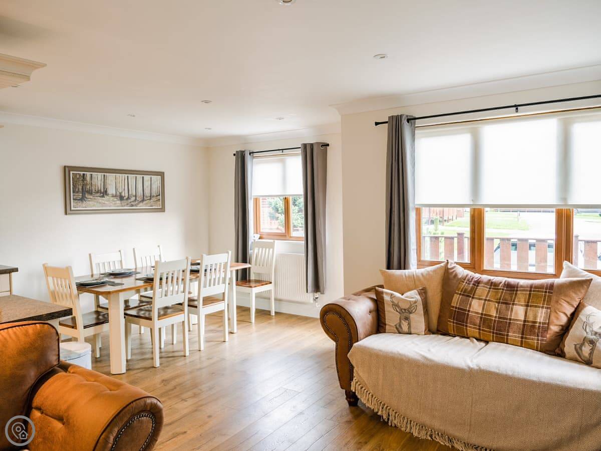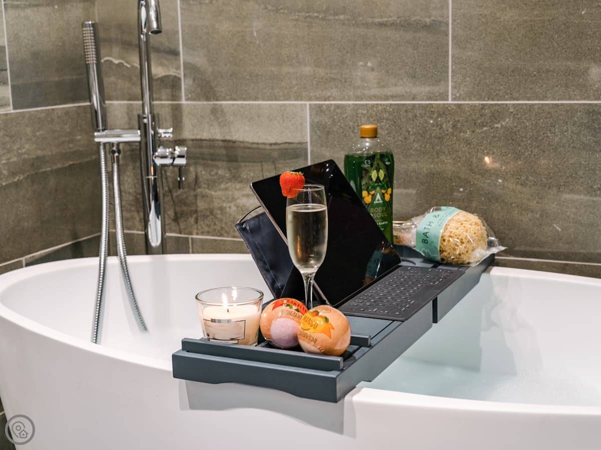It sleeps four. Two bedrooms, both with their own bathrooms which is handy. The main bedroom has a freestanding bath in it. The living area is all one open space so it's sociable. There's a deck outside.