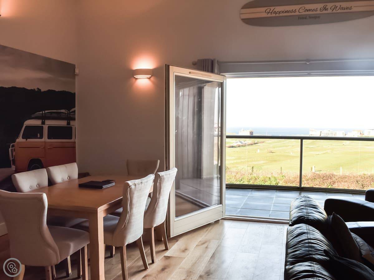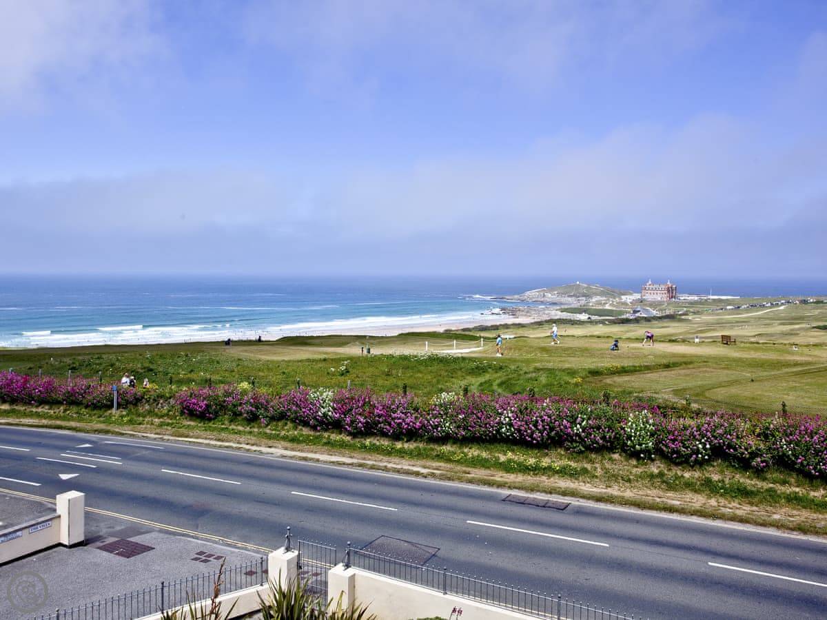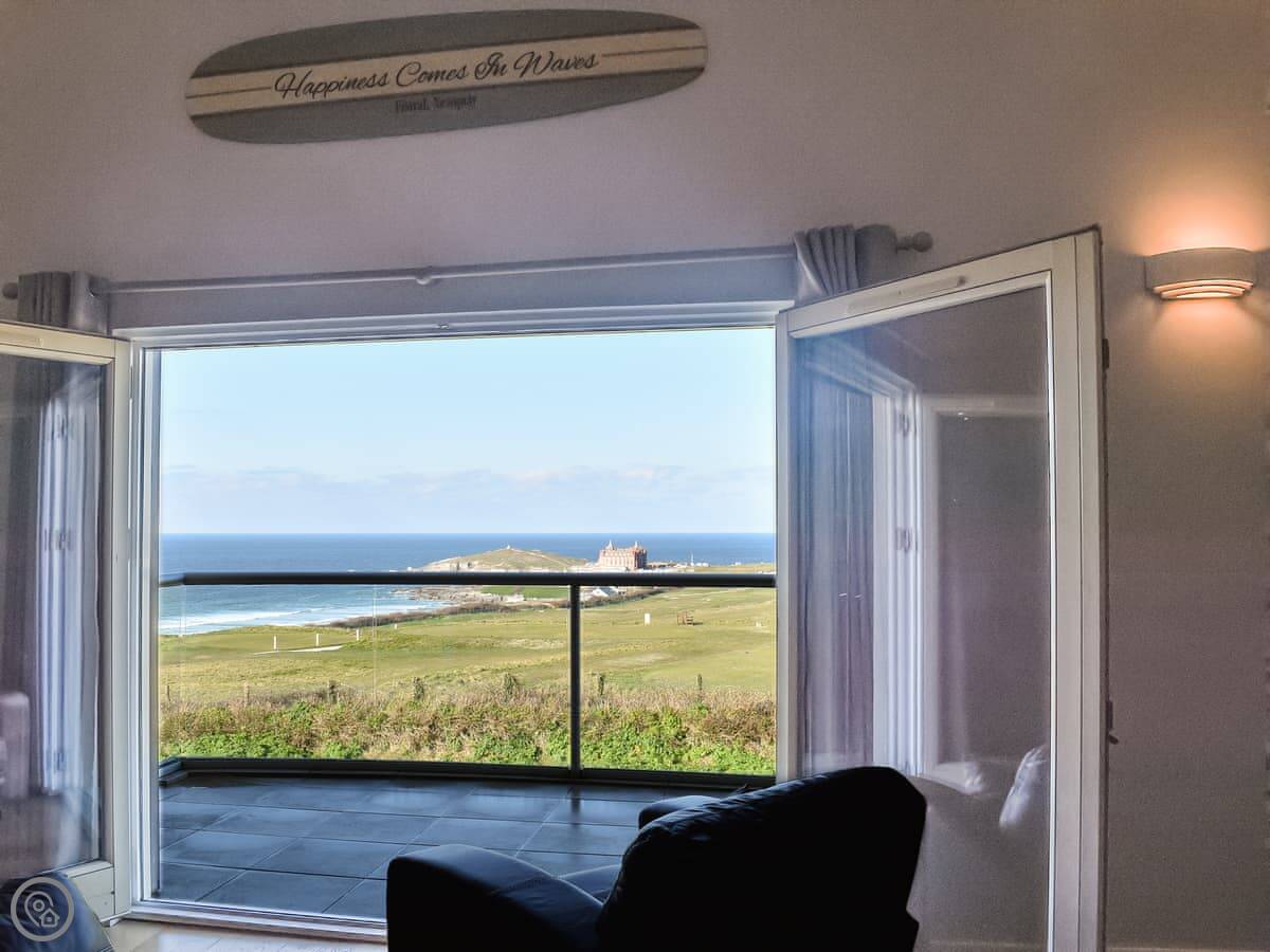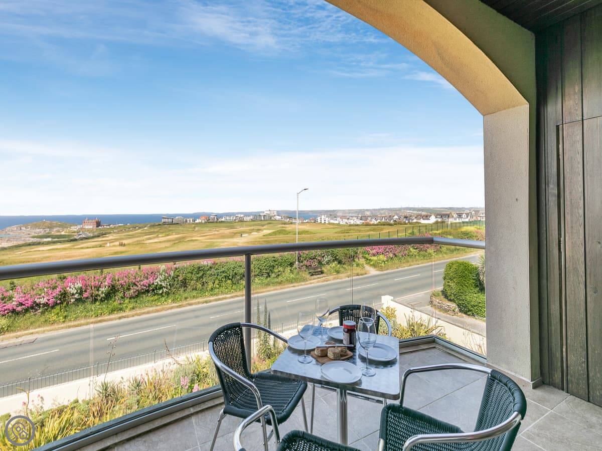 The Vista is an apartment in a building on the Pentire headland in Newquay. The views are the main thing. You get a proper panorama from the living room and balcony over the beach, the golf course, and the Gannel estuary.