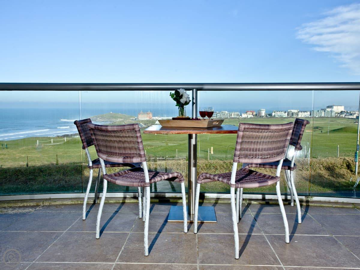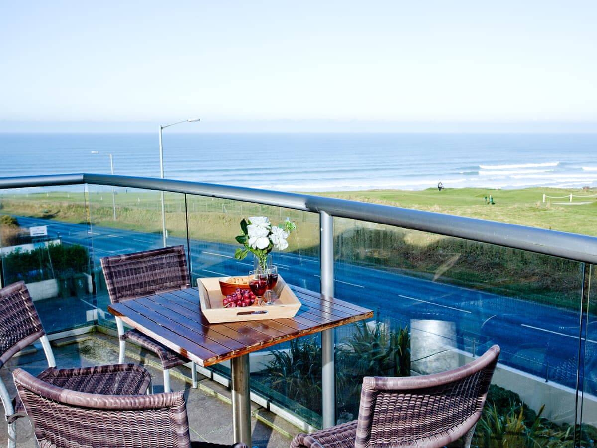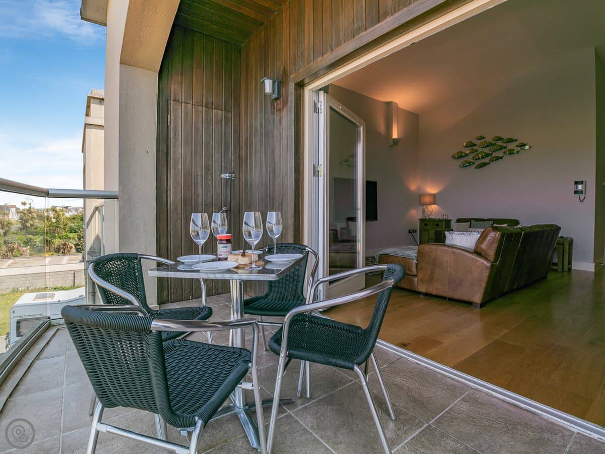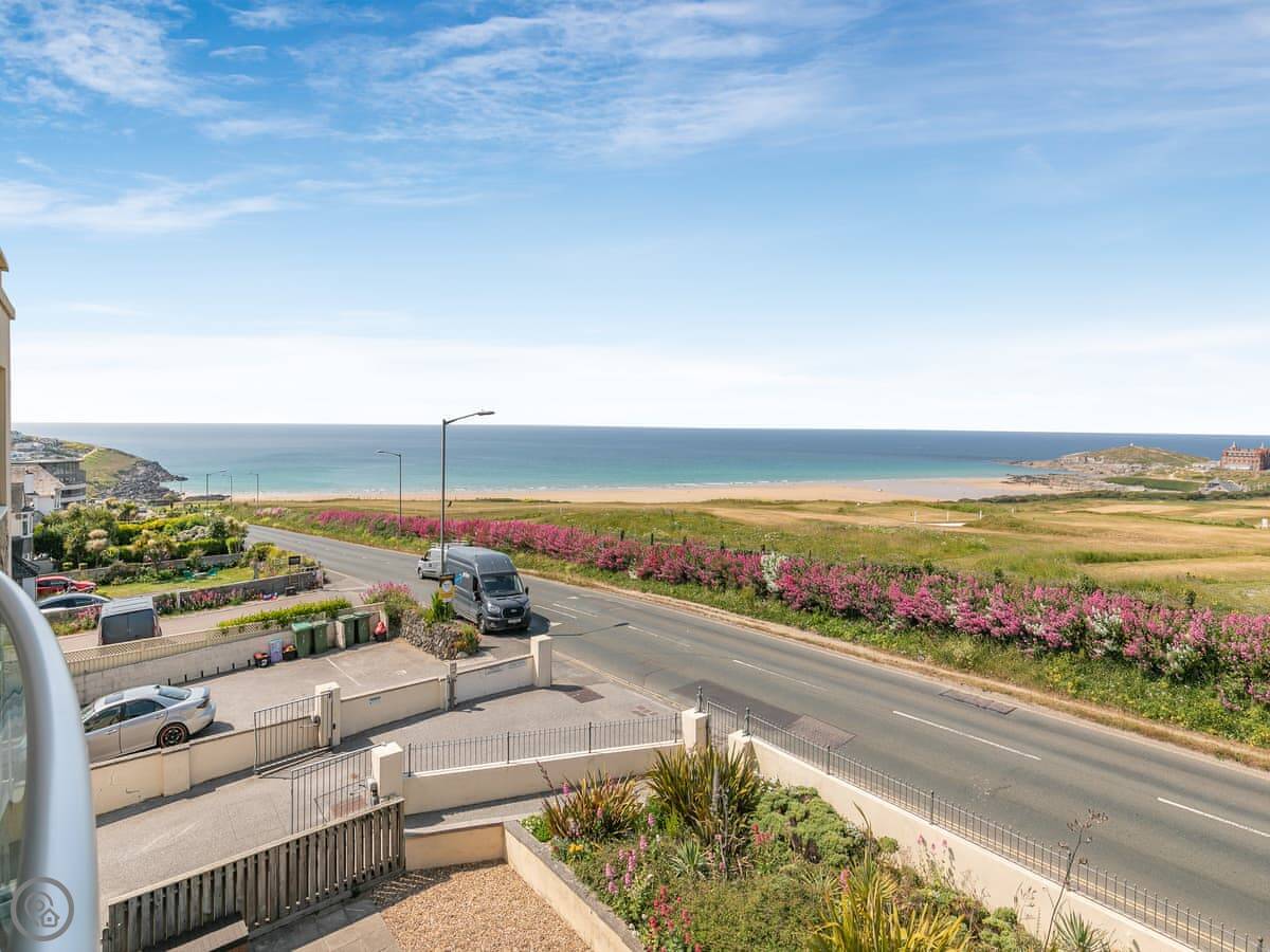 The Vista is an apartment in a building on the Pentire headland in Newquay. The views are the main thing. You get a proper panorama from the living room and balcony over the beach, the golf course, and the Gannel estuary.