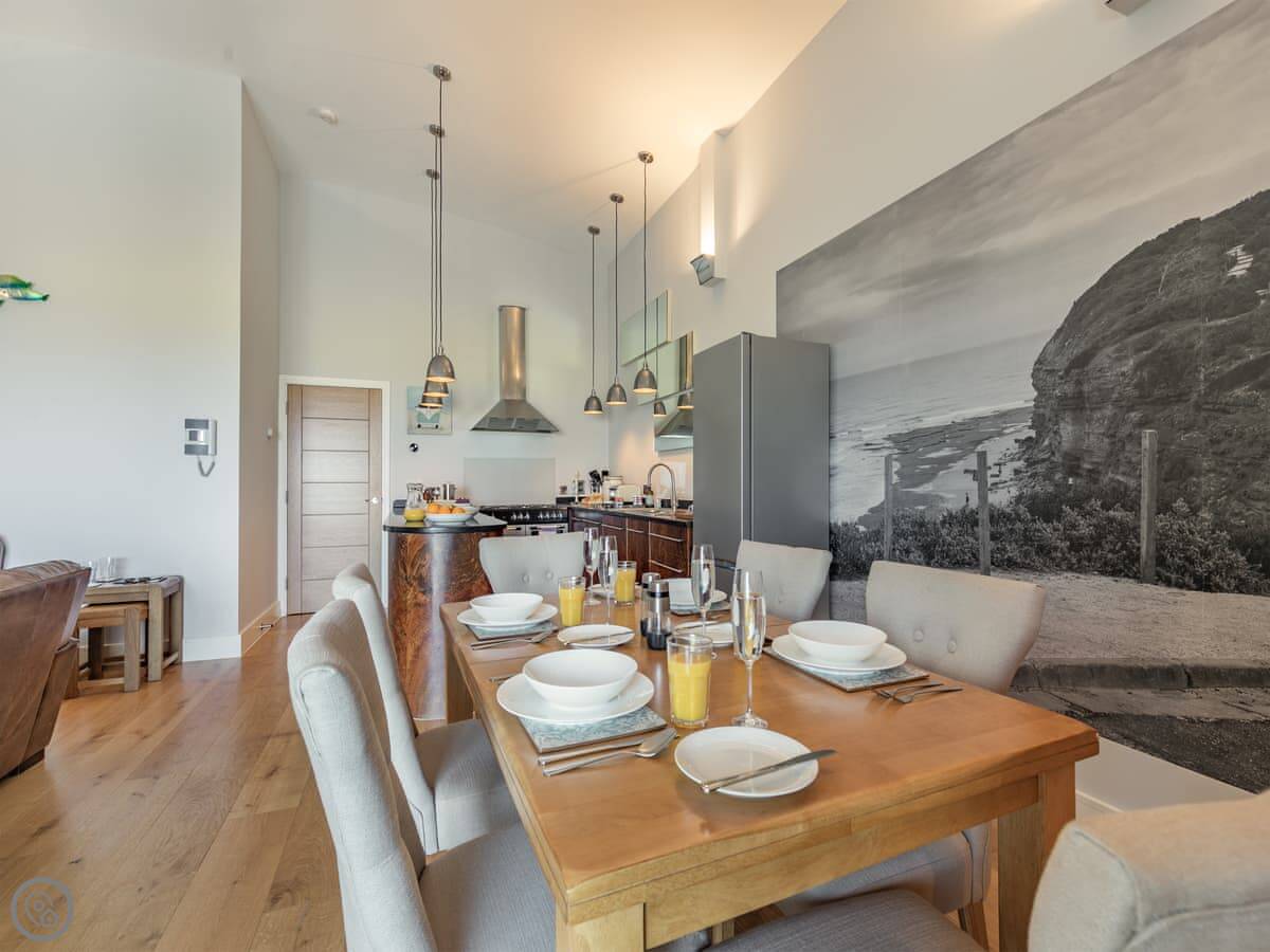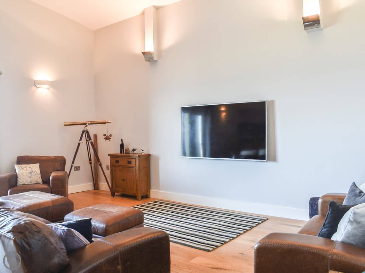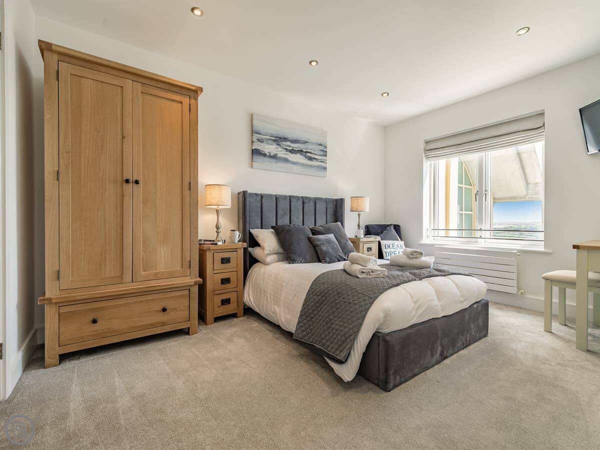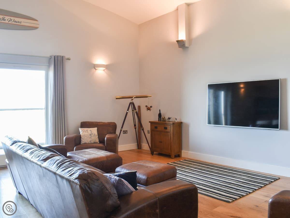 The Vista is an apartment in a building on the Pentire headland in Newquay. The views are the main thing. You get a proper panorama from the living room and balcony over the beach, the golf course, and the Gannel estuary.
