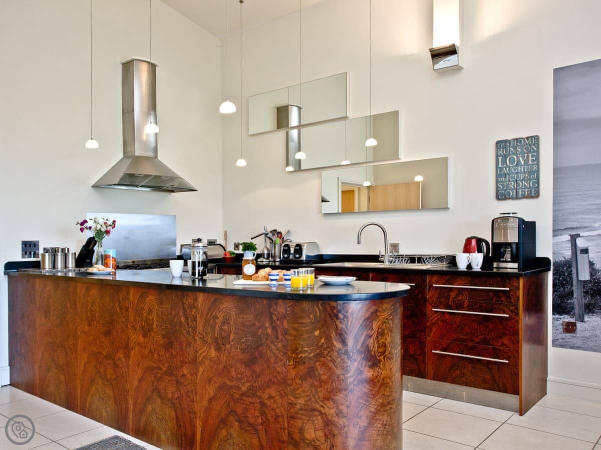 You get a lift up to it, which is on the third floor. The living space is all open plan. There's a kitchen at one end, then the dining and sitting area which opens onto the balcony. It's got everything you'd expect. Washing machine, dishwasher, WiFi.