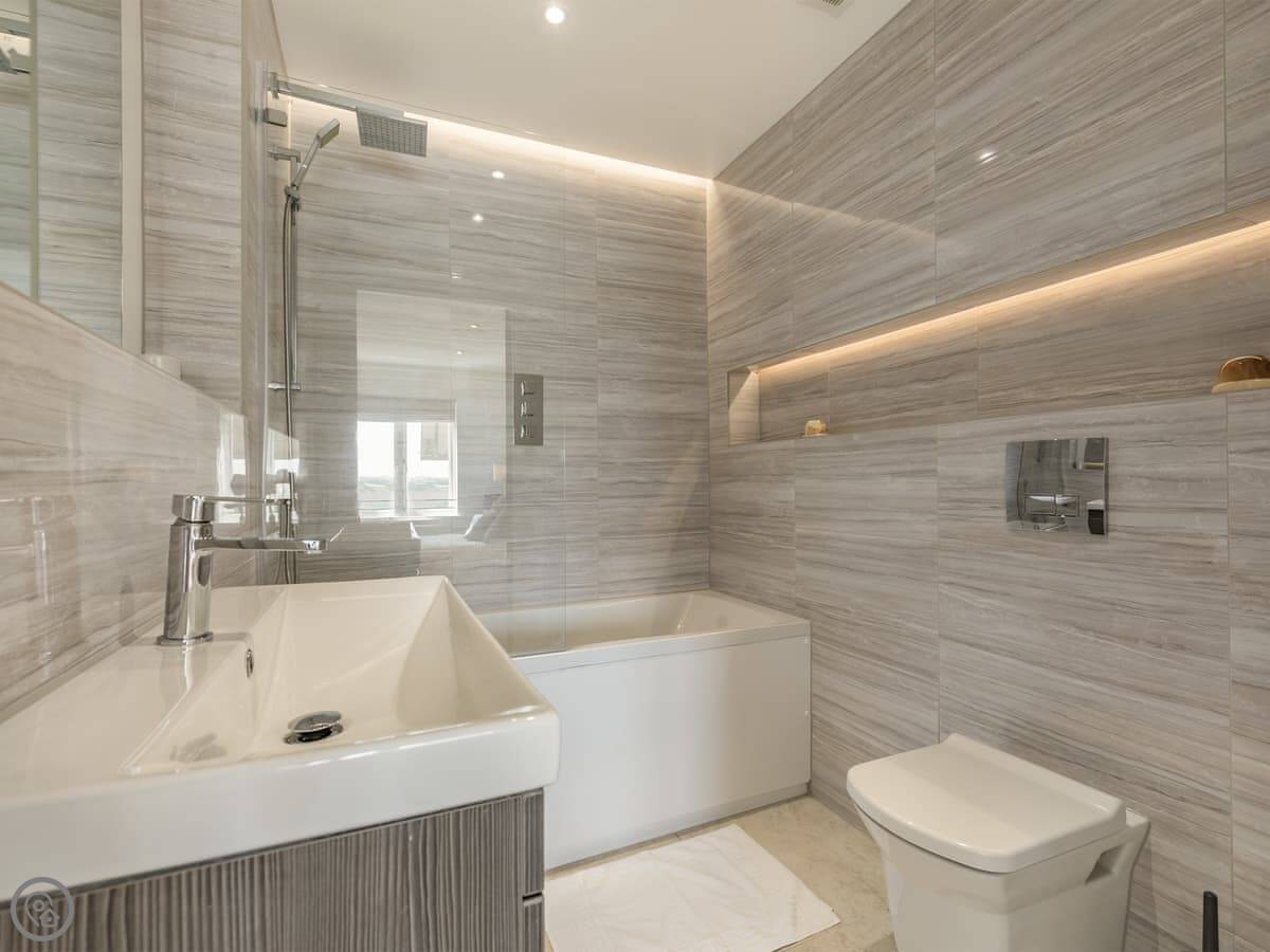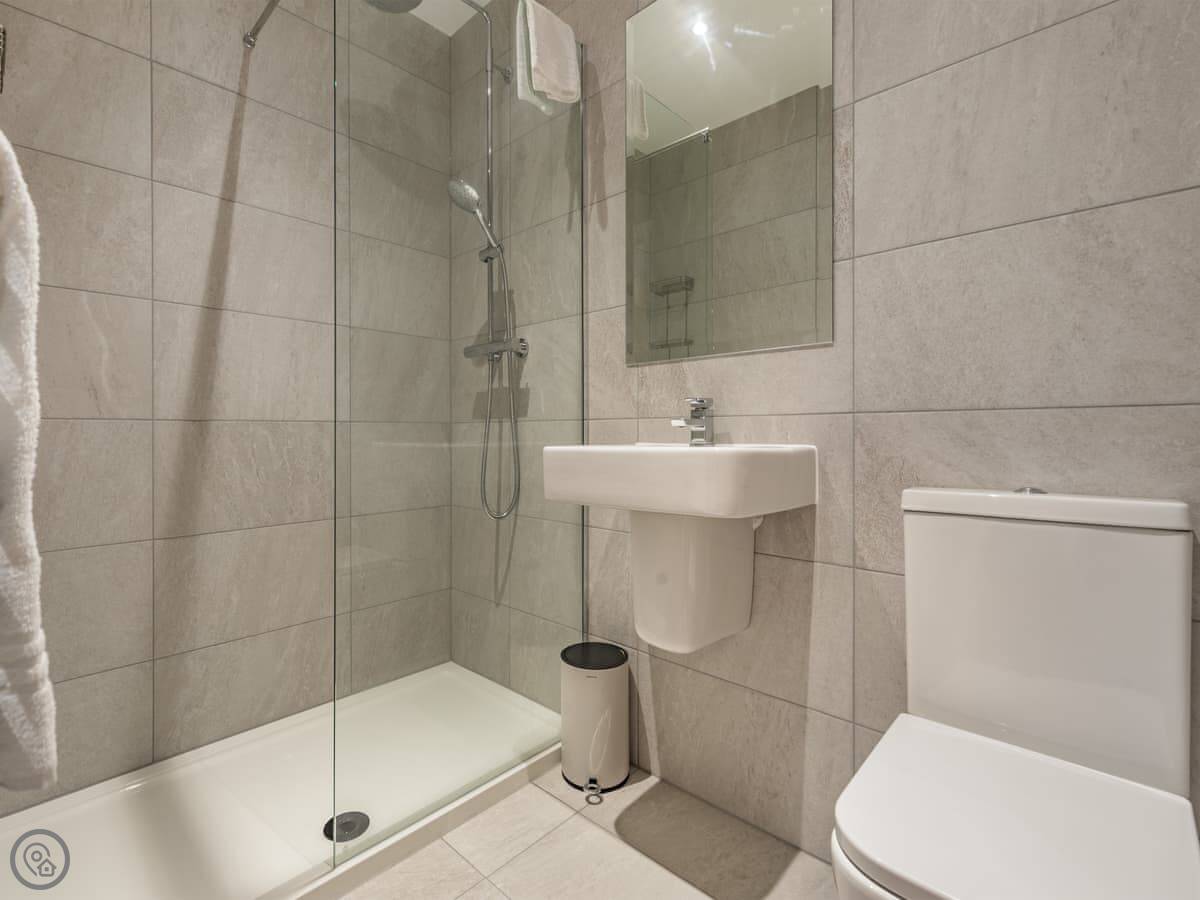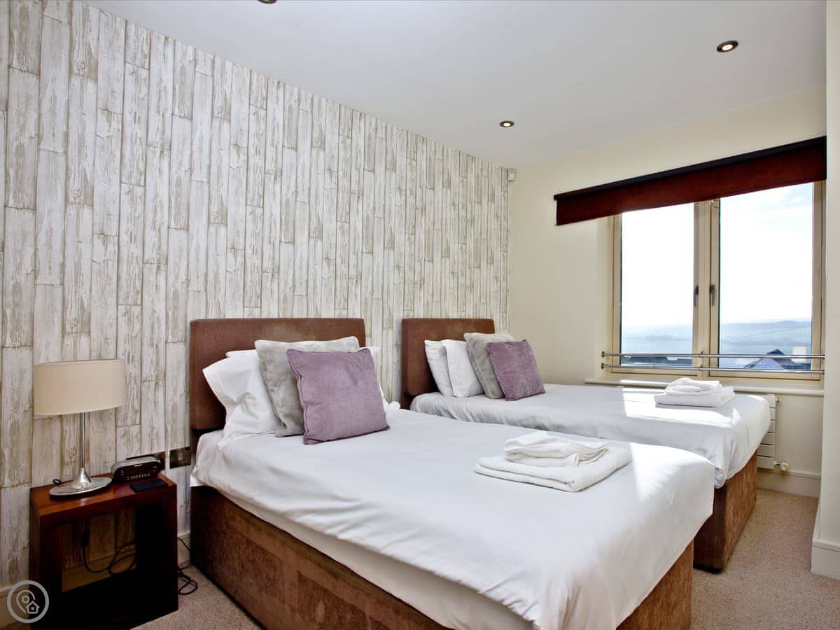It's for four people. Two bedrooms, one kingsize with its own shower room, and a twin room. There's a second bathroom with a shower over the bath. The place has a 4 Star rating, so it's a bit nicer than standard holiday lets.