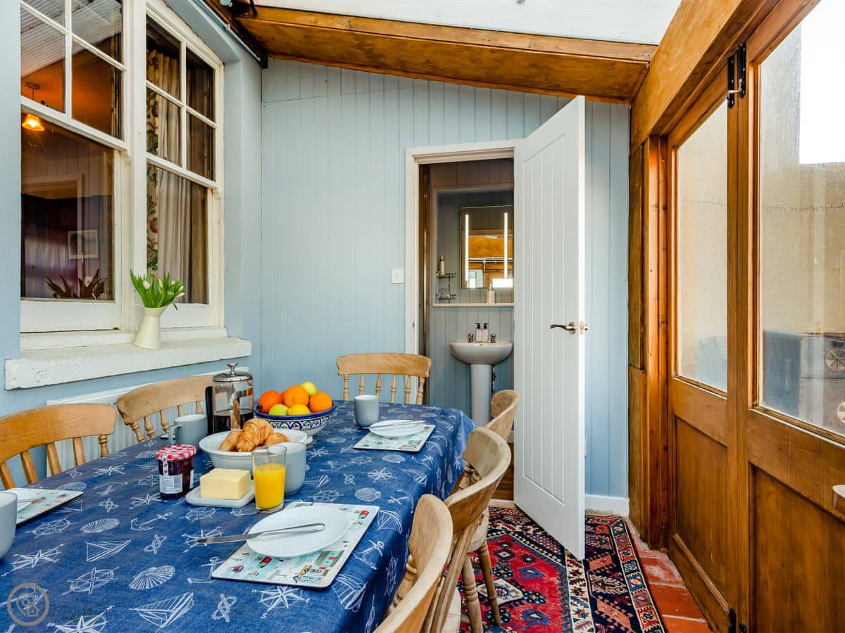 The main living room is called the lookout. It's up on the first floor. There's a wood burning stove in there. The kitchen is small, designed like a ship's galley. There's a separate dining room and a conservatory too.