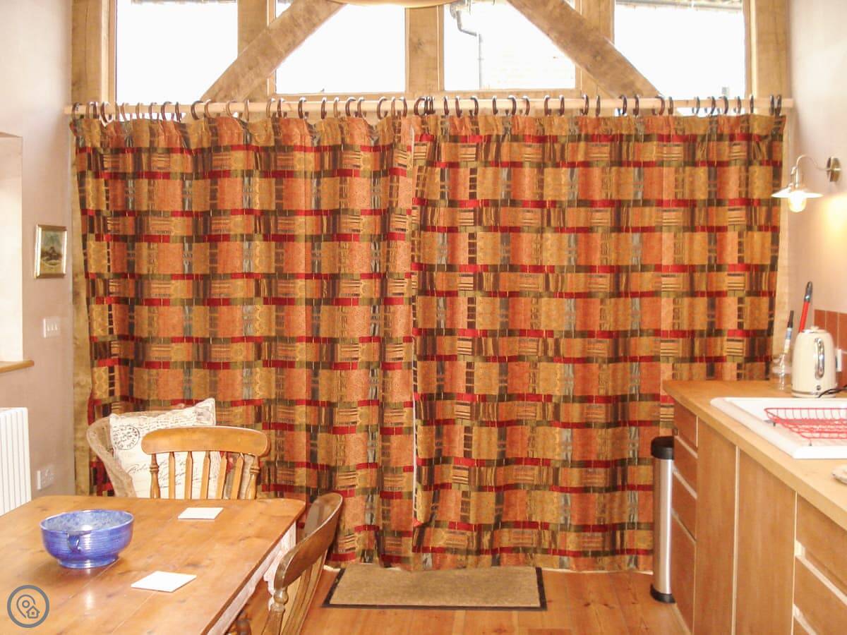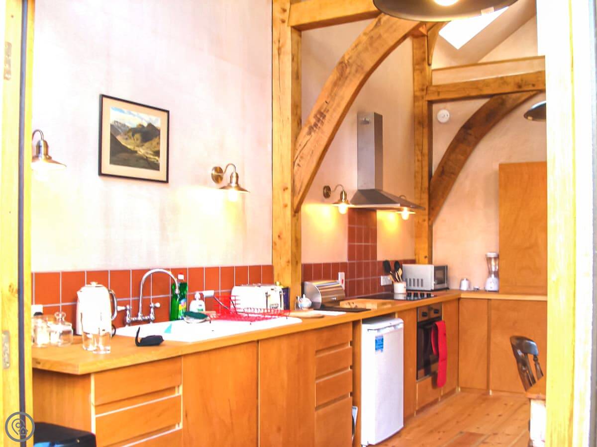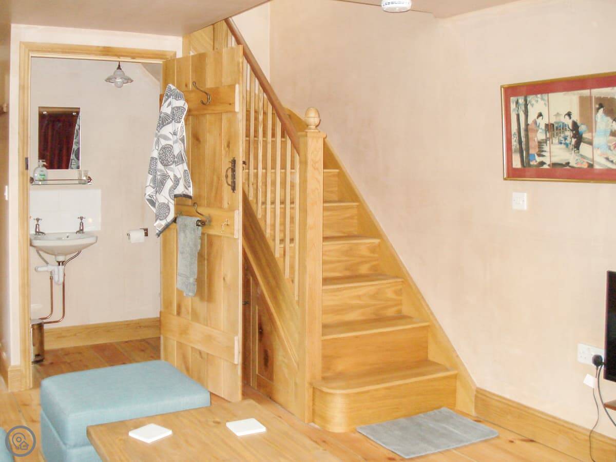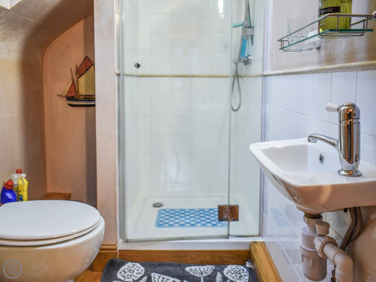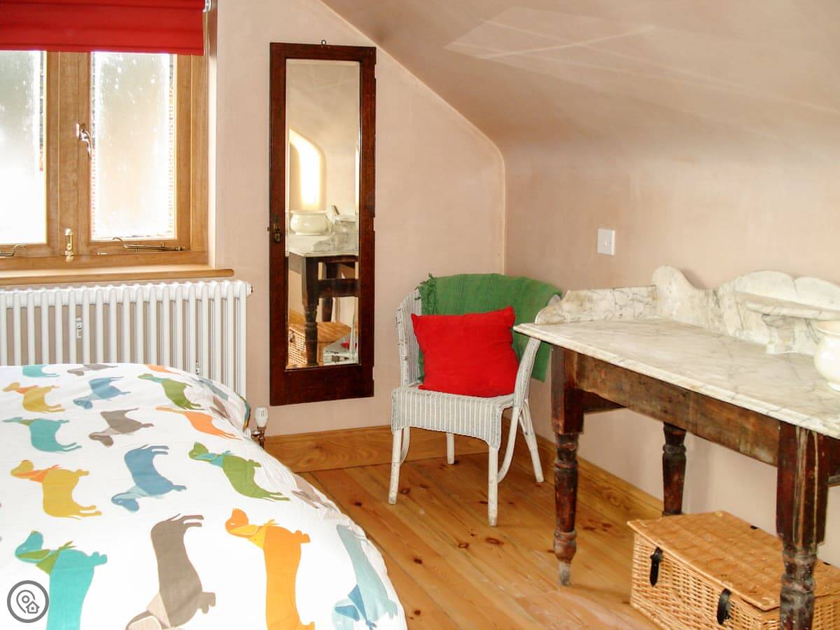 At the back, it has French doors opening onto a wisteria fringed patio, which in summer is a real sun spot. And tucked under the eaves, the charming double bedroom has sloping ceilings, so mind your head! The sofa bed in the living room sleeps two and there’s a convenient downstairs cloakroom, so although there’s only one en-suite shower room, four people can stay here.