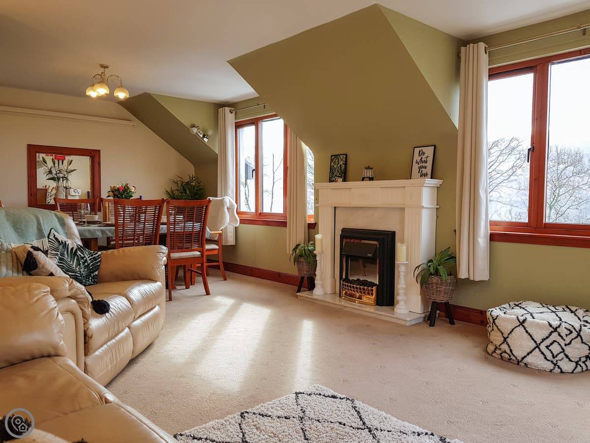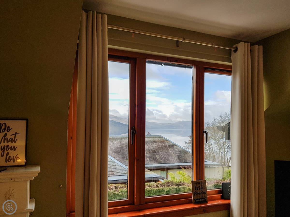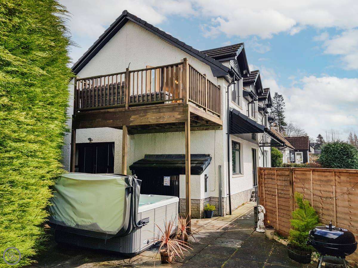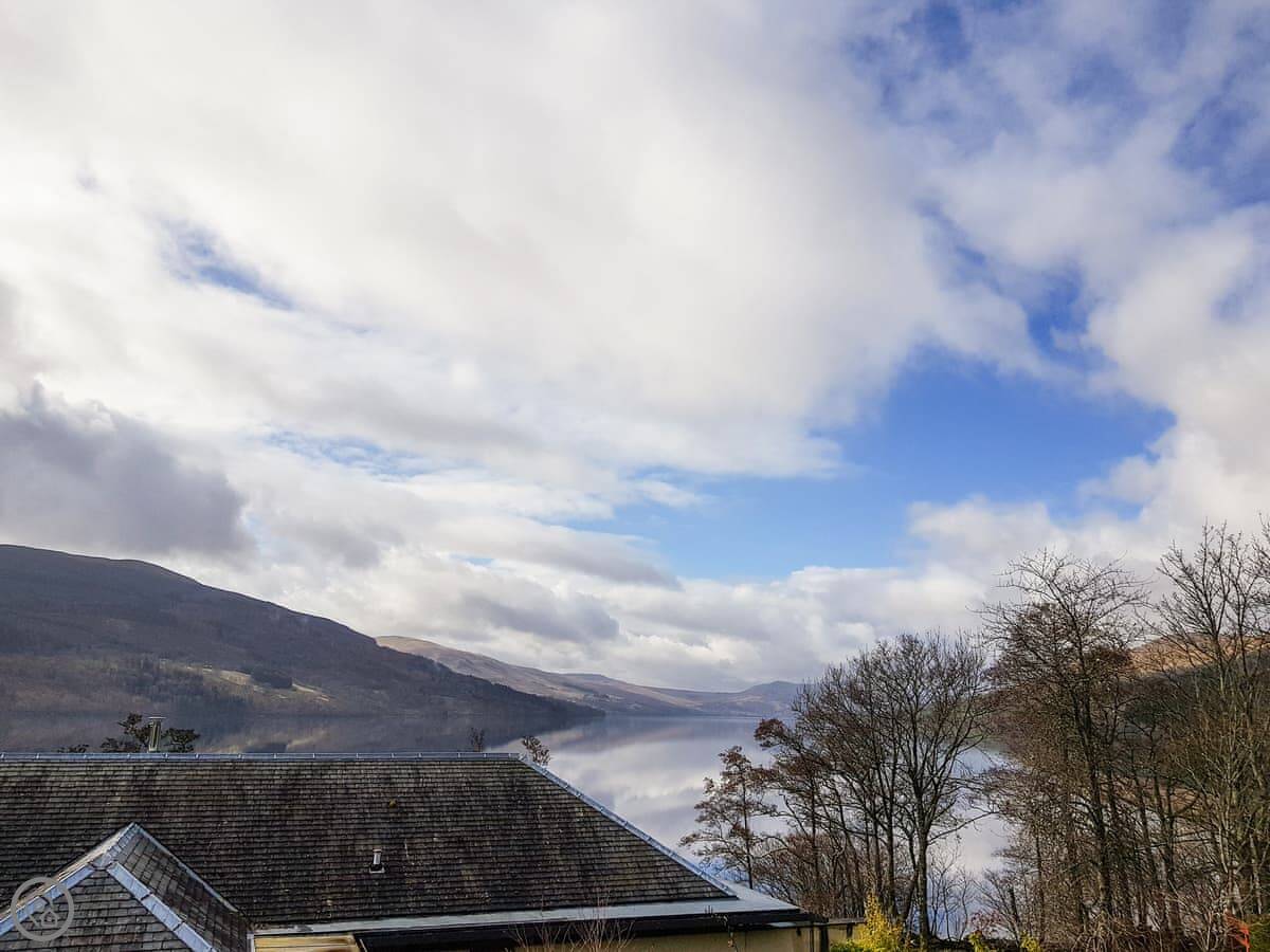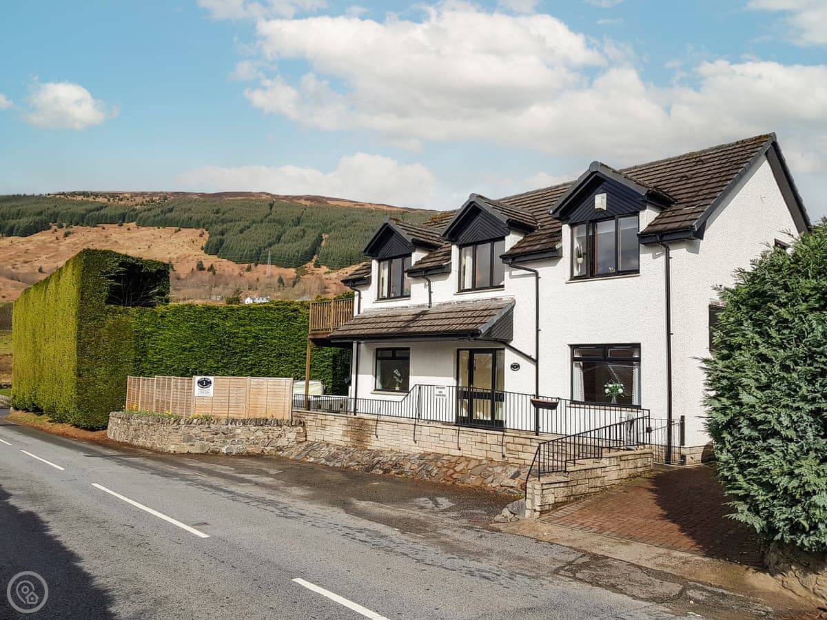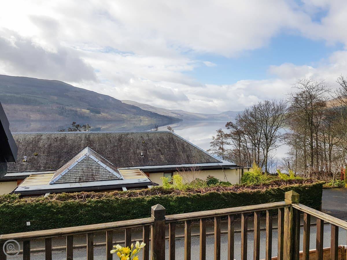 It's a detached house. Big. Sleeps ten, has five bedrooms and three bathrooms. Three of the bedrooms and two bathrooms are on the ground floor. The other two bedrooms, the main living room, and the kitchen are upstairs. The whole place is designed to look at the loch.