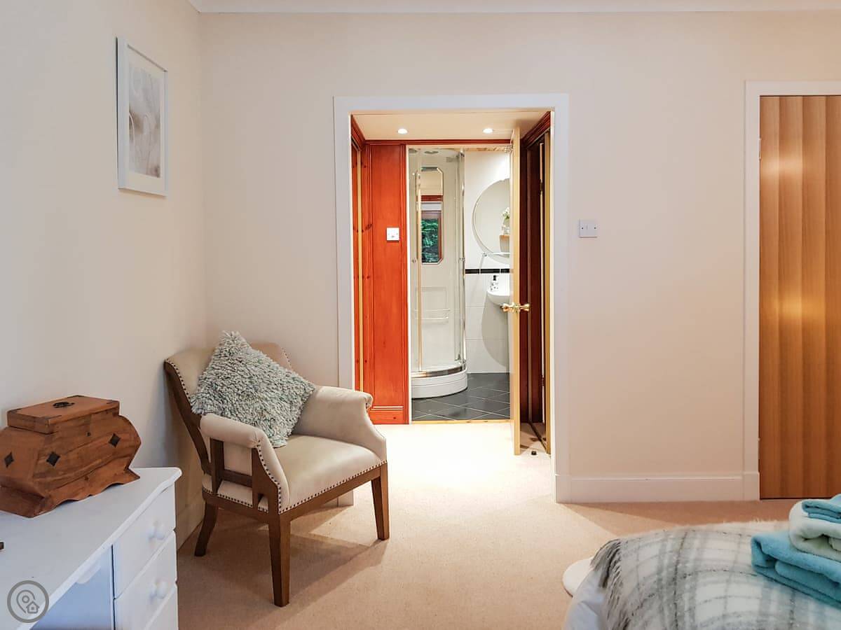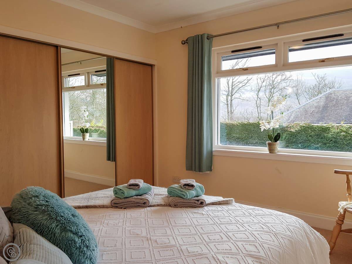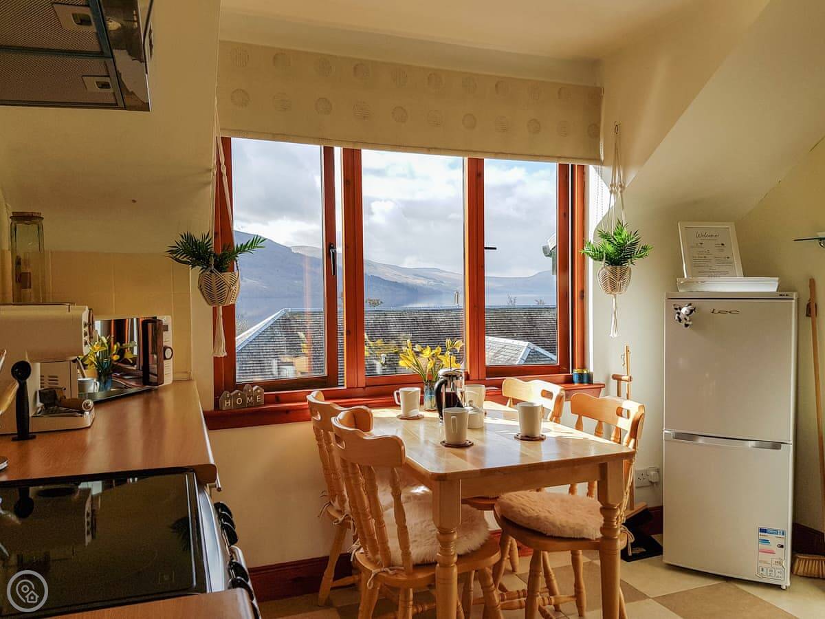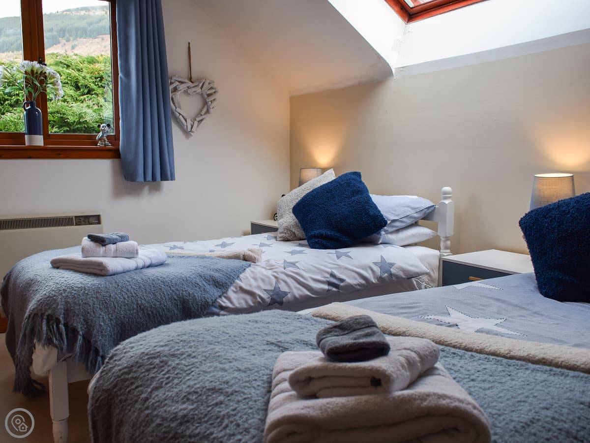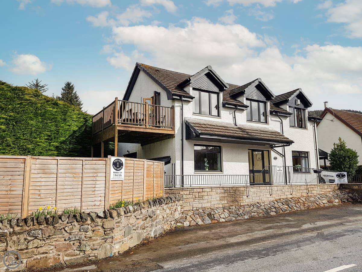 It's a detached house. Big. Sleeps ten, has five bedrooms and three bathrooms. Three of the bedrooms and two bathrooms are on the ground floor. The other two bedrooms, the main living room, and the kitchen are upstairs. The whole place is designed to look at the loch.
