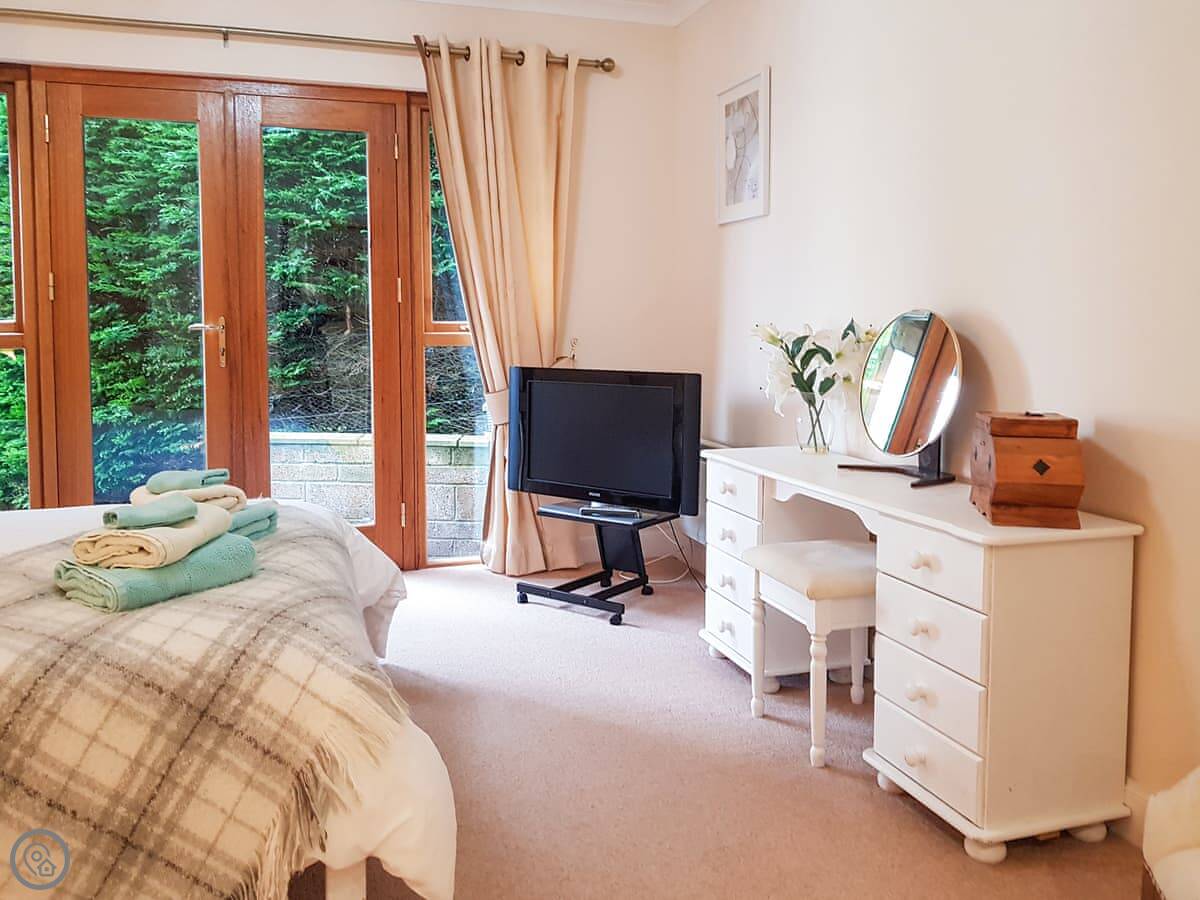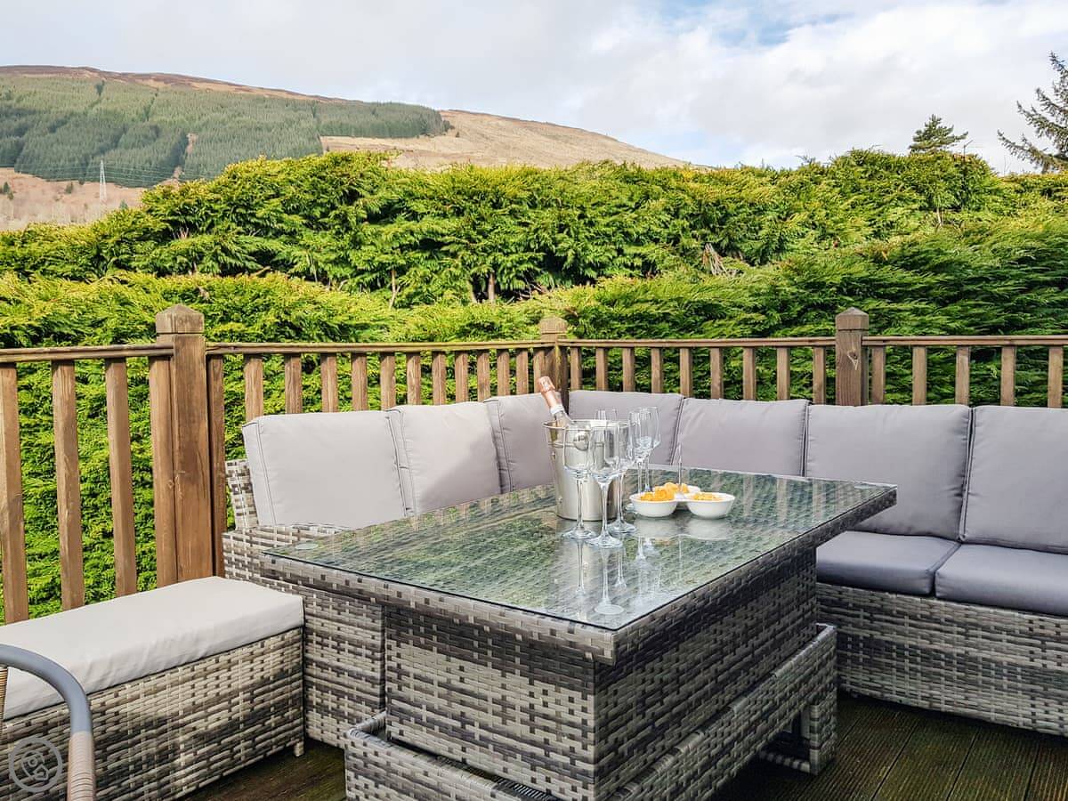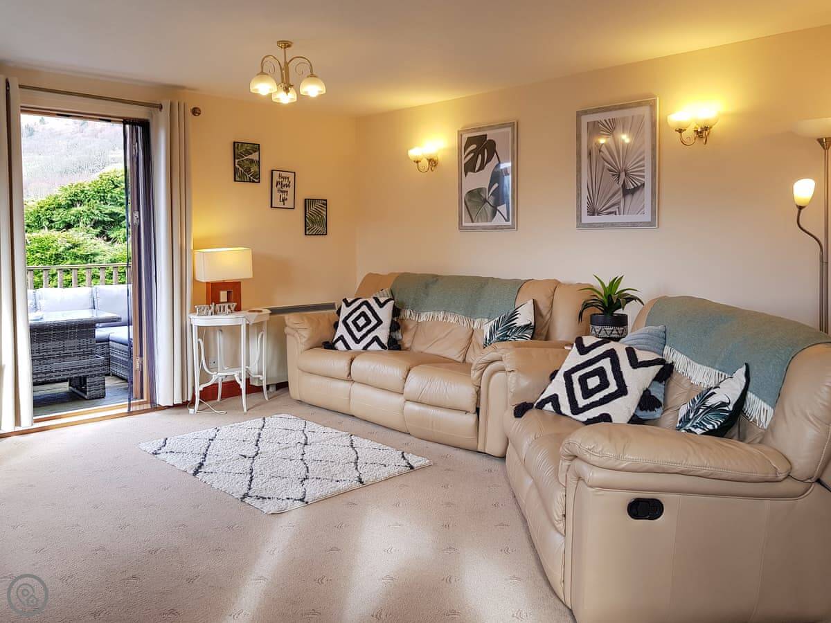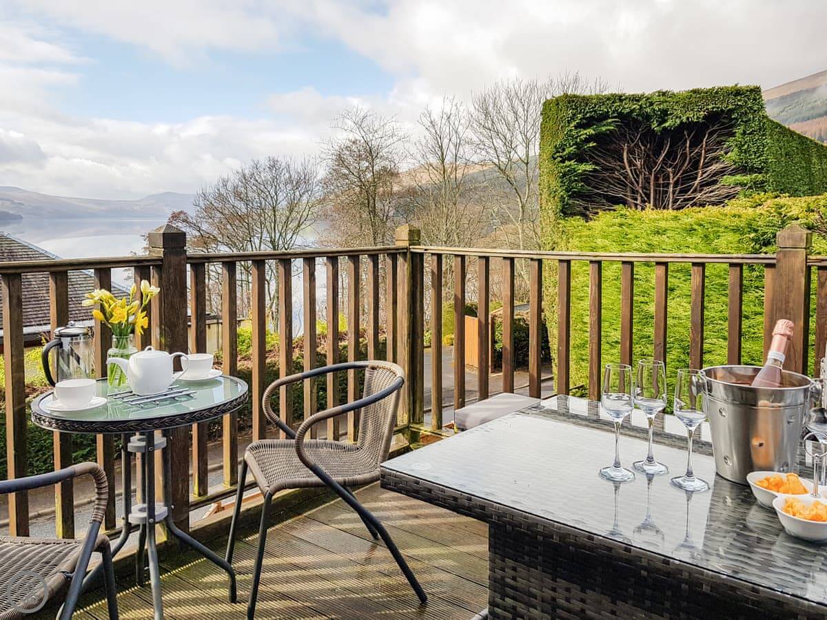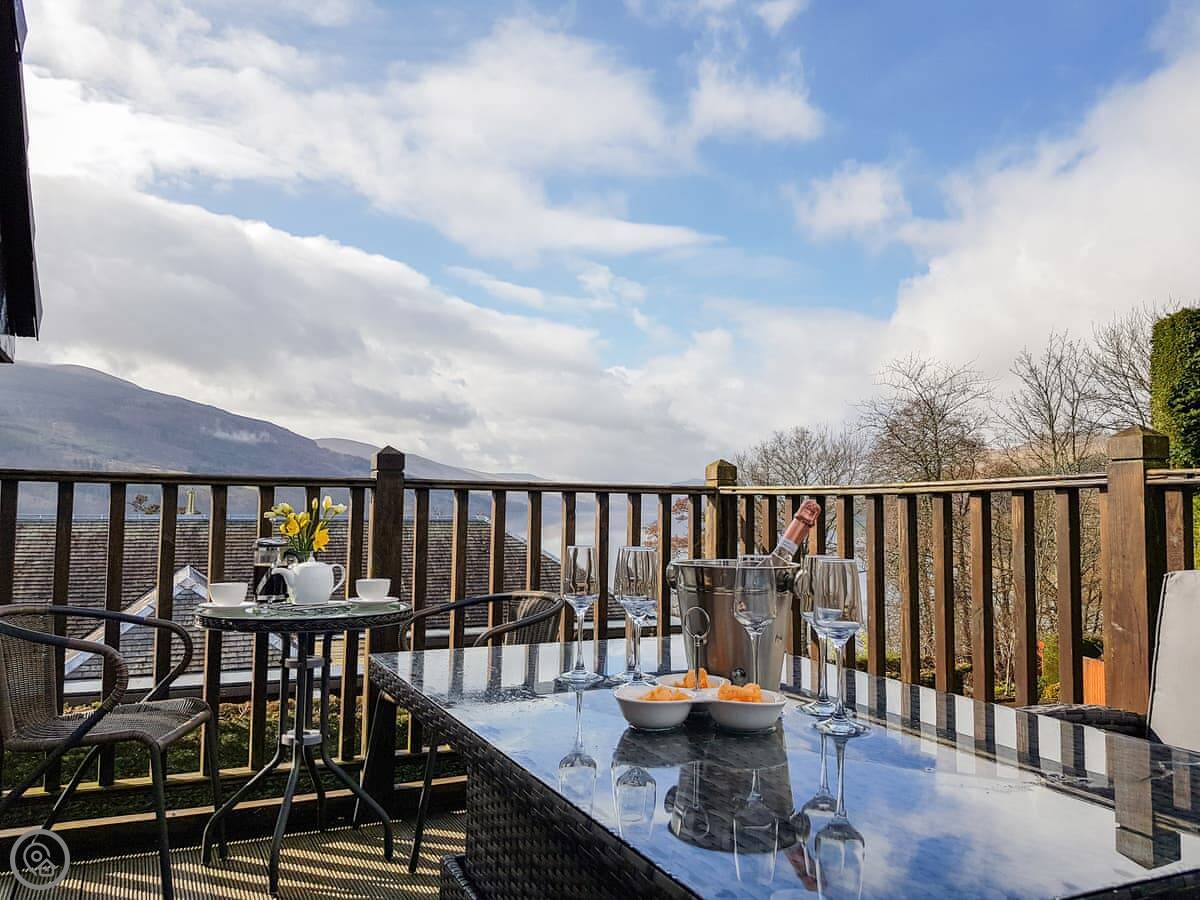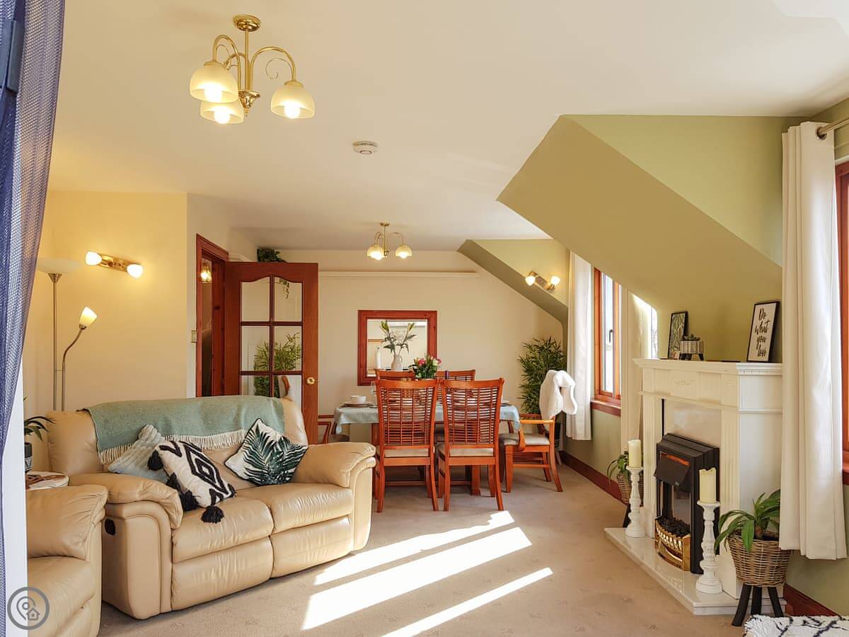 It's a detached house. Big. Sleeps ten, has five bedrooms and three bathrooms. Three of the bedrooms and two bathrooms are on the ground floor. The other two bedrooms, the main living room, and the kitchen are upstairs. The whole place is designed to look at the loch.