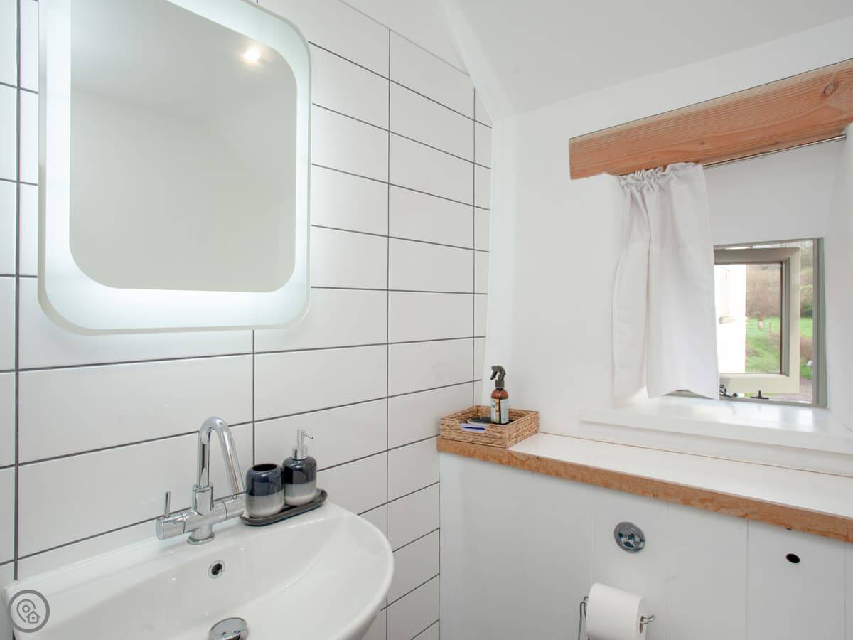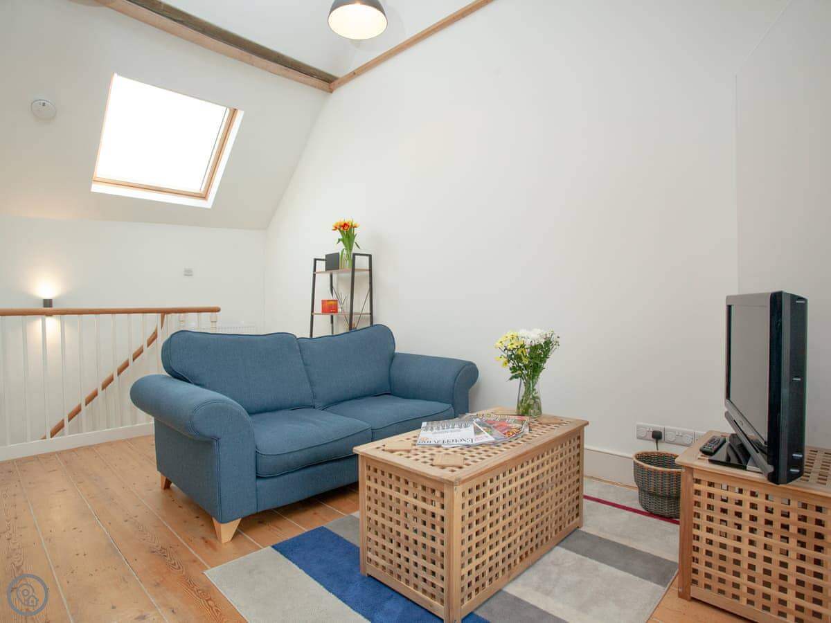The layout is a bit unusual. It's upside down. The bedroom is on the ground floor. The bathroom and the main living space, which is all open-plan, are upstairs. That means the living room gets a lot of light and looks out over the yard.