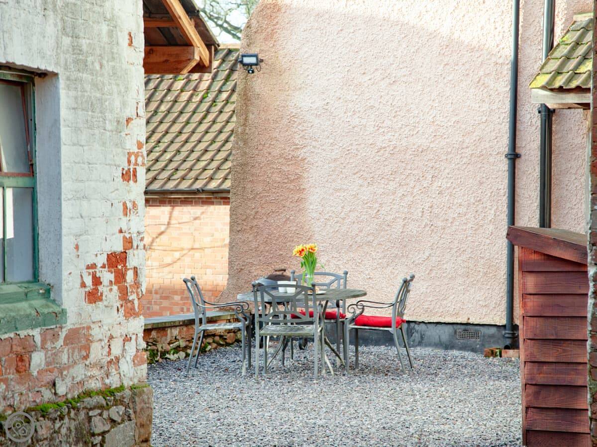 Outside, there's a seating area you can use. It's shared with us, but we're often busy with the farm. There's a charcoal BBQ there too.