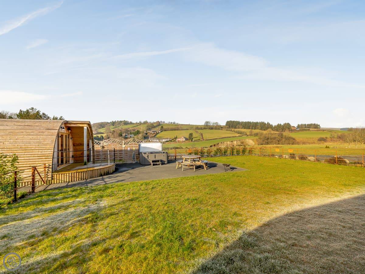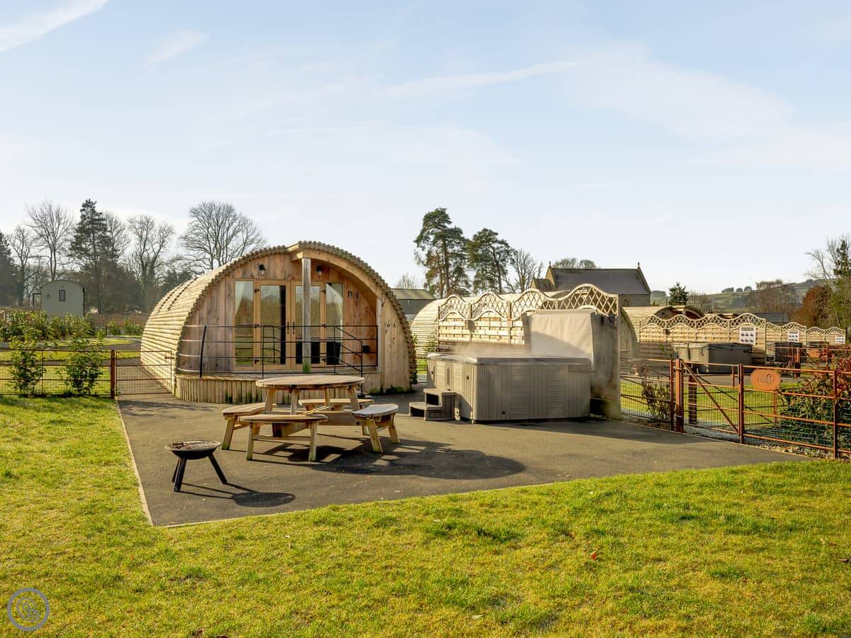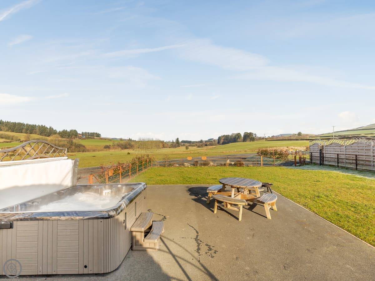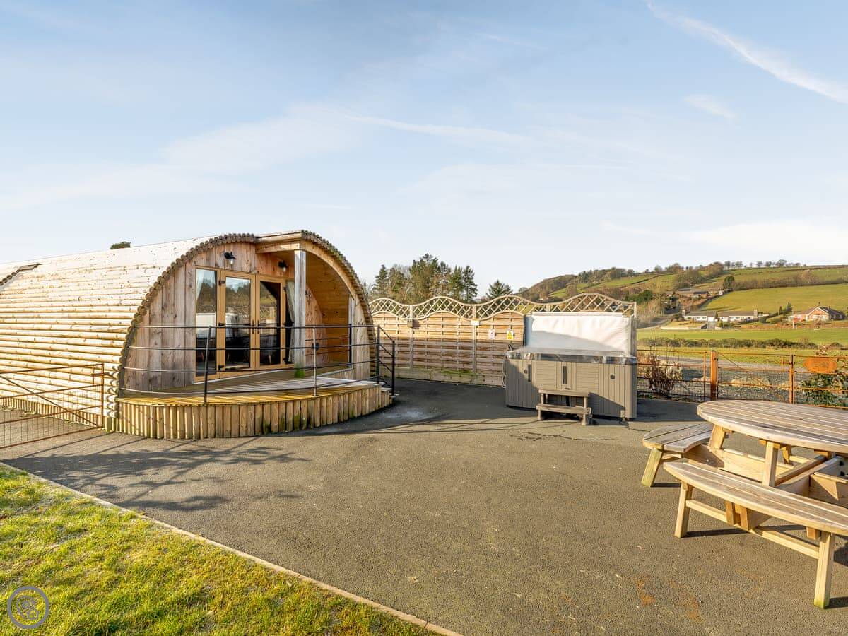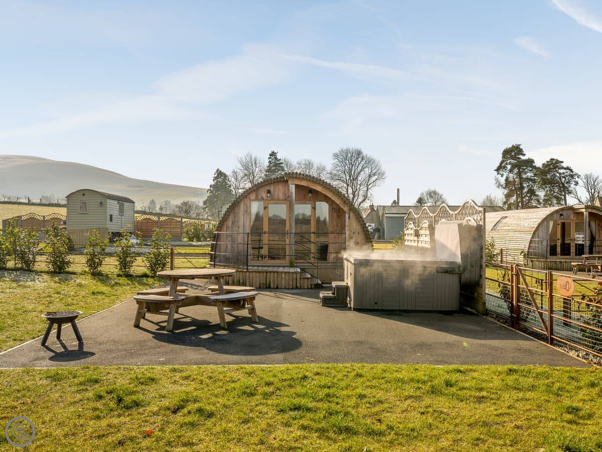 It's got its own enclosed garden and a private hot tub. The layout is all on the ground floor. Everything is open plan inside. There's a dishwasher and WiFi. Bedding and towels are included. Parking is right there.