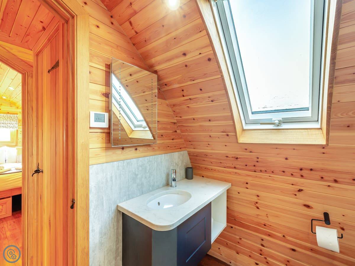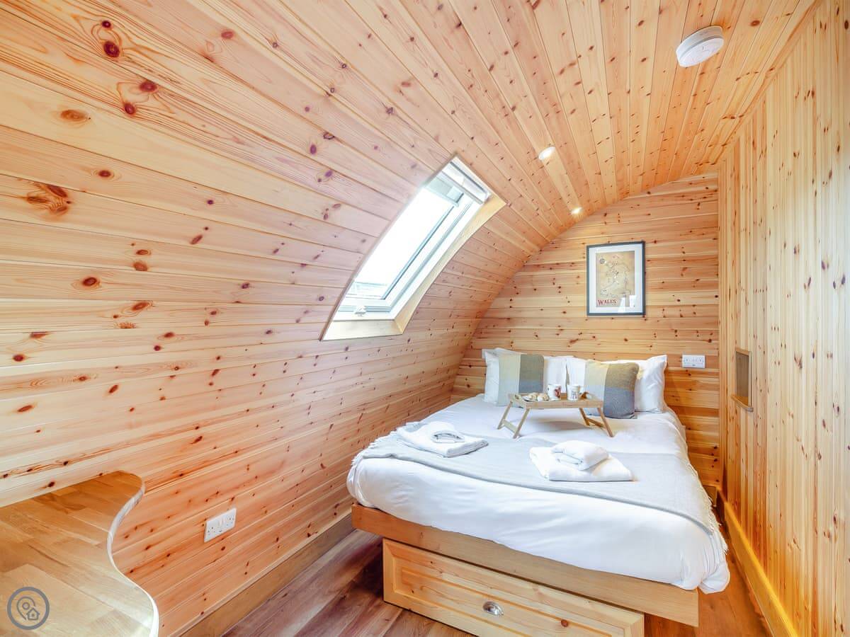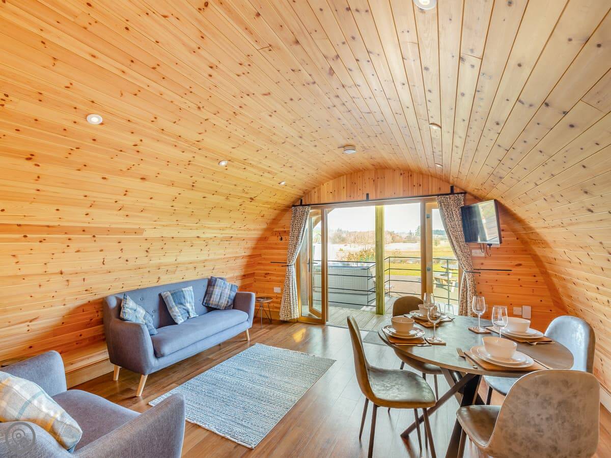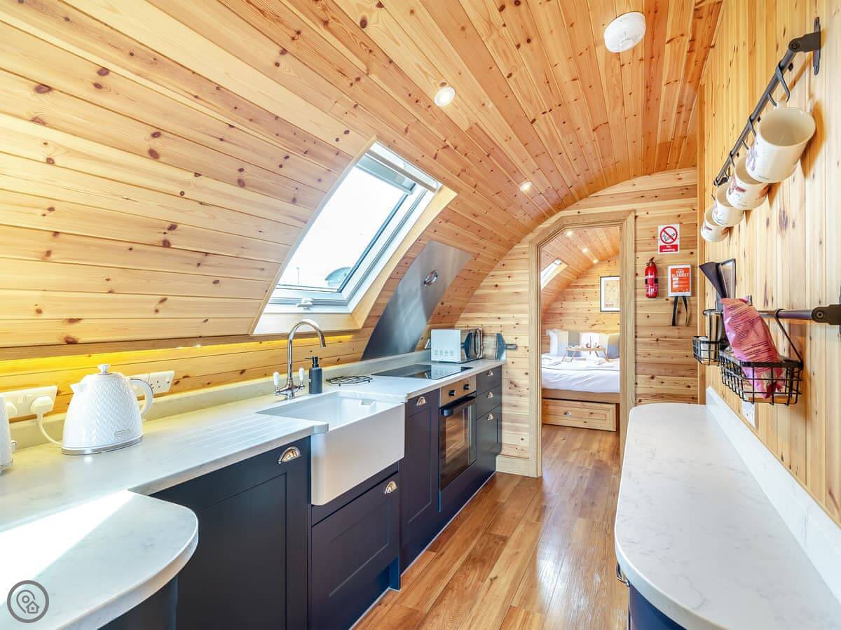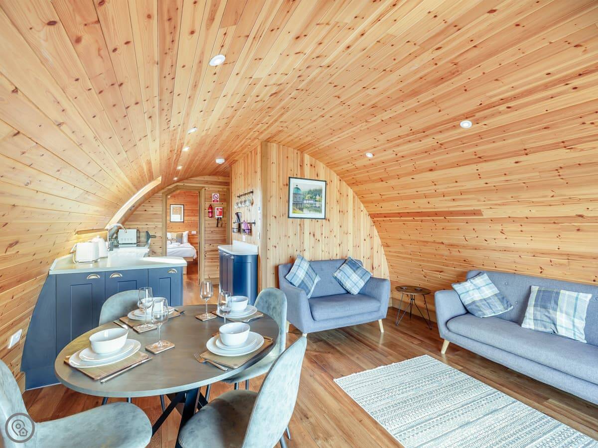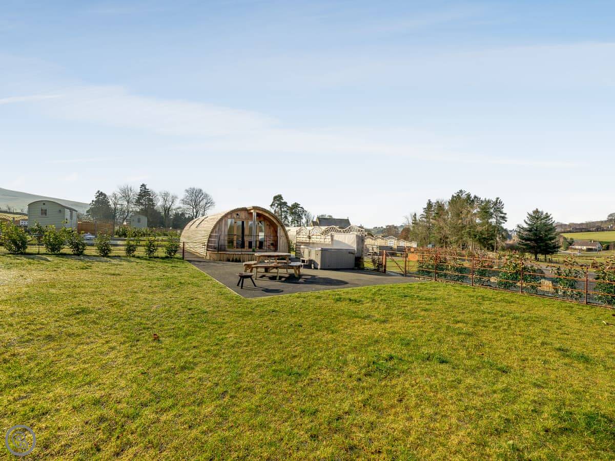It's got its own enclosed garden and a private hot tub. The layout is all on the ground floor. Everything is open plan inside. There's a dishwasher and WiFi. Bedding and towels are included. Parking is right there.