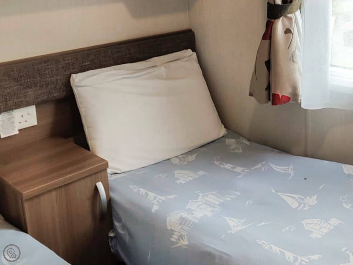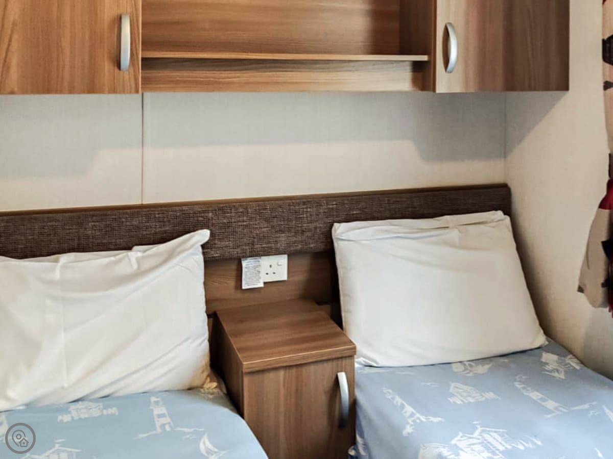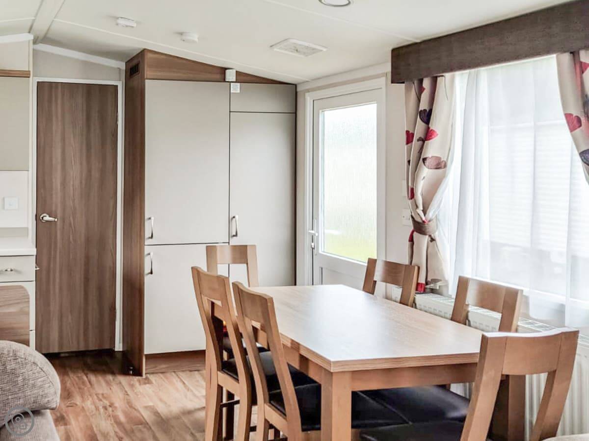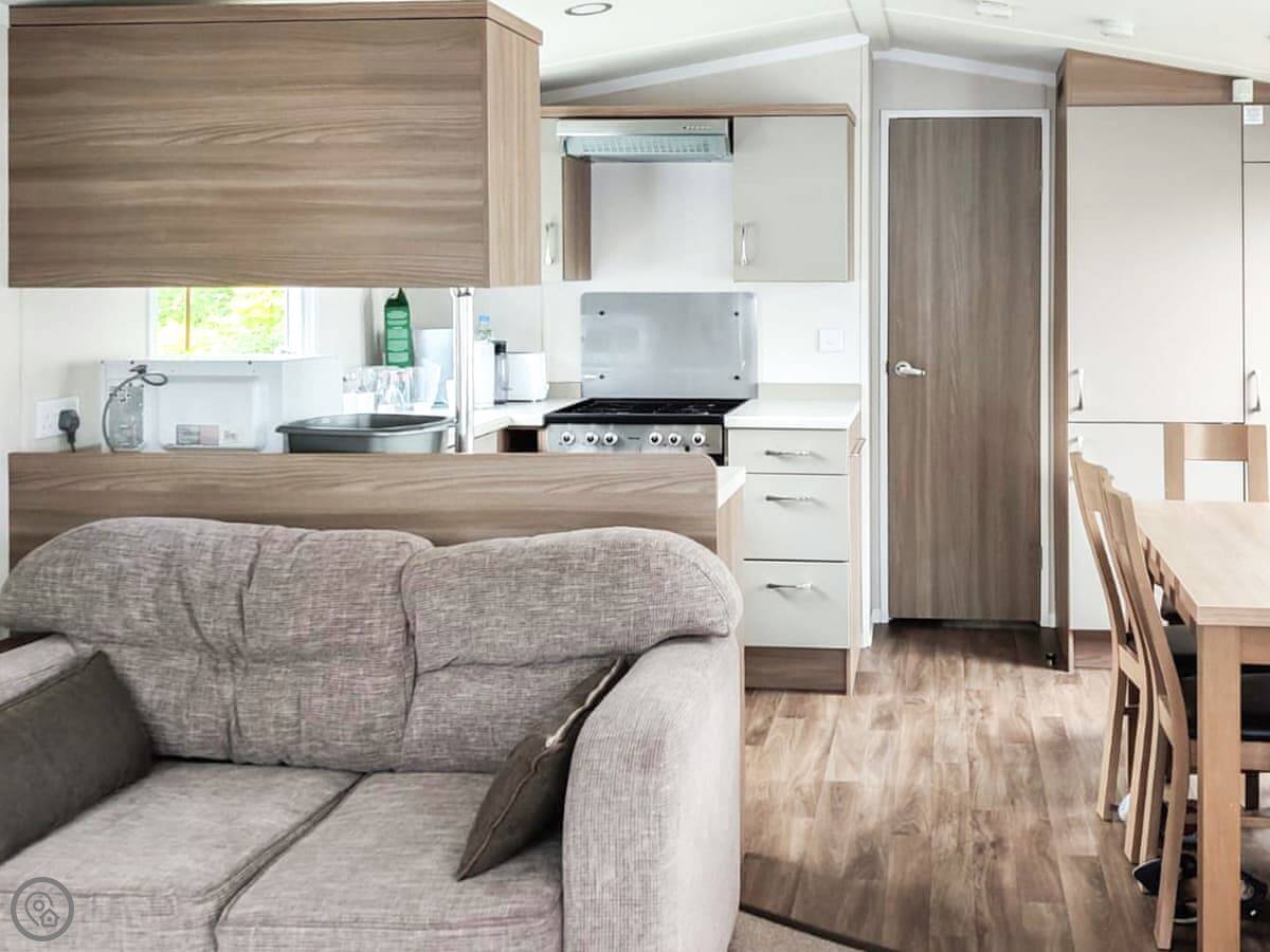 It sleeps eight. There are three bedrooms and one bathroom. It's got a 4 Star rating. It's a holiday park caravan, so it's roomy and practical. The living and kitchen area is open plan.