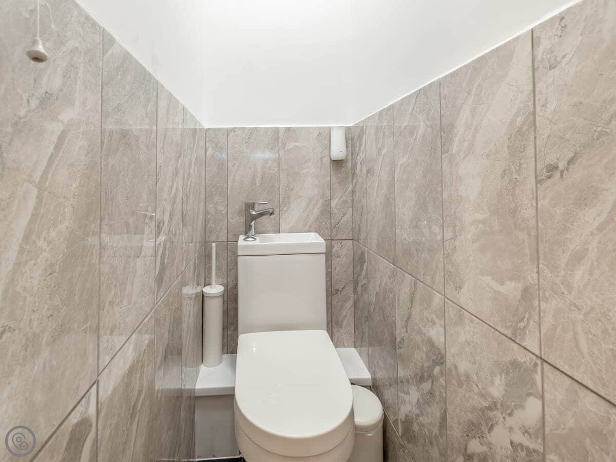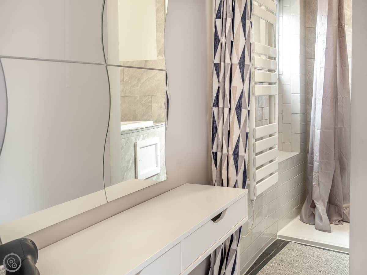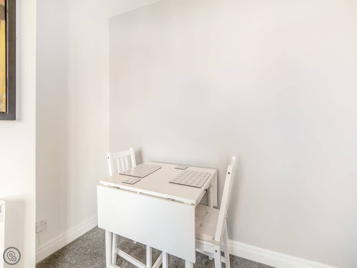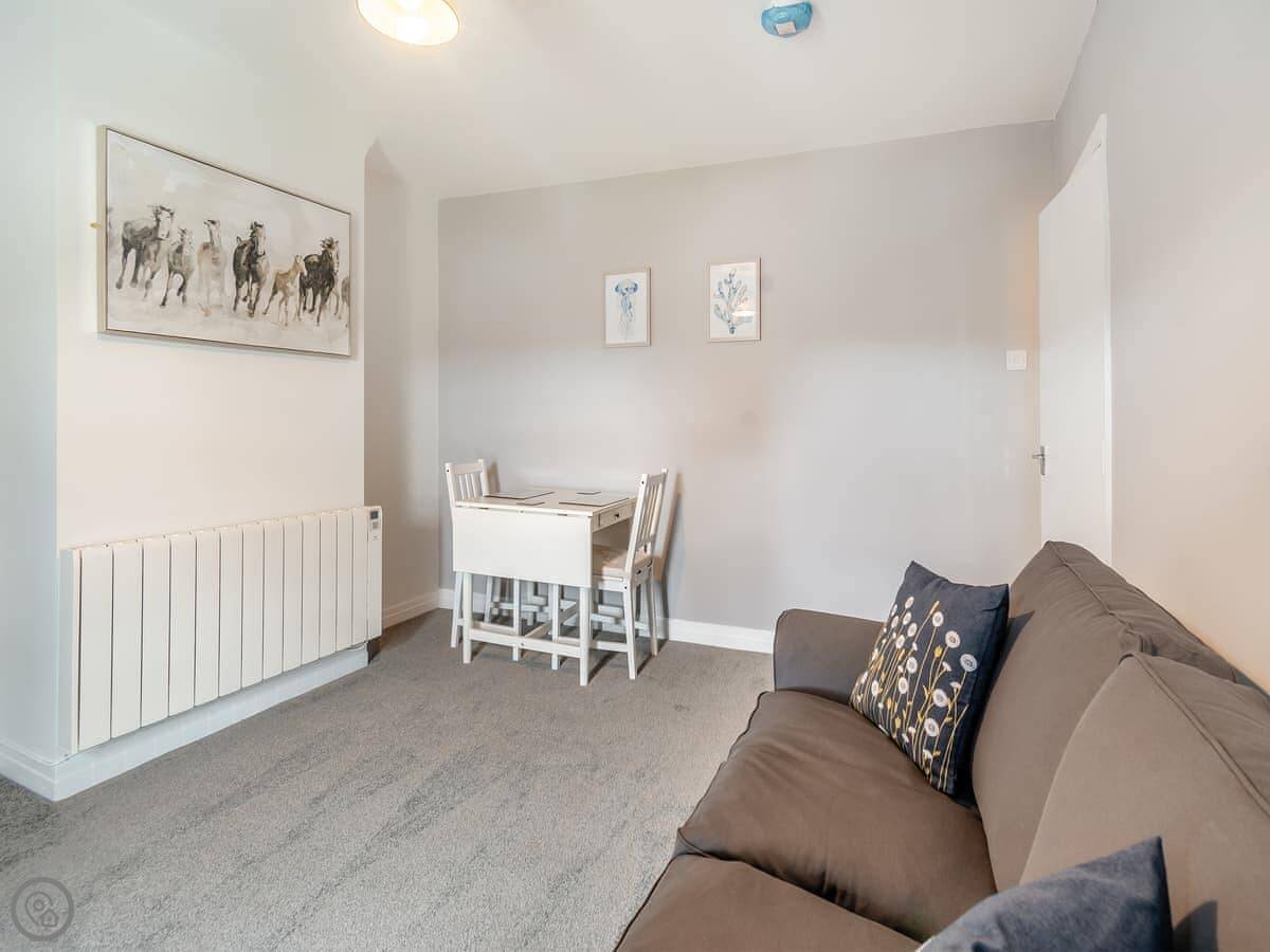 It's a 4 Star place. That means it's nicely done and comfortable. There's a kingsize bed, a separate shower room, and a small kitchen that has what you need. The living room has a sofa and a TV. You share the little outdoor seating area at the back with the flat next door, Bluebell Apartment. It's a quiet back street.