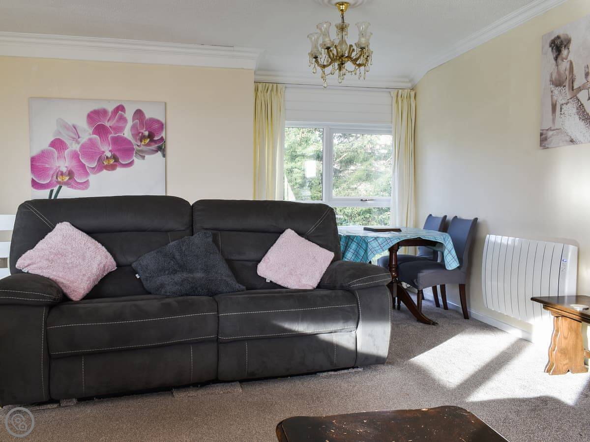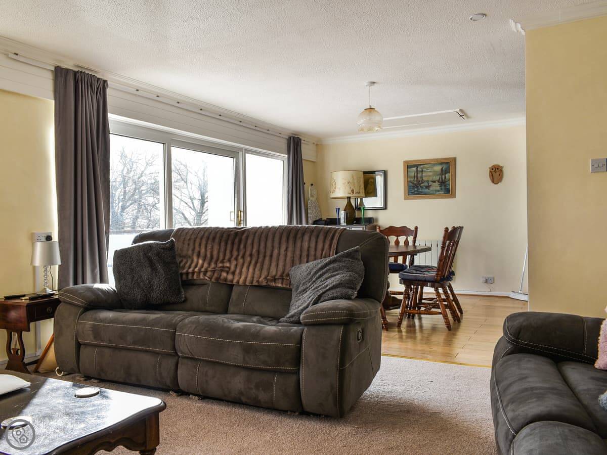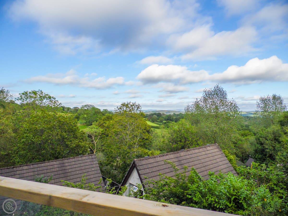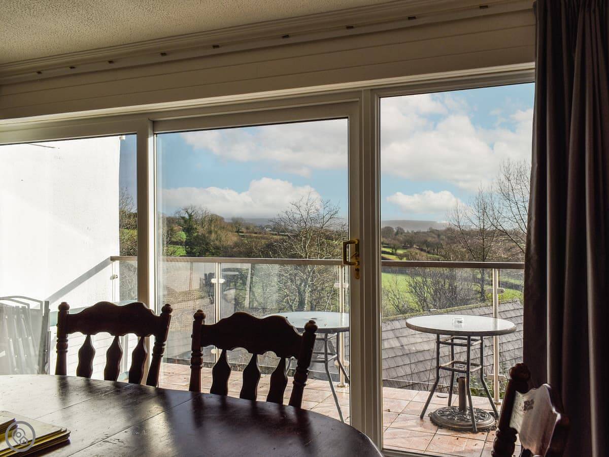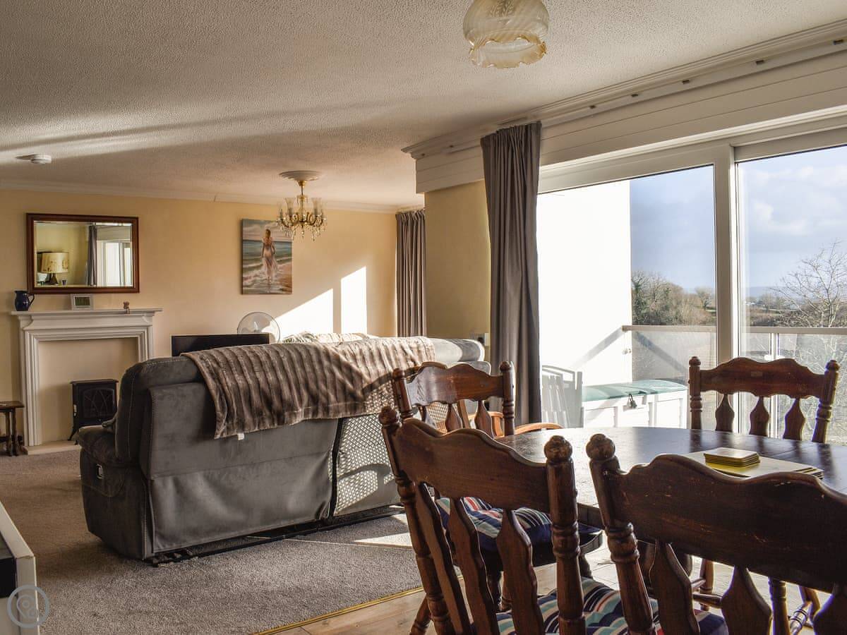 It sleeps five. There are two bedrooms and two bathrooms, which is handy. It's got a 4 Star rating, so everything is in good order. One thing to know: the living area is upstairs. You've got two sofas, a dining table, and doors out to a private balcony. The view from there is over fields and countryside. It's a good spot for a sunset.