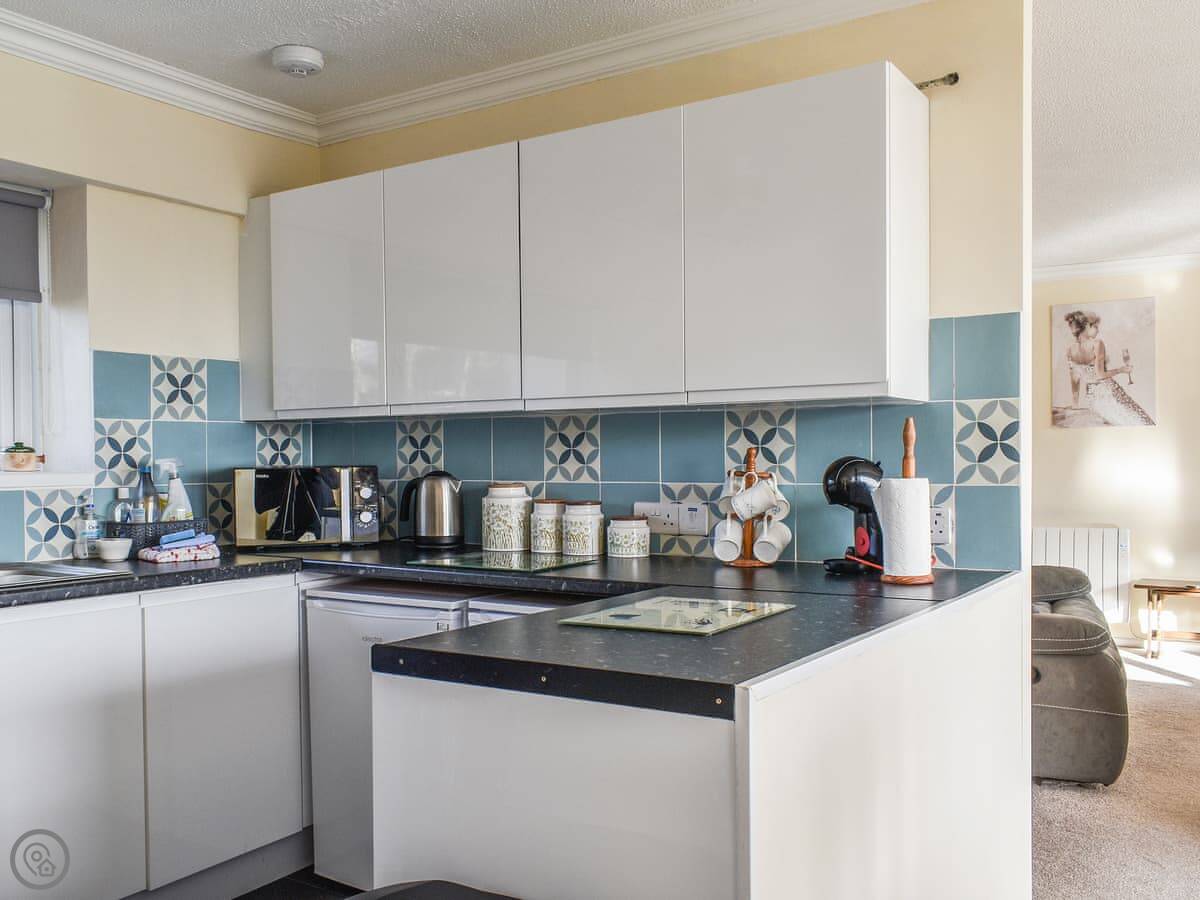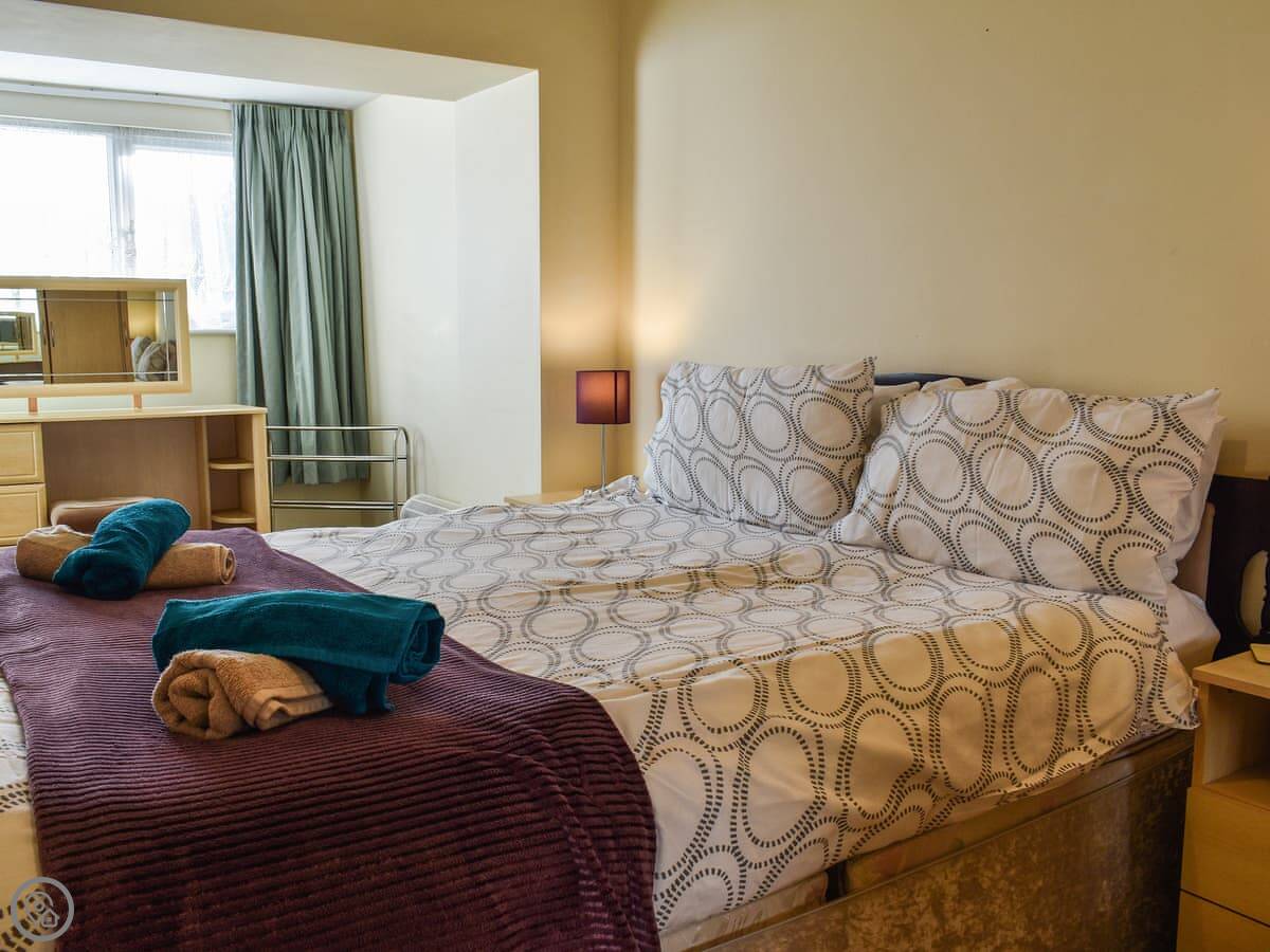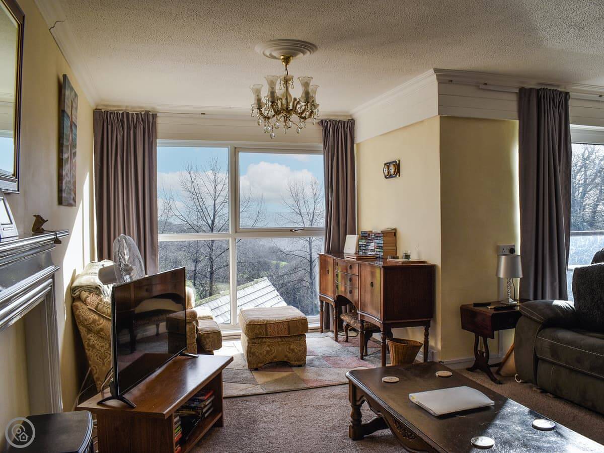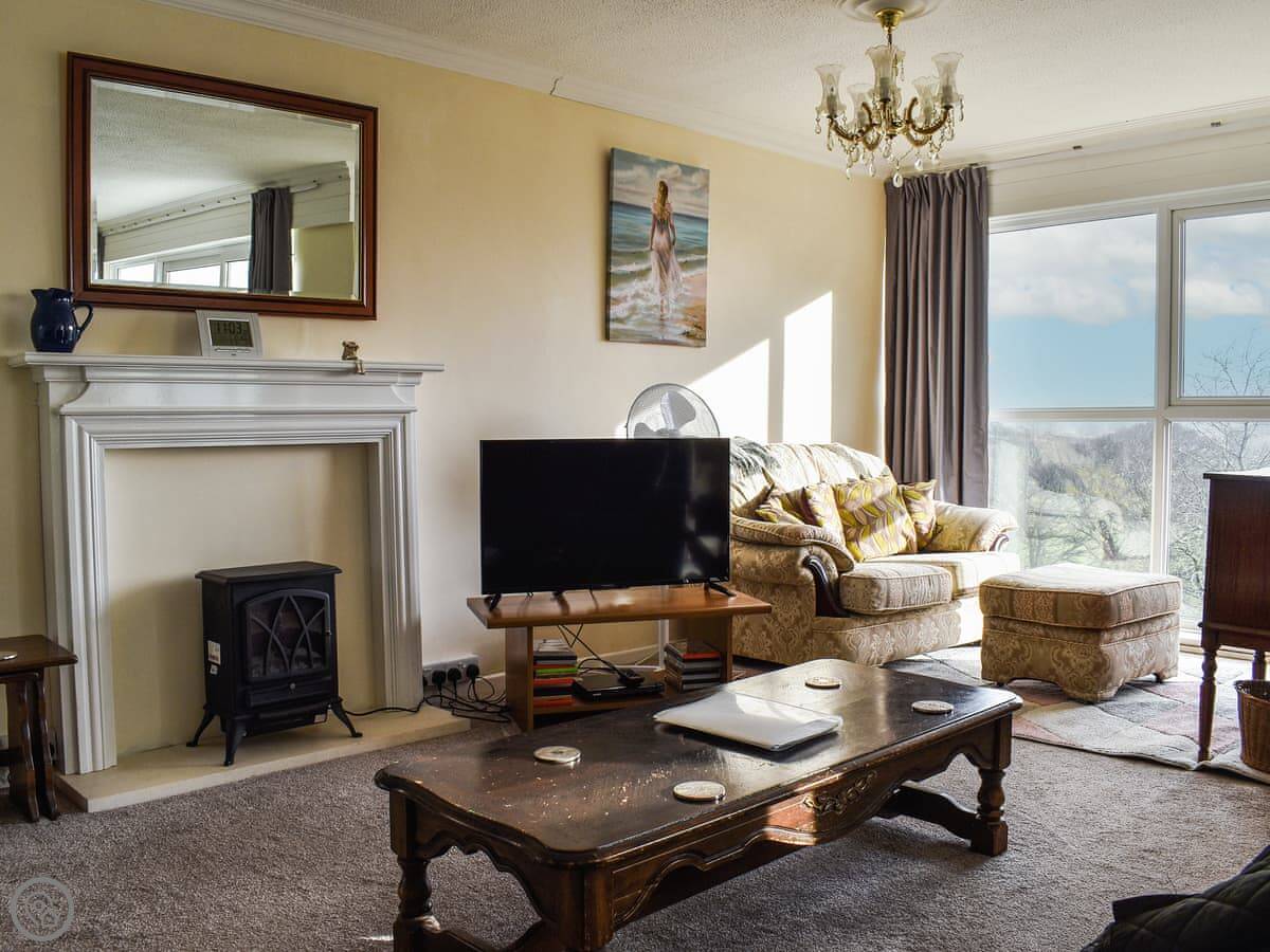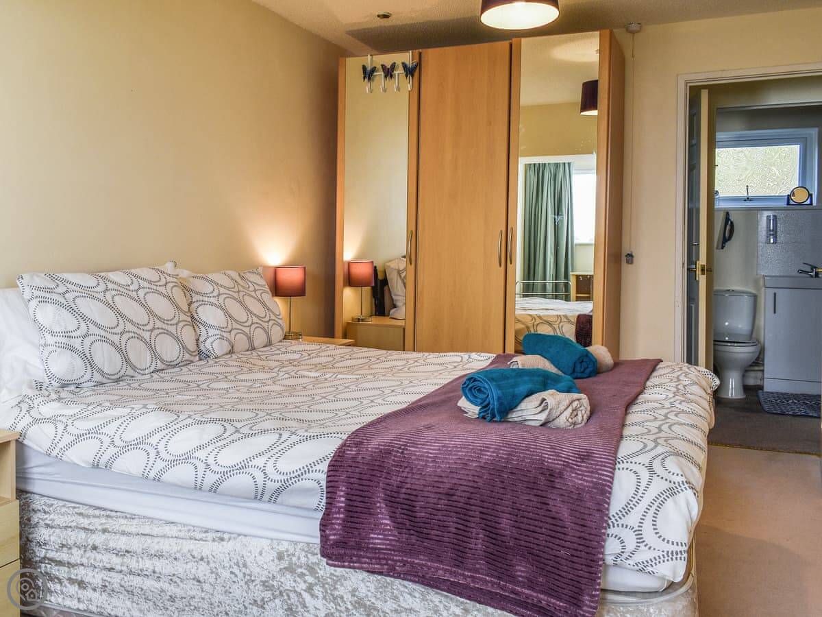 It sleeps five. There are two bedrooms and two bathrooms, which is handy. It's got a 4 Star rating, so everything is in good order. One thing to know: the living area is upstairs. You've got two sofas, a dining table, and doors out to a private balcony. The view from there is over fields and countryside. It's a good spot for a sunset.