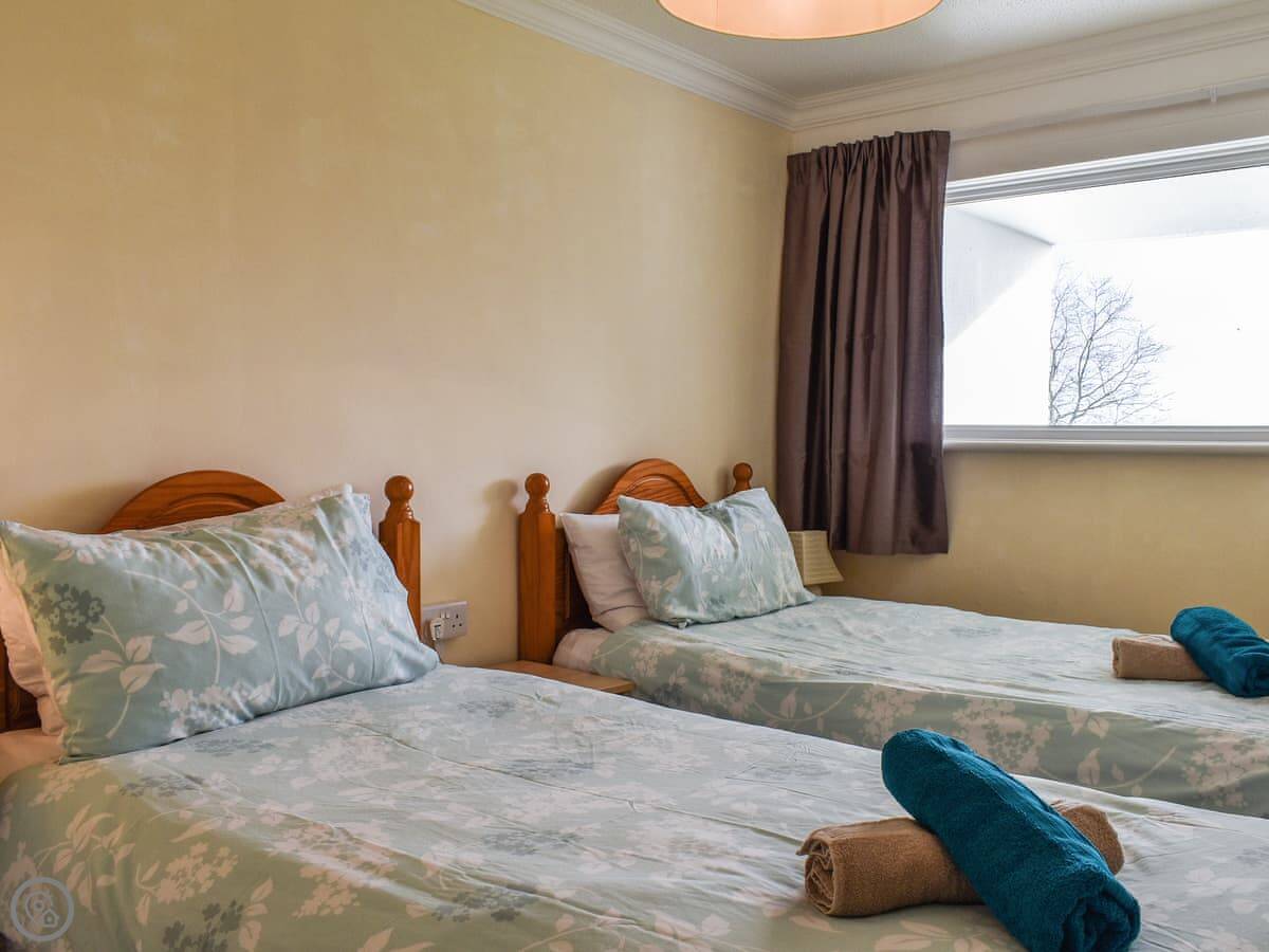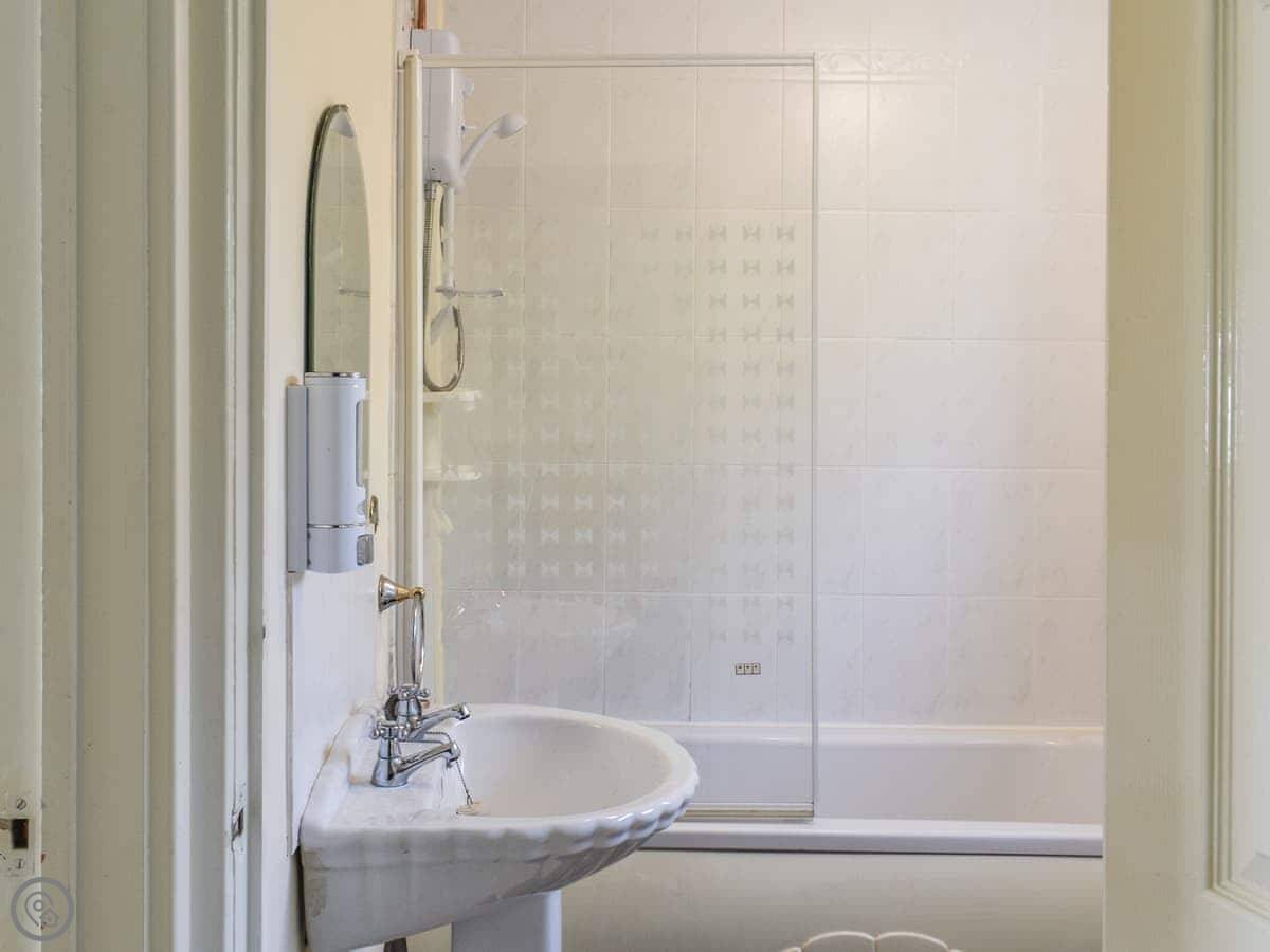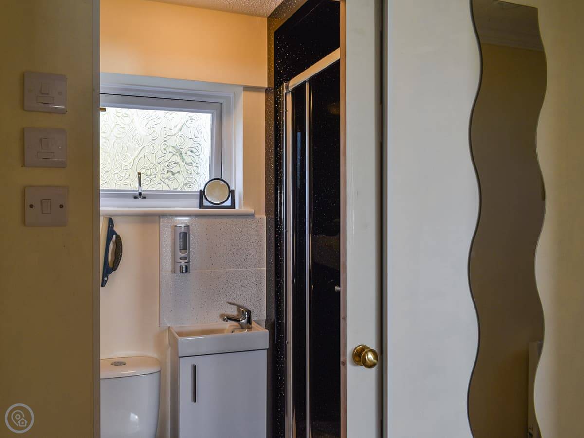The two bedrooms and the bathrooms are on the ground floor. The main bathroom has a bath with a shower over it, and the other has a walk-in shower.