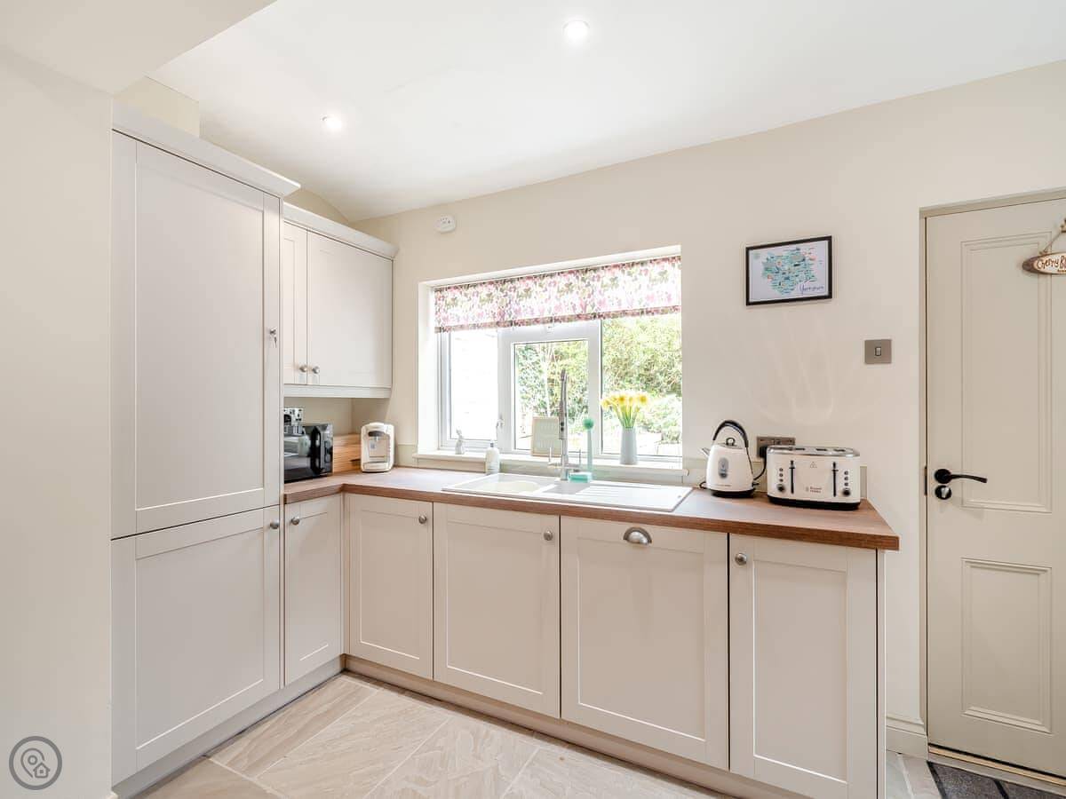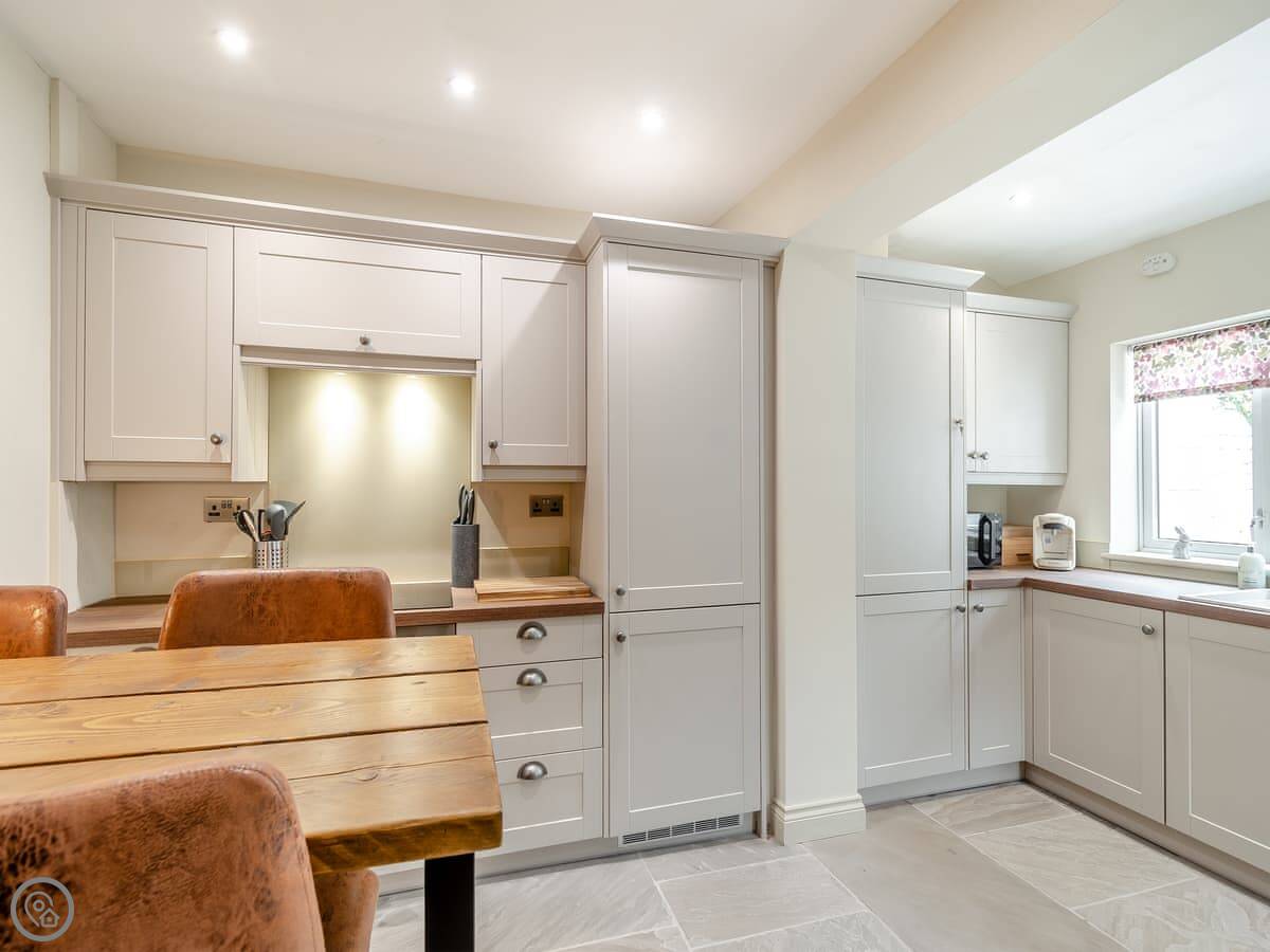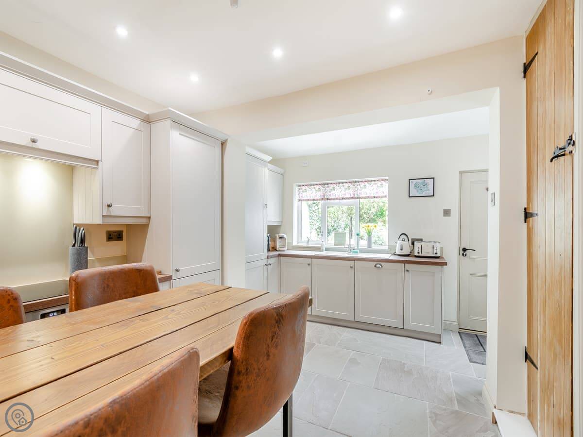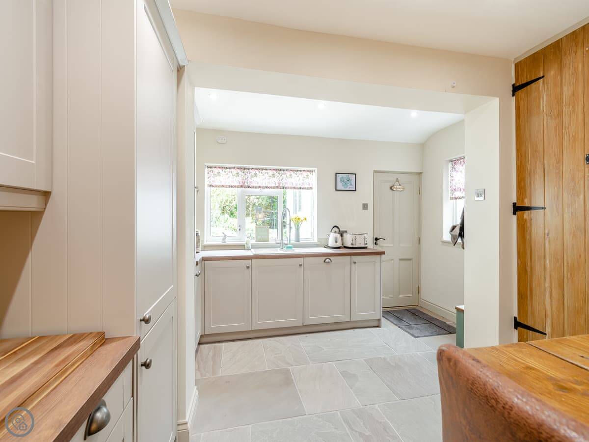 Downstairs, there's a living room with a wood burner. We provide the first basket of logs. The kitchen is new and has a dishwasher. There's a small boot room off the back for coats and boots. You can store bikes there.