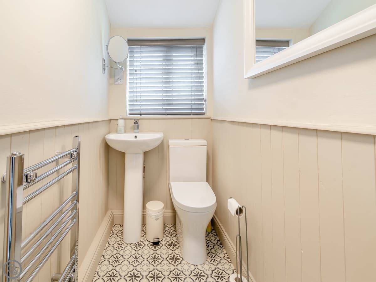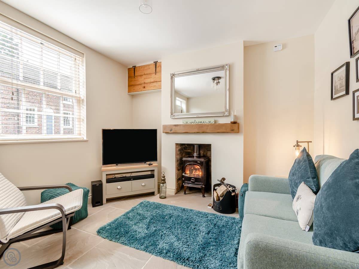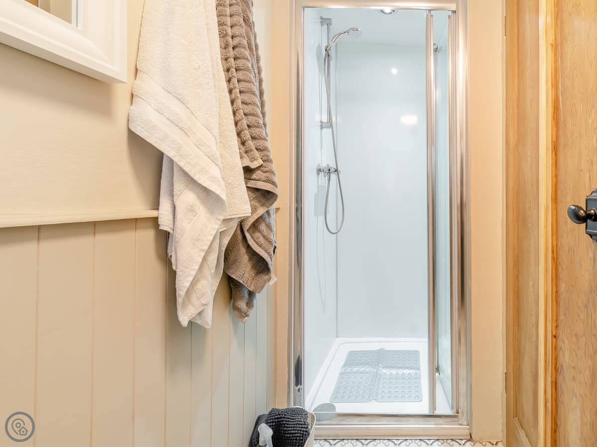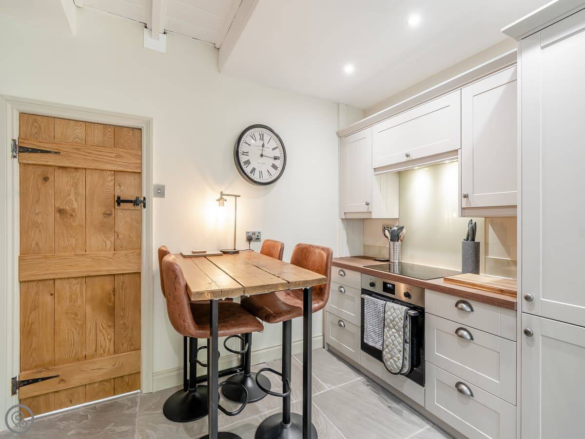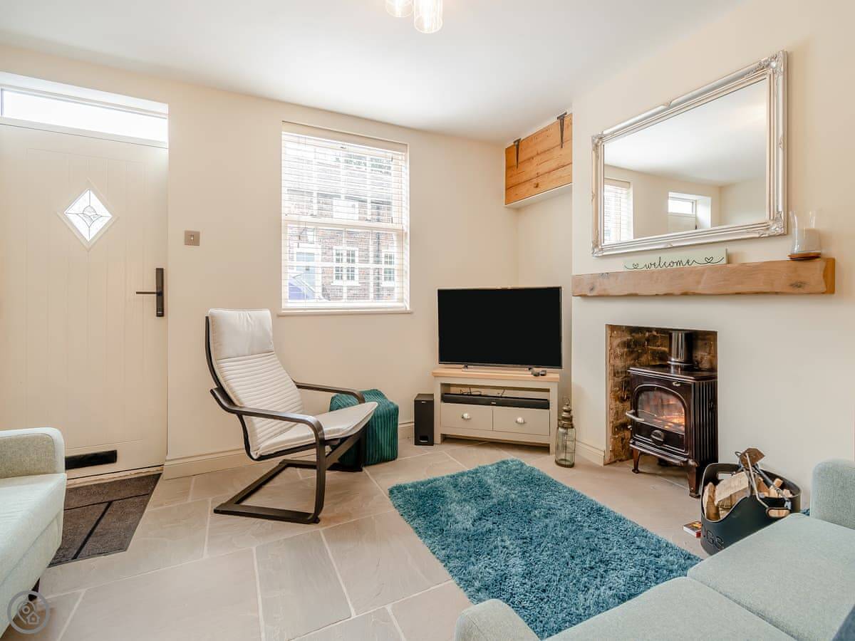 Downstairs, there's a living room with a wood burner. We provide the first basket of logs. The kitchen is new and has a dishwasher. There's a small boot room off the back for coats and boots. You can store bikes there.