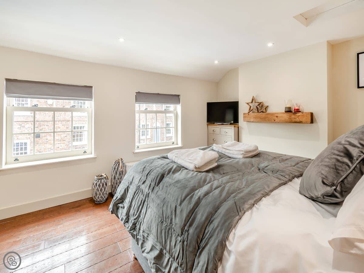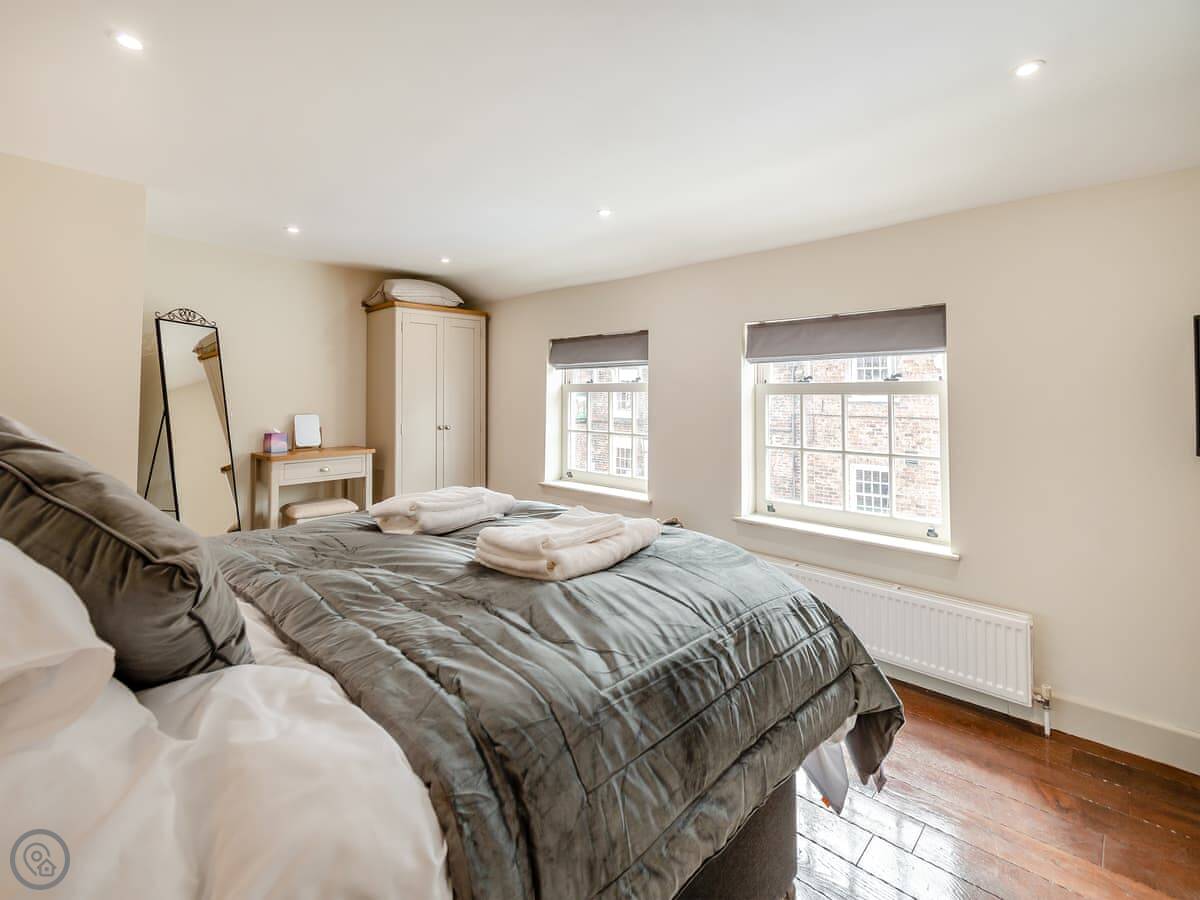 There are two bedrooms. One has a double bed. The other has a kingsize bed that can be split into two singles if you ask beforehand. There's one shower room upstairs.