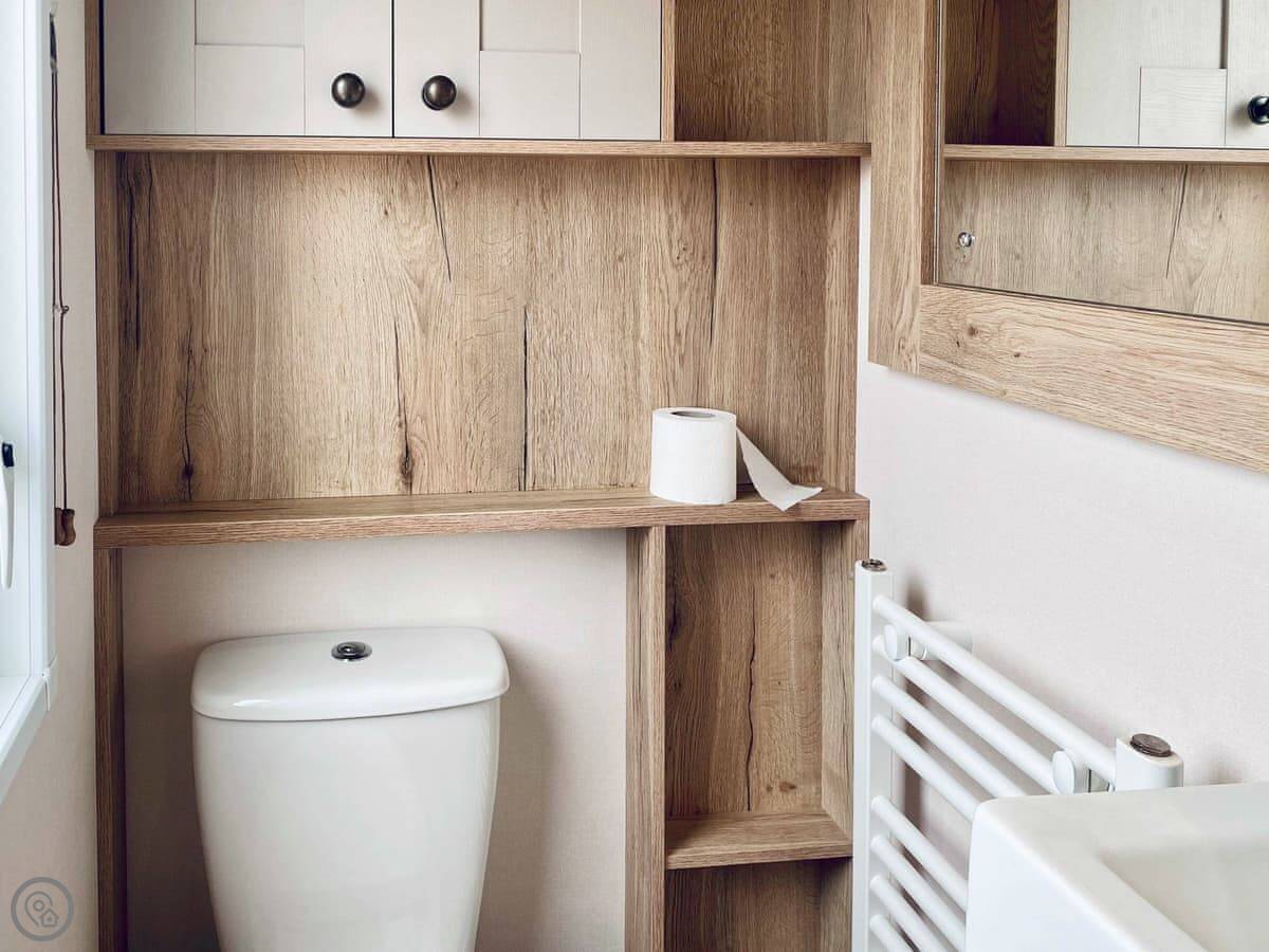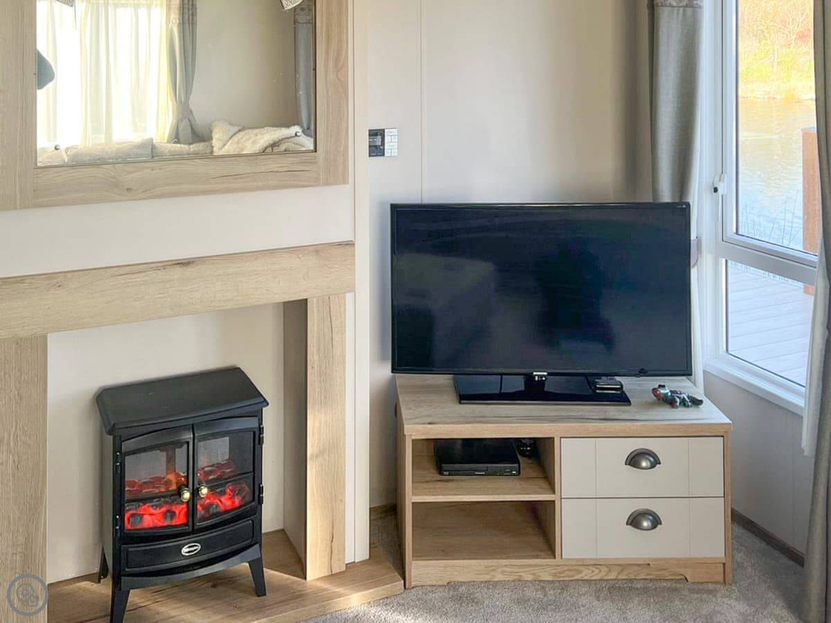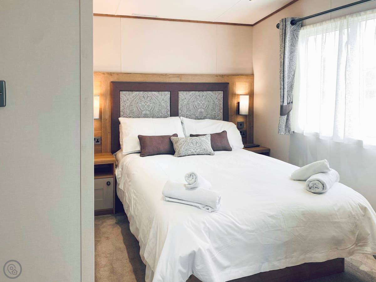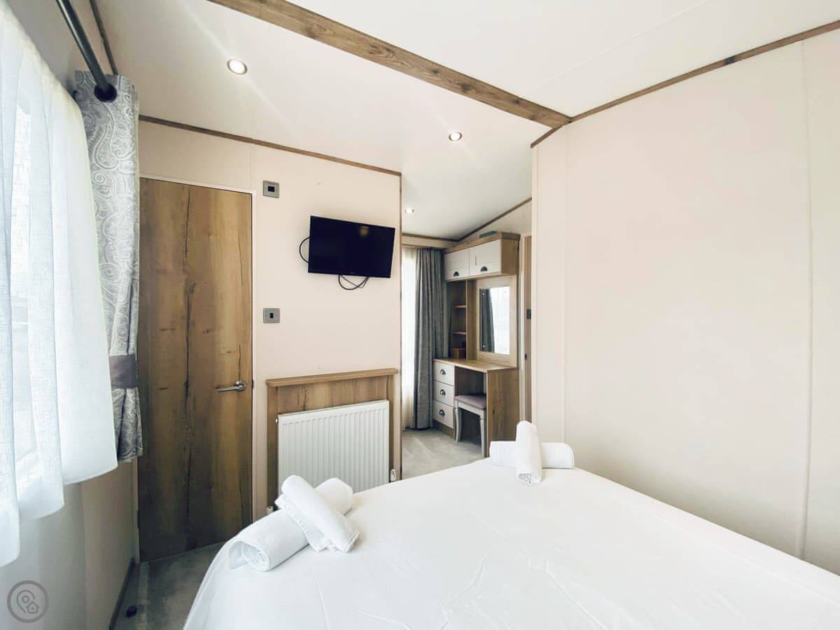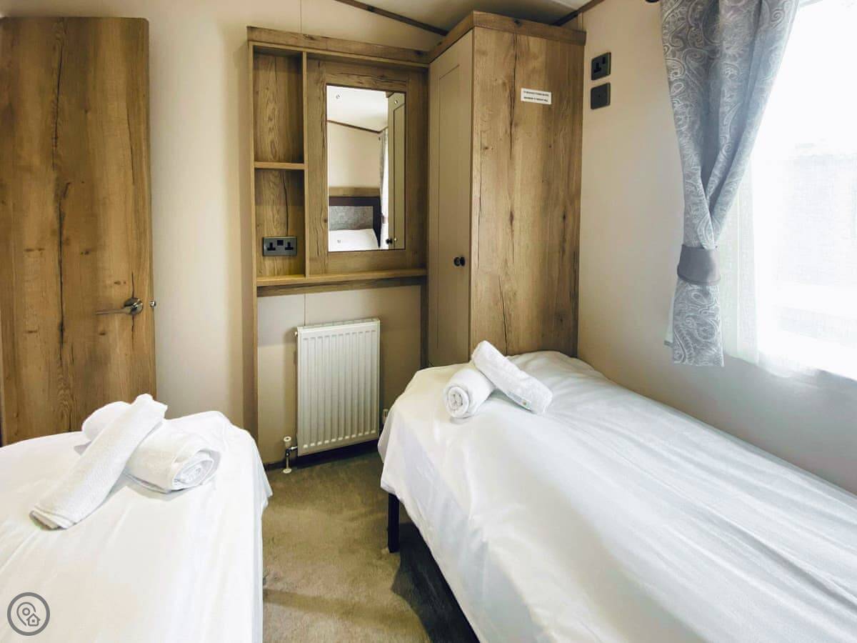 It sleeps six. Three bedrooms, one bathroom. It's got a 5 Star rating, which means it's modern and well-equipped for a static. Everything you'd need is included, like bedding and towels. There's WiFi and parking right outside.