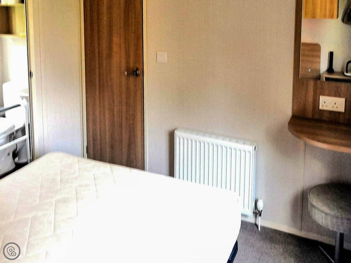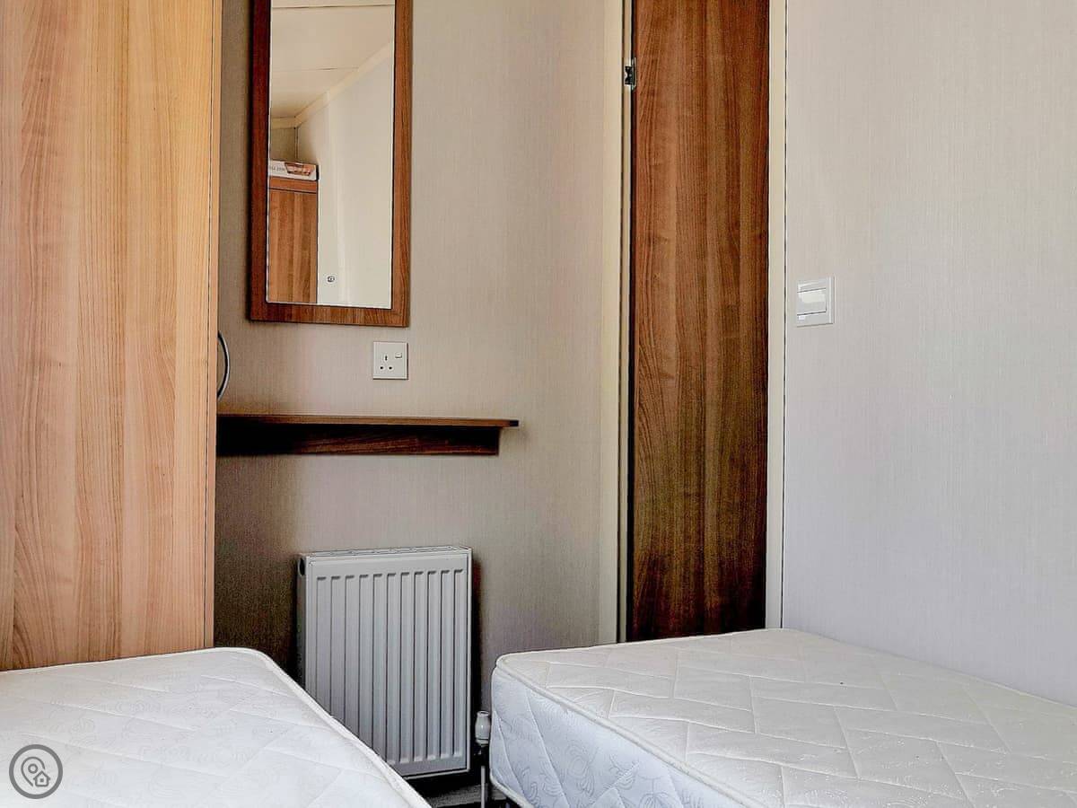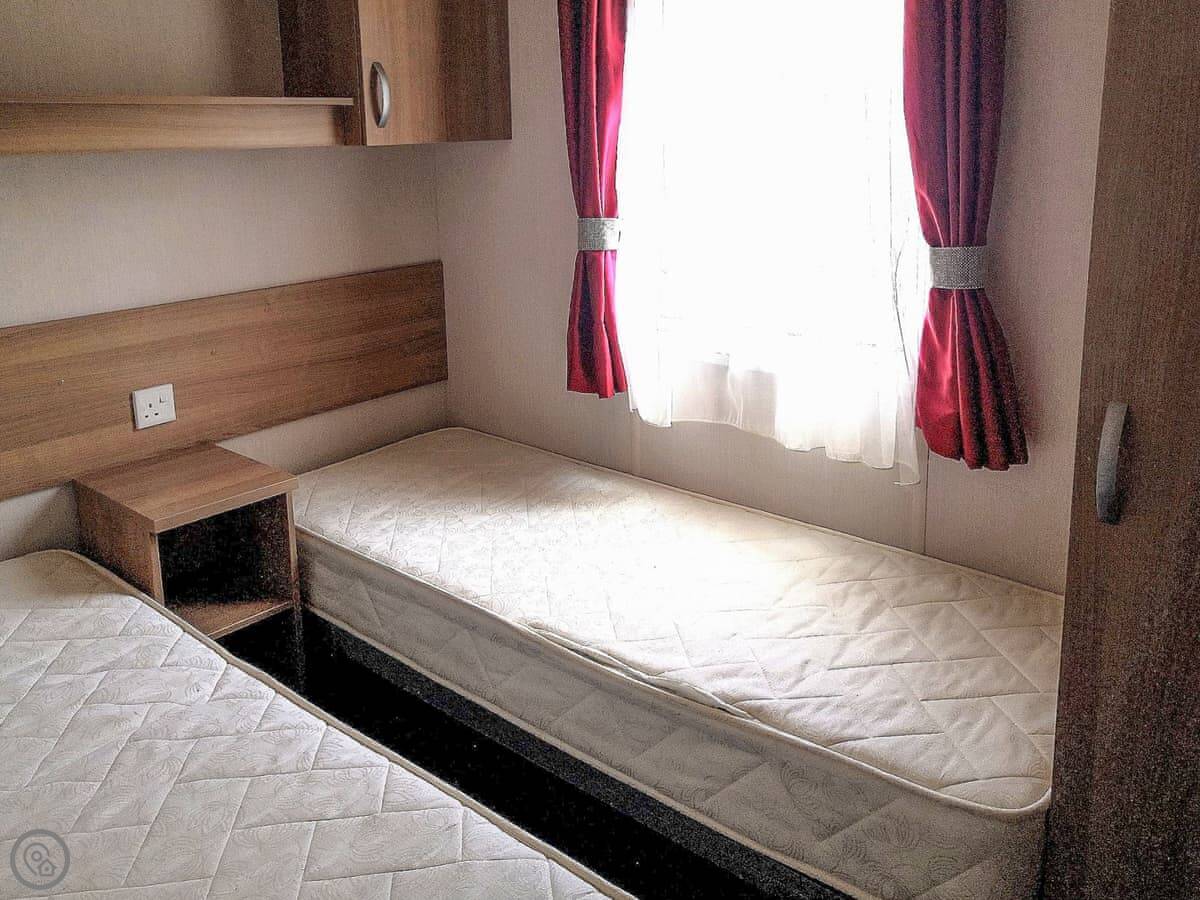 It sleeps six, which is a lot for two bedrooms. One's a double, the other has four singles in it. One bathroom with a shower. It's got a 4 Star rating. It's clean and modern, but it's still a caravan, so the space is what you'd expect.