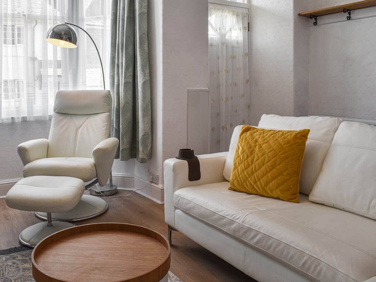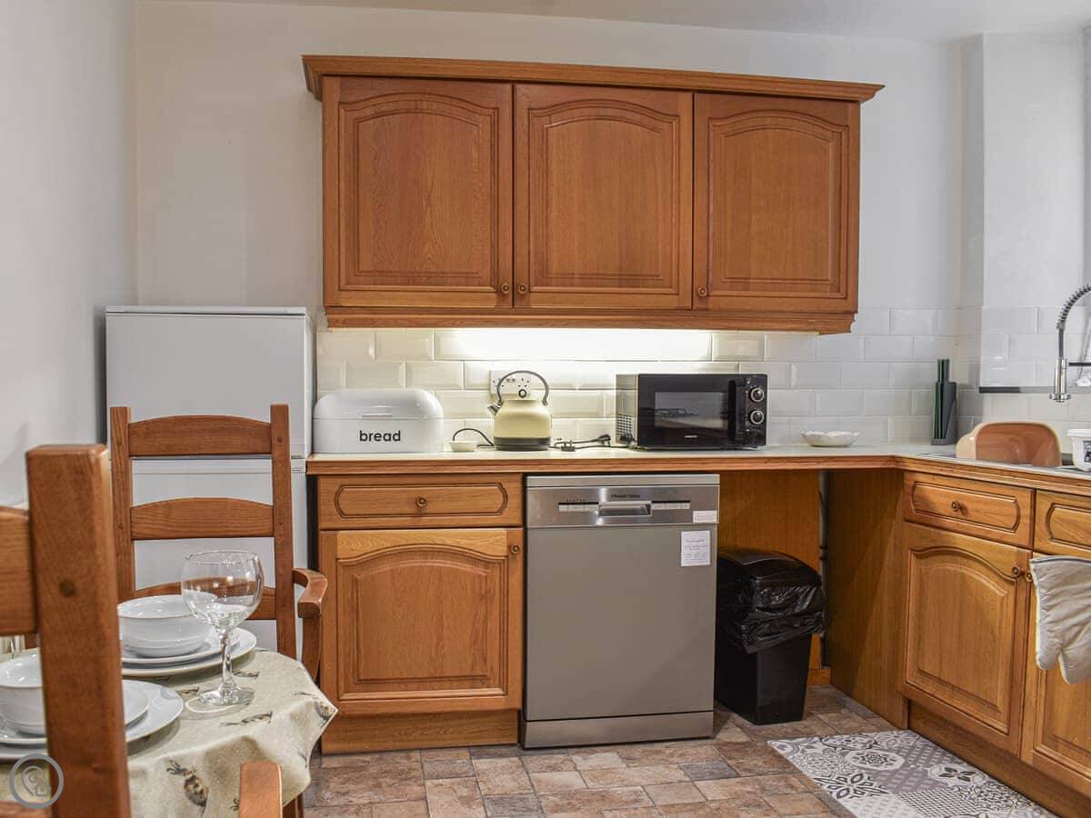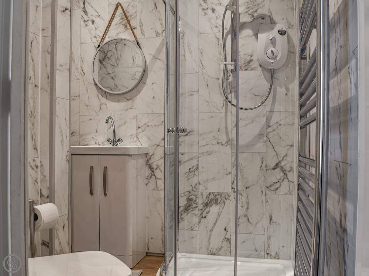 It's set over three floors. You come in on the middle floor to the living room. The kitchen is downstairs, which some people find odd, but it works. It's got everything you need. There's a bathroom on that floor too, with a bath and shower. Two bedrooms and another bathroom with a walk-in shower are upstairs.